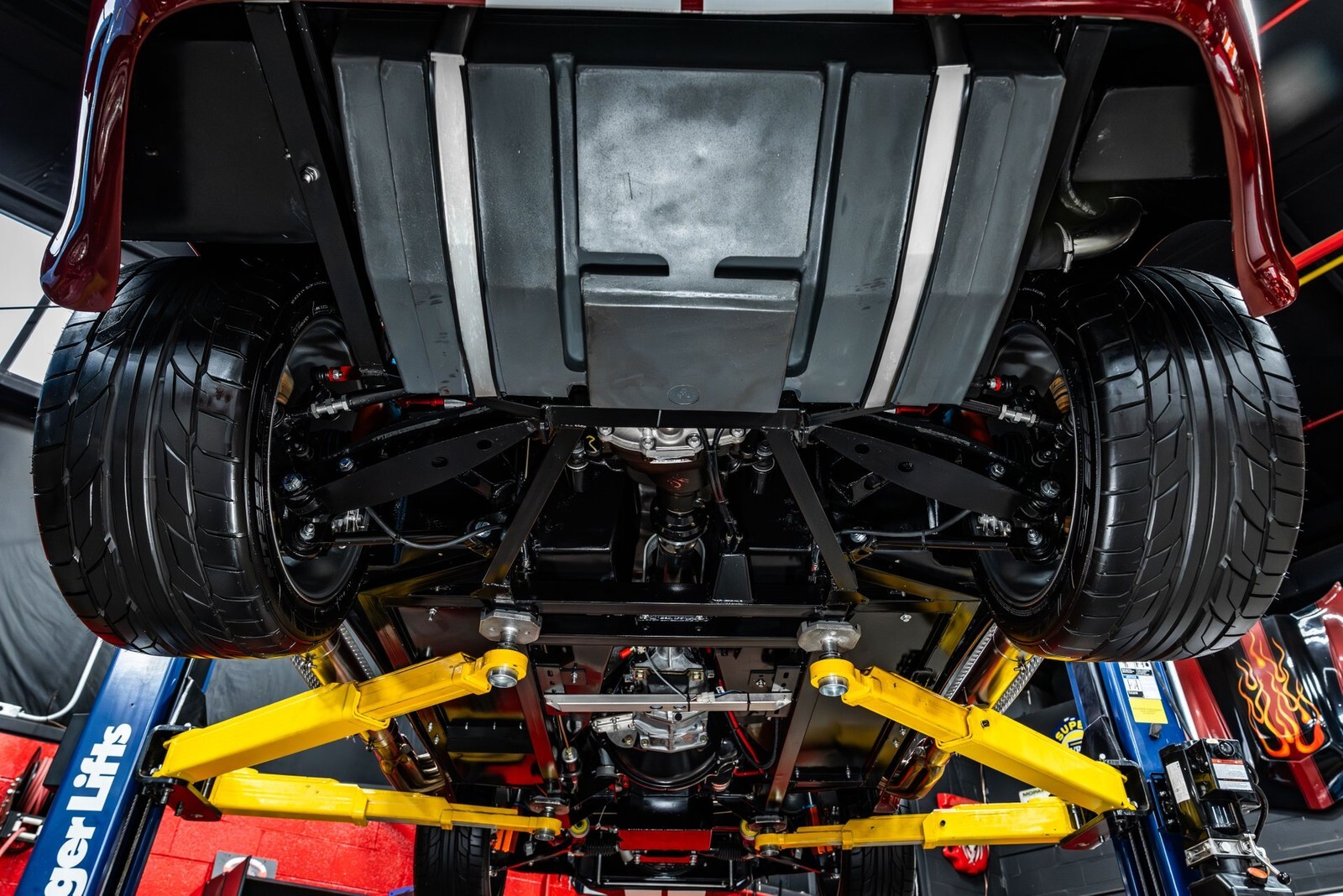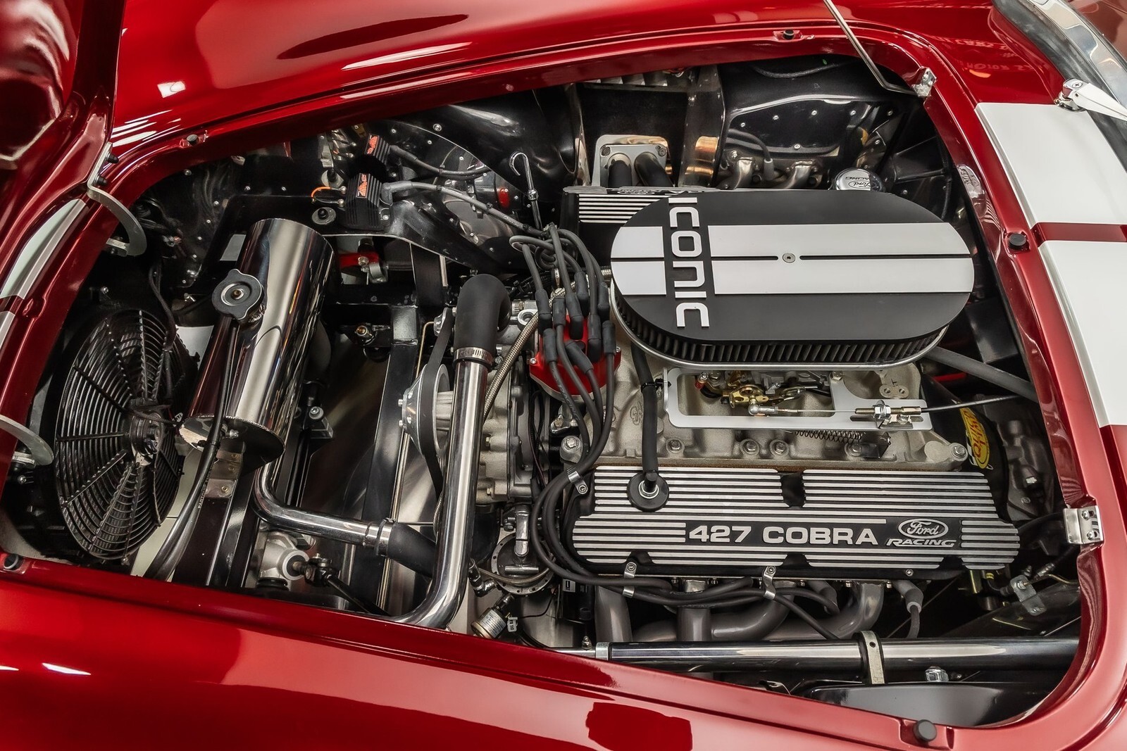 Under the forward-opening hood sits a Iconic 427ci Stroker V8 Engine with a Holley Four Barrel Carburetor! Power is sent to the rear tires through a Tremec 5 Speed Manual Transmission and a Ford 8.8 Rear End with approximately 3.55:1 Gears! This Cobra is equipped with Manual Rack and Pinion Steering and Power Brakes! The underside of this '65 looks brand new like the rest of the car! Take a look underneath to see the nice condition of the Painted Frame, Crossmember, Four Wheel Disc Brakes, New Fuel Tank and Independent Adjustable Suspension!