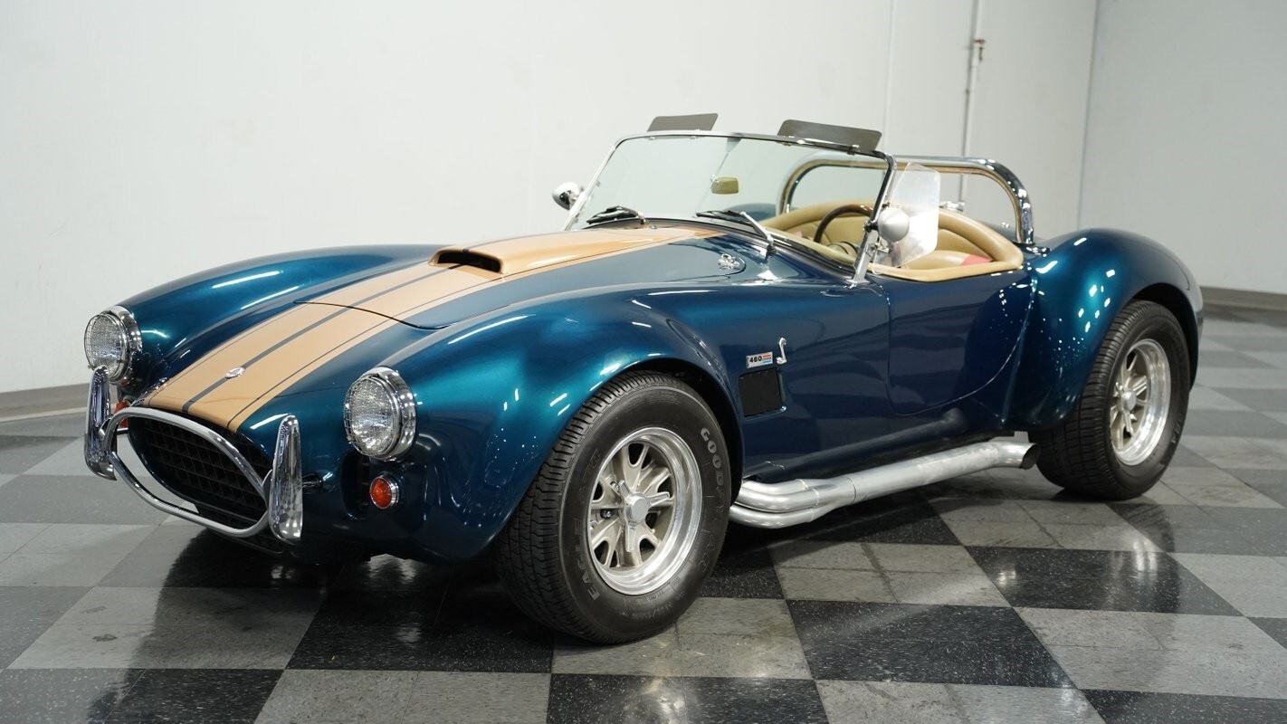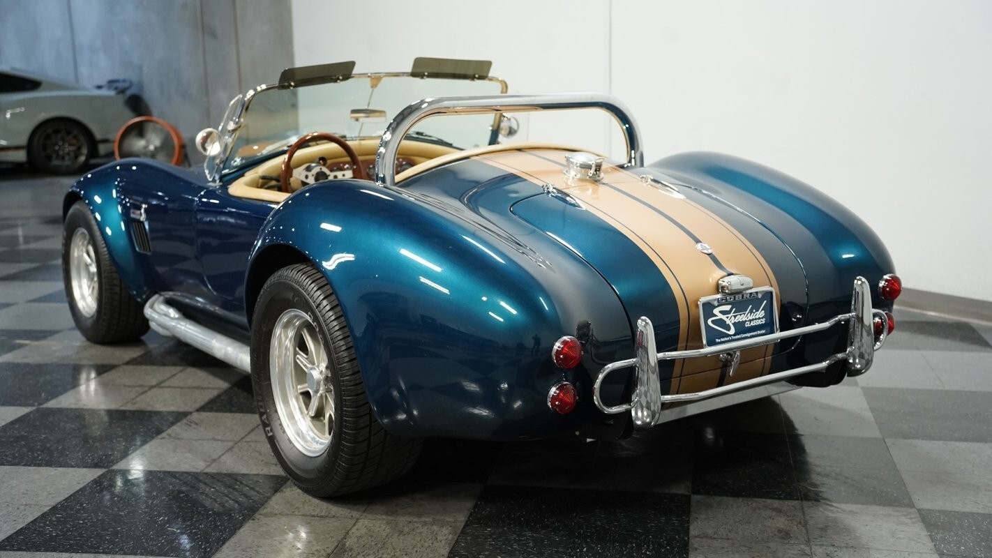 Among the rarest configurations you'll find, automatic transmission Cobras make up only a tiny percentage of these iconic roadsters. Emerald Green paint with tan stripes gives this 1965 Shelby Cobra West Coast a distinct look that separates it from typical replicas. The exterior features aluminum mirrors complementing the sleek lines, while a double-width roll bar adds both structural support and visual interest. The wheels measure 15" in front and 16" in rear, wrapped with 255/60R15 front and 295/50R16 rear tires creating a perfect stance that balances aesthetics with traction.