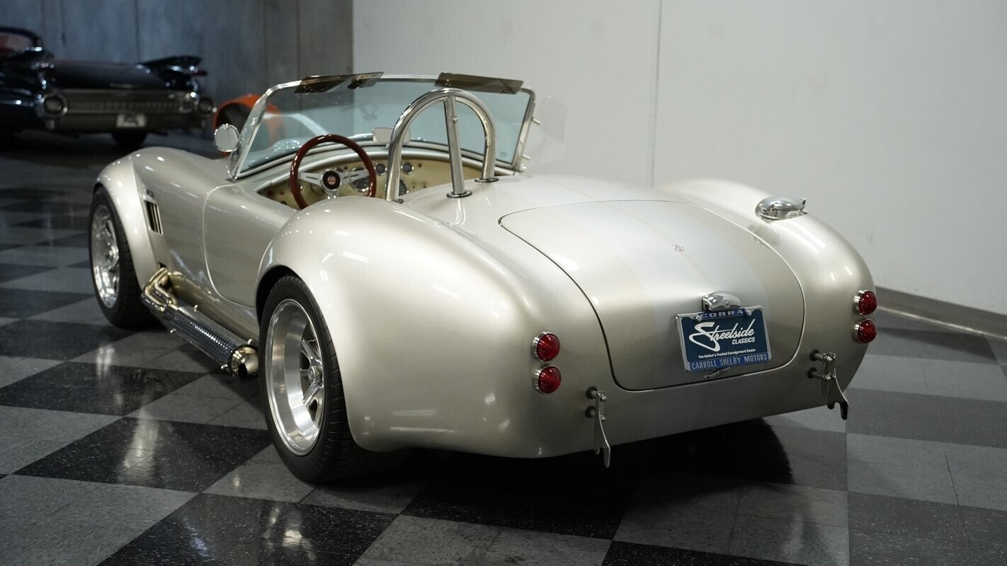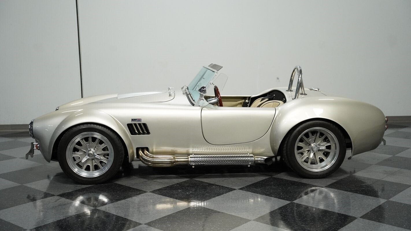 The Roush 427 R V8 engine gives this Cobra its famous growl, working perfectly with the TREMEC 5-speed manual transmission for quick acceleration. Roush aluminum heads and a Holley carburetor feed through an Edelbrock intake manifold for optimal output across the RPM range. The fully independent suspension uses adjustable coilovers up front with a performance-tuned coil spring, shock, and sway bar setup in back for amazing handling. Four-wheel power disc brakes bring you to a stop quickly, while long tube headers connect to those side pipes for that unmistakable Cobra sound.