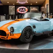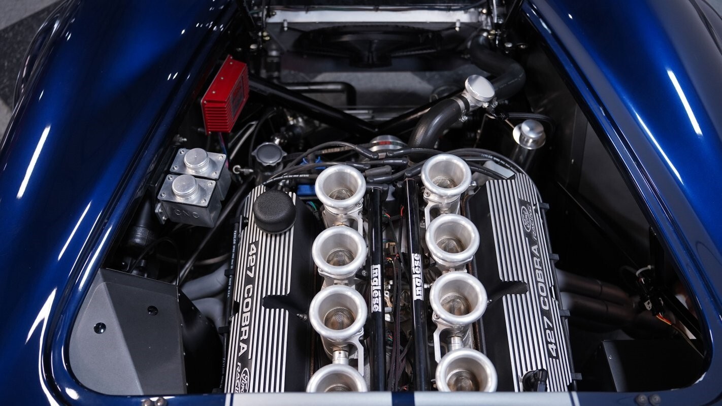 Under that signature front-hinged hood, we find an incredible 427 cubic-inch overhead-valve V-8 engine that began life as a 351 Windsor, bored and stroked to the iconic displacement. Featuring an aesthetically awesome-looking 8-stack FAST EFI intake system, this Dart SHP block is outfitted with Scat H-beam rods, Mahale forged pistons, and a roller-rocker setup. Equipped with an MSD ignition, lightweight RHS aluminum cylinder heads, long-tube headers, and, of course, those stellar side pipes. Power is routed through a Tremec TKO600 five-speed manual transmission, Quicktime bell housing, and a hydraulic Kevlar clutch, which adds a useful overdrive gear compared to Shelby's original car. Seventeen-inch Halibrand-style wheels are shod with Kumho tires measuring 255/40ZR-17 at the front and massive 315/35ZR-17 at the rear.