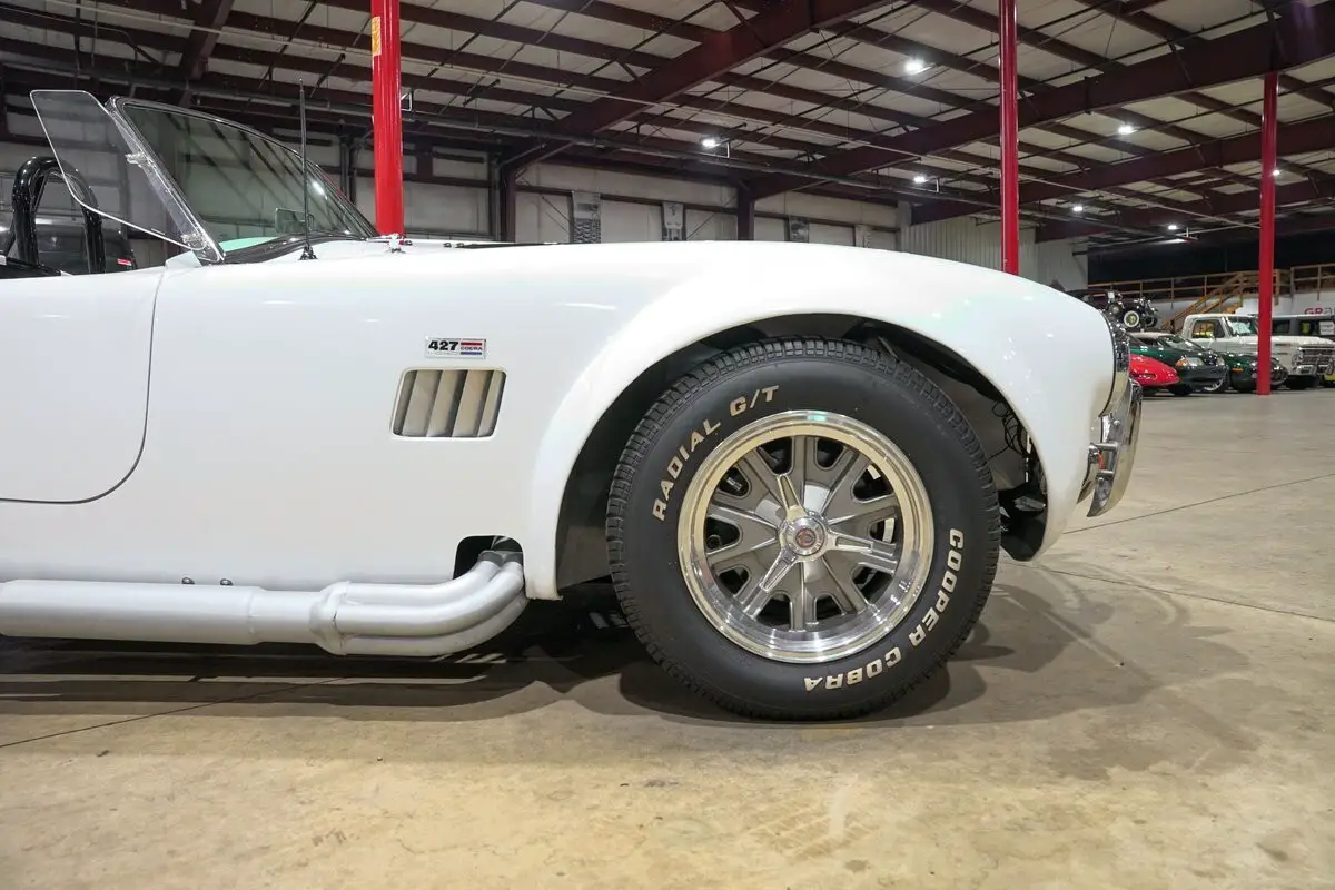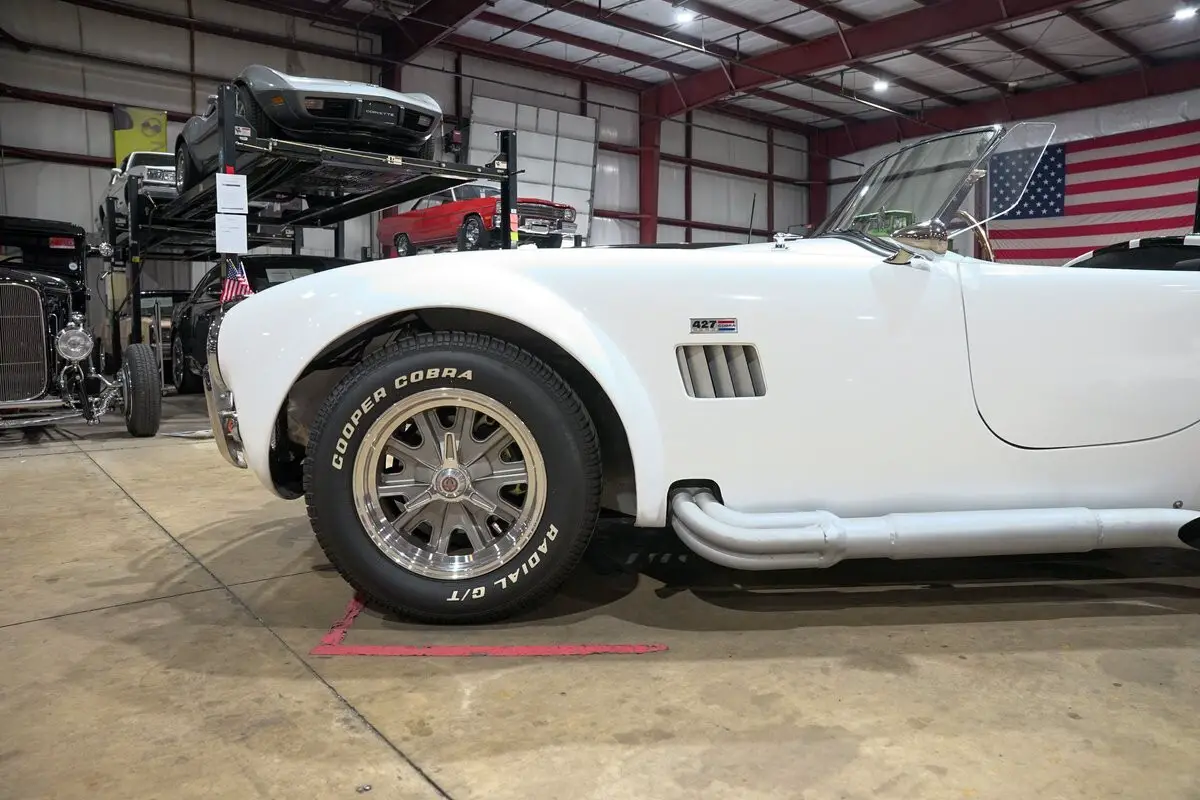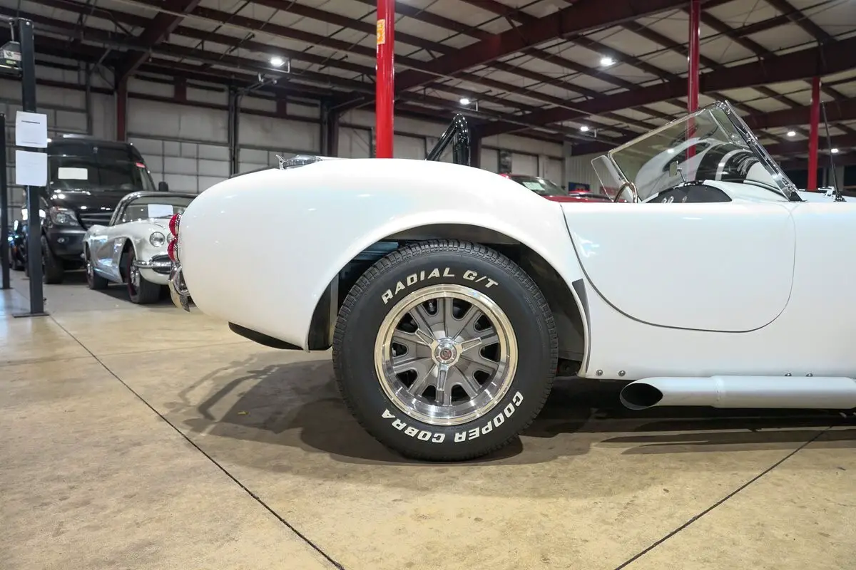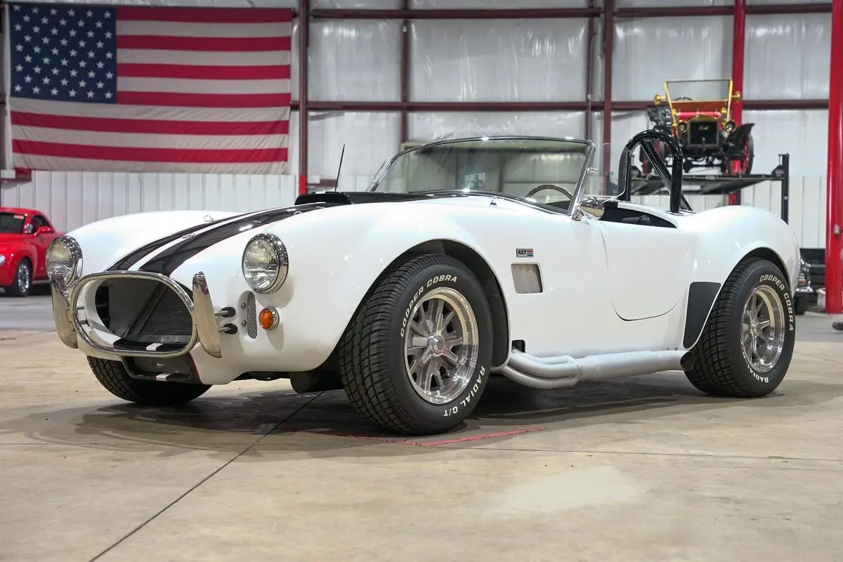 GR Auto Gallery is excited to present this 1965 Shelby Cobra by Factory Five Racing. Finished in an eye-catching white with bold black racing stripes bordered in red, this Cobra instantly commands attention. The side pipes, quick-release hood pins, and blacked out roll bar complete the unmistakable roadster silhouette, while the removable hood and clean detailing make it as functional as it is fierce. The car sits with an aggressive stance that perfectly complements its classic racing look.