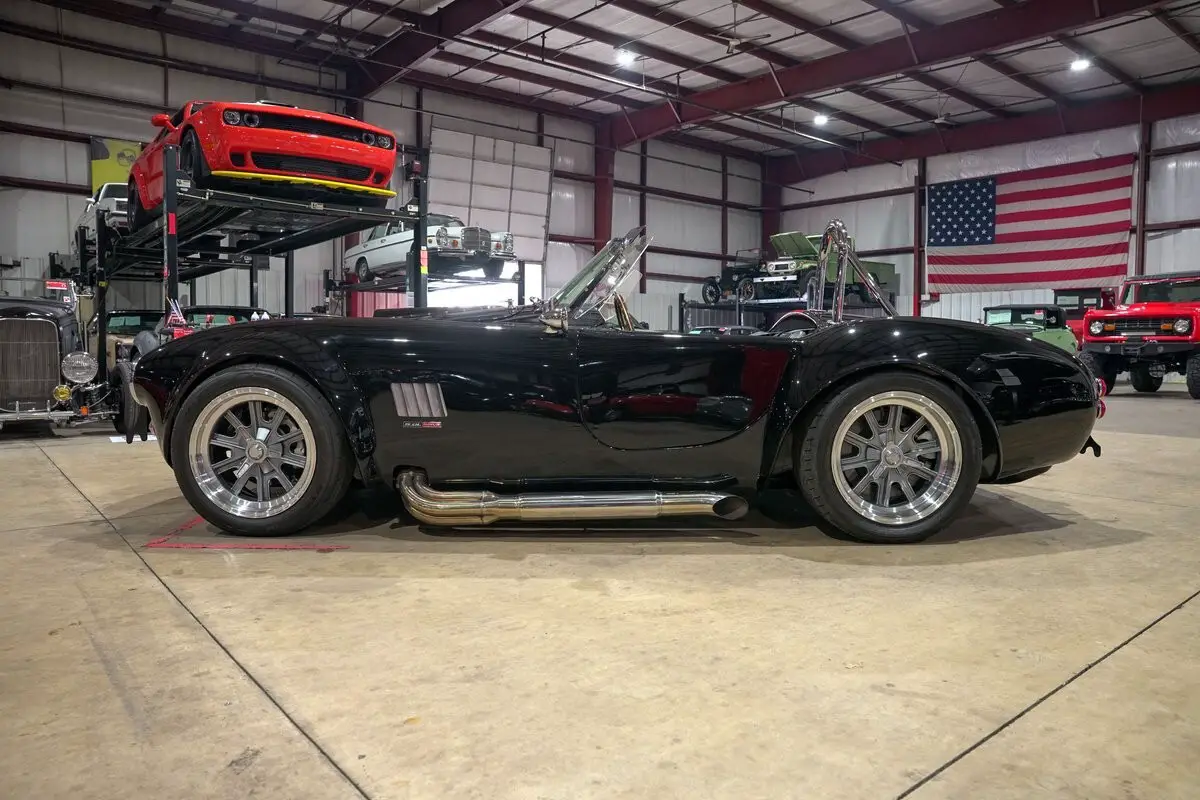GR Auto Gallery is excited to present this 1965 Shelby Cobra Replica finished in a deep black that makes the red racing stripes pop in all the right ways. The stance is pure attitude with knock off style wheels, a chrome roll bar, and side pipes that shimmer down the body like polished steel. It has that classic Cobra shape everyone recognizes instantly, but with a clean modern finish that makes it look even sharper up close.