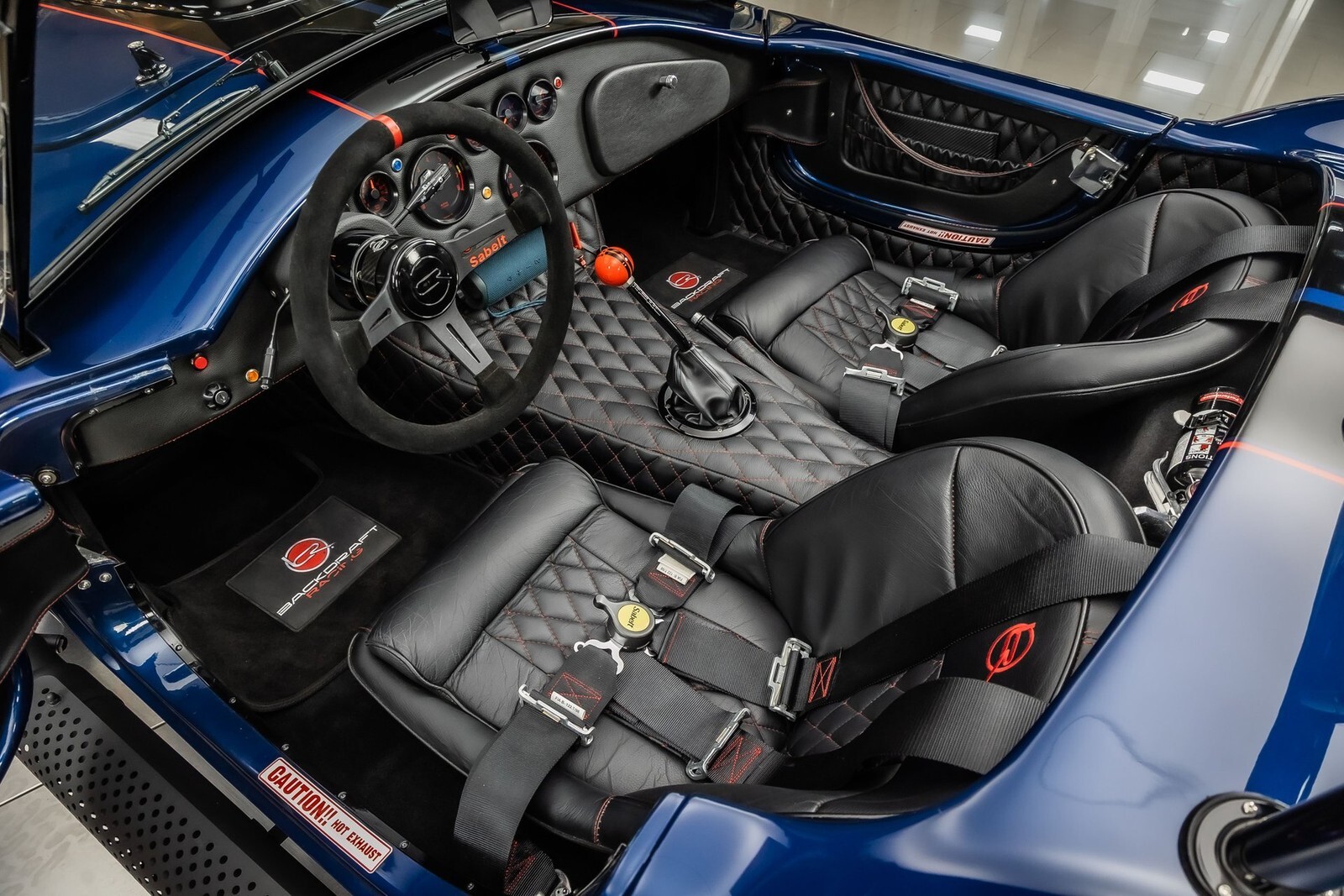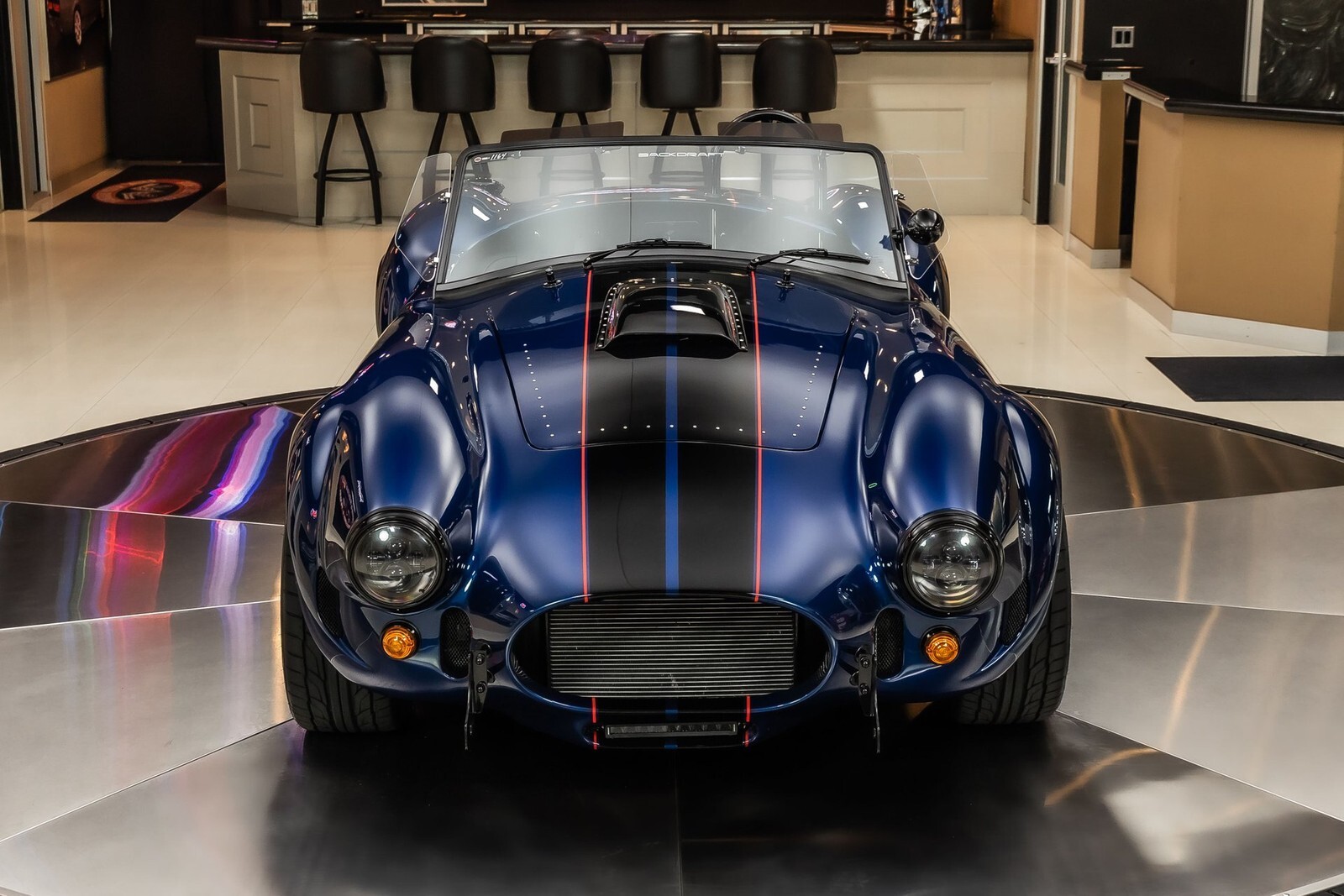 Check out this amazing Backdraft Racing 1965 Shelby Cobra! This Cobra is an RT4 build, and it has less than 300 Miles on it! Take a look at the Dark Blue Exterior Paint with Black Stripes, Fiberglass Body, 18' Knock - Off Style Black Wheels, Scooped Hood, Front Fender Vents, Driver Side Blacked out Roll Bar, Quick-Jack Bumpers, LeMans Style Fuel Fill and the Blacked out Steel Side Pipes. Inside, this roadster is sporting a Black Diamond Stitching Leather Interior, Bucket Seating, 3 - Spoke Sabelt Steering Wheel, 4 Point Racing Harness, Big & Tall Package with ample room in the fully Carpeted Trunk for all of your car show essentials!