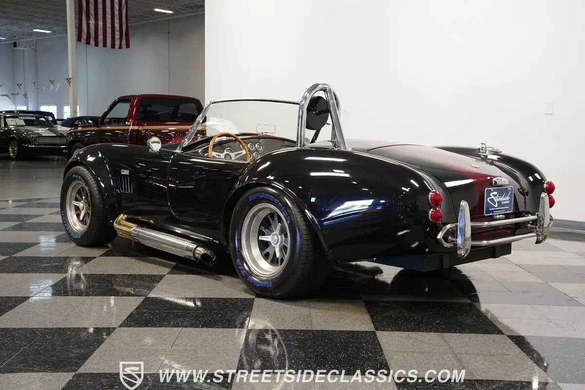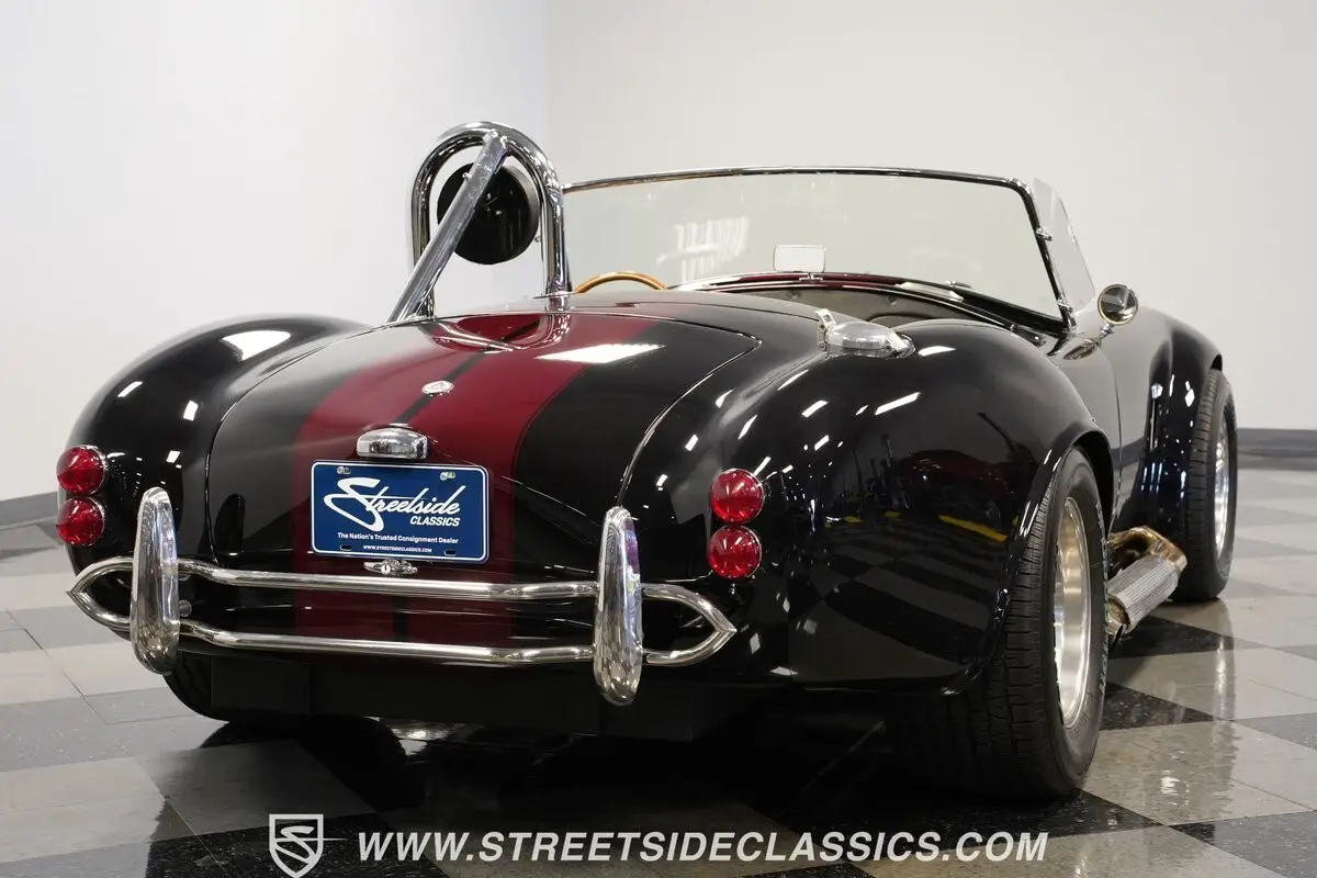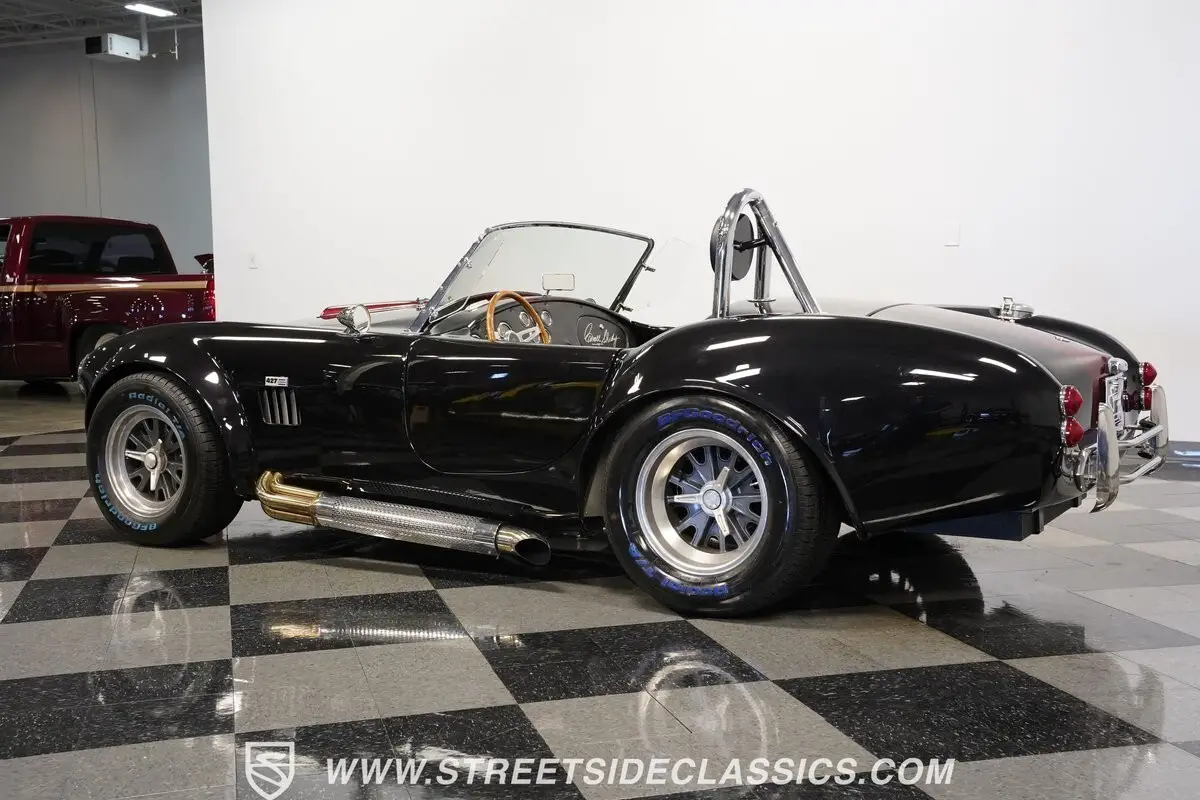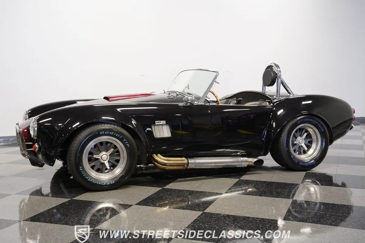 Under that signature front-hinged hood, we find an incredible 427 cubic-inch overhead valve V-8 engine. Featuring an aesthetically awesome-looking 8-stack intake system, this big block also comes equipped with an MSD ignition, lightweight Edelbrock Performer RPM aluminum cylinder heads, long-tube headers, and, of course, those stellar side pipes. Power is routed through a five-speed manual transmission, which adds a useful overdrive gear compared to Shebly's original car. Fifteen-inch knock-off-style wheels are shod with BFGoodrich tires measuring P235/60R-15 at the front and wider P295/50R-15 at the rear.