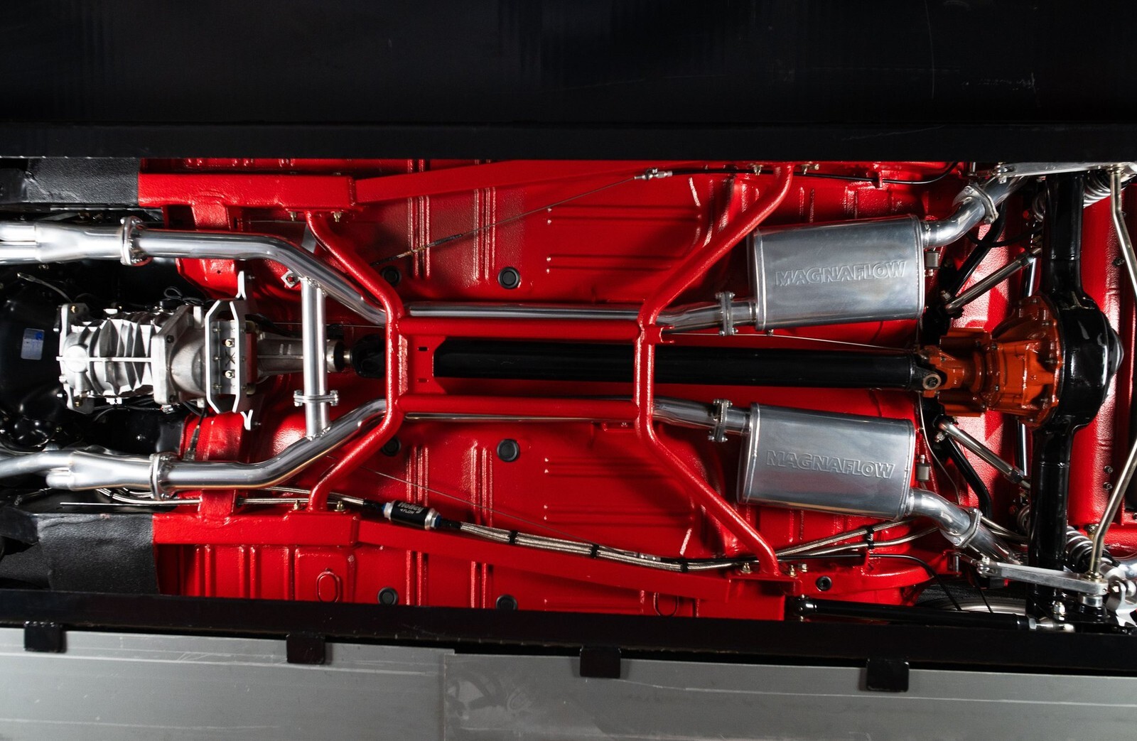 Underneath, features a reinforced chassis with subframe connectors, roll bar, and added bracing for torsional rigidity. Coilover front suspension, 4-link rear, 9-inch Ford rear end, and rack-and-pinion steering deliver precise handling. Wilwood disc brakes provide serious stopping power, and the epoxy-coated underside ensures durability, corrosion protection, and reduced road noise-performance and craftsmanship from top to bottom.