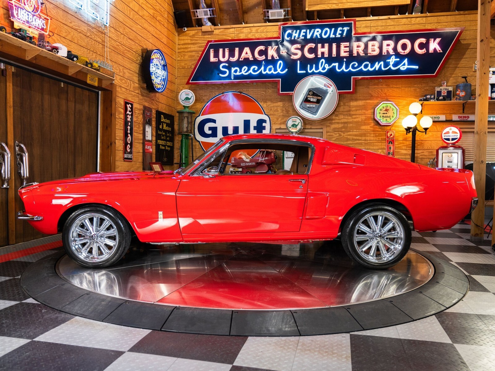 The interior reflects luxury and performance-focused craftsmanship: every panel is seam-sealed and painted, with Dynamat for comfort and noise control. A custom leather interior pairs with a Classic Instruments gauge panel, suede headliner and a Kenwood audio system.
