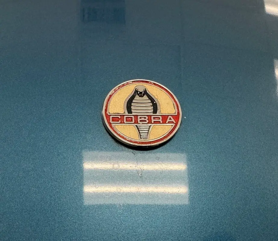In 1984, the car was repainted in Guardsman Blue. Notably, this is believed to be the first car to wear the final style small, round Cobra badges and there's one on the nose of the car as well as the decklid and both show appropriate patina. Tubular chrome bumpers bookend the car and when it was advertised for sale in 1970, it was the first mention of the chrome roll bar. Up front are 15x6.5-inch six spoke Halibrand wheels and in back, 15x7.5-inch GT40 Halibrand wheels tucked under the subtly flared fenders. A hood scoop, latches, and a racing fuel cap rise from the body while the windshield wears wind wings and visors. On the fenders, epic side vents are topped with the familiar Ford emblems which also shows fading and tabs run along the rear deck for the accessory hardtop which is black and comes with the car. The Cobra presents in unrestored condition and imperfections include various bubbles, chips, and scratches in the paint, the lower air intake fiberglass scoop is broken, and drip staining on rear fender.