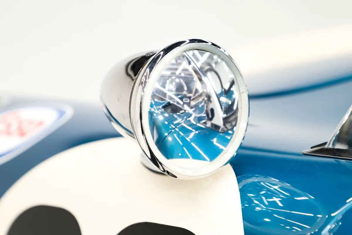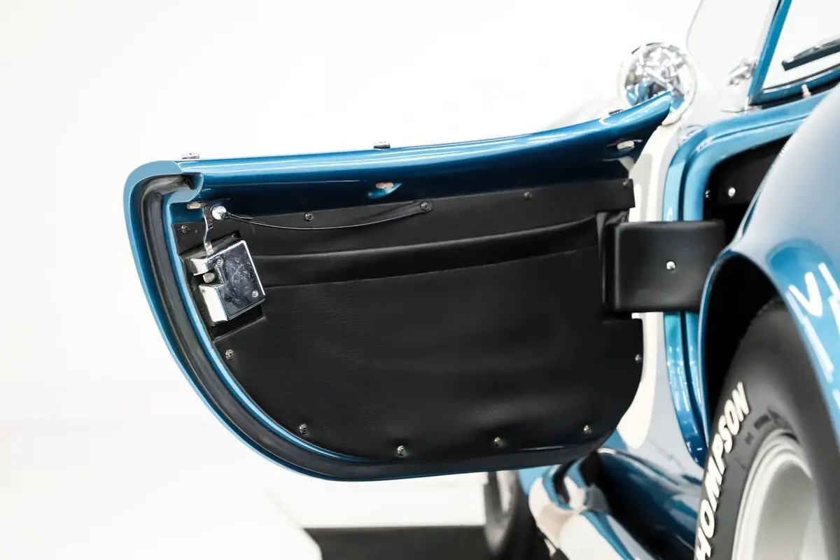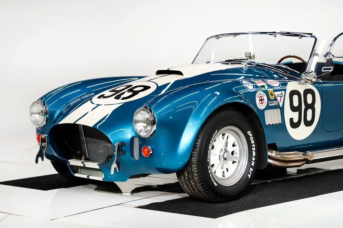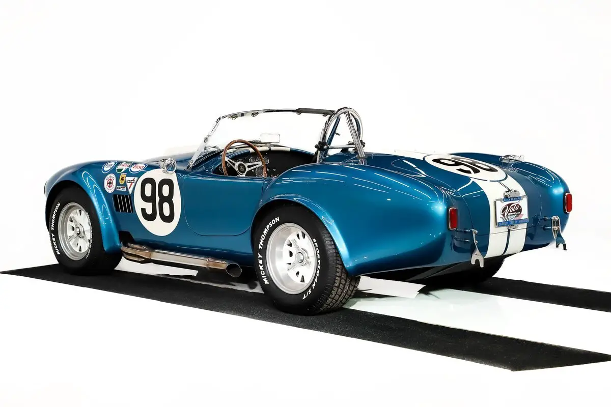 EXTERIOR: At first glance, you'd be hard-pressed to tell this car from an original-it was built using exact dimensions and correct trim pieces throughout. The body is in excellent condition; after a thorough inspection, I found no damage or stress cracking, and everything fits exactly as it should. The repaint in stunning Guardsman Blue Metallic is beautifully executed, with a deep, glossy clear coat that's been fully polished. The racing stripes and Shelby number 98 are painted on-not decals-and are smooth to the touch. Only the tiniest rock chips can be found if you look closely around the front end. Vintage-style racing decals add period flair, while the chrome sparkles throughout. Details include quick-jack bumpers, a pop-up racing-style functional gas cap, a roll-bar hoop, wing windows, and windshield tint visors. This one is equipped with a full convertible top and side windows which you don't see too often. The car rides on correct-style spinner knock-off wheels-complete with safety wire-wrapped in wide Mickey Thompson performance tires out back, giving it an aggressive, race-ready stance.