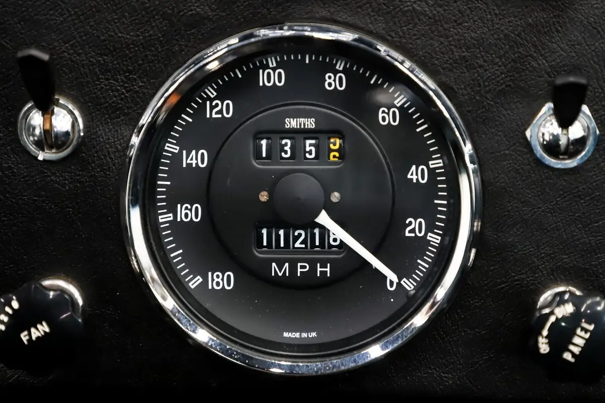 INTERIOR: The interior is just as impressive as the exterior, featuring an authentic, period-correct appearance right down to the proper knobs, toggle switches, and Smiths gauges. It is fully carpeted and presents like new throughout. Both door panels are equipped with map pockets and leather door-pull straps, staying true to the original design. The seats are upholstered in genuine leather and paired with racing-style seat belts that hold you firmly in place. An original-style shifter maintains the correct look, even though it operates a modern 5-speed transmission. Additional details include a chrome emergency brake handle and a wood-rimmed, three-spoke Shelby steering wheel. A discreet 12-volt receptacle has been added under the dash for convenient phone charging without detracting from the car's vintage appearance.
