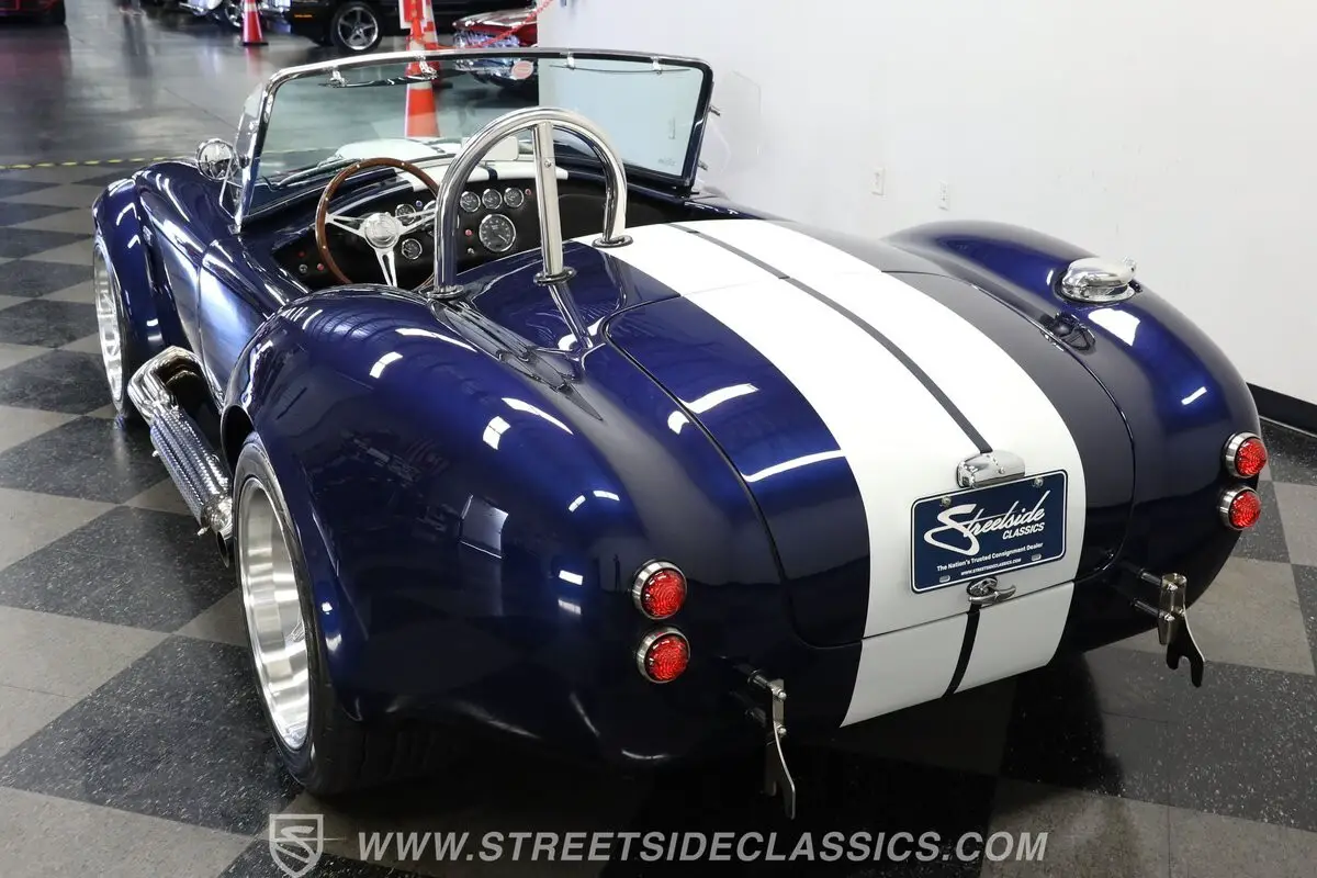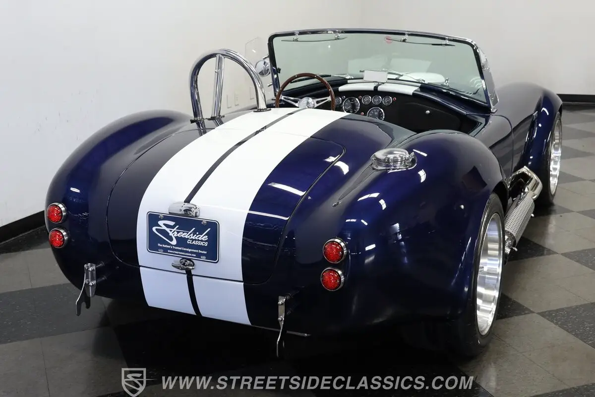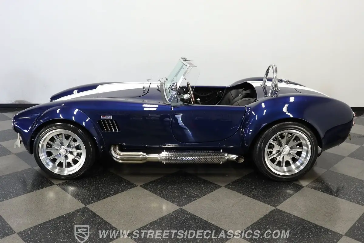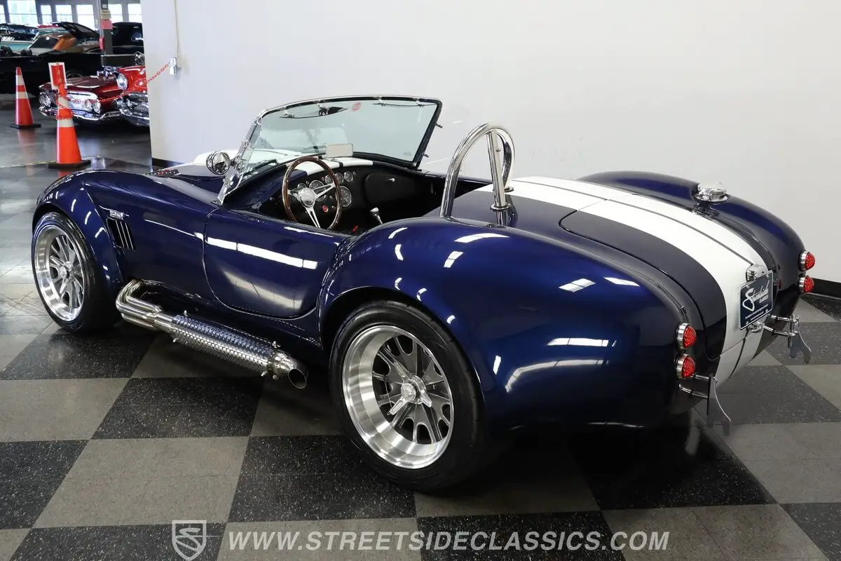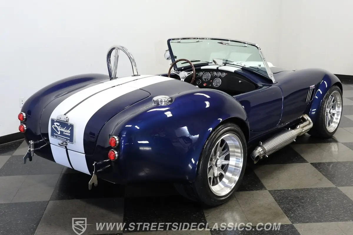 The fiberglass body is mounted to a reinforced steel box frame and is finished in Indigo Blue with Wimbledon White center stripes. Exterior details include a hood scoop, fender vents, and wind wings in addition to a single roll hoop, a Raydot-style mirror, a LeMans-style fuel filler, quick-jack bumperettes, and side-exit exhaust pipes with perforated heat shields. Real 18-inch knock-off wheels wrapped with Nitto performance tires look excellent and compliment the overall stance of the car nicely. Chrome heat shielding over side pipes shines nicely and is a nice addition to try and protect against leg burns. This Cobra has also been optioned with wiper blades. The 427 badging just above side fender vents lets others know this machine is able go as well as show.