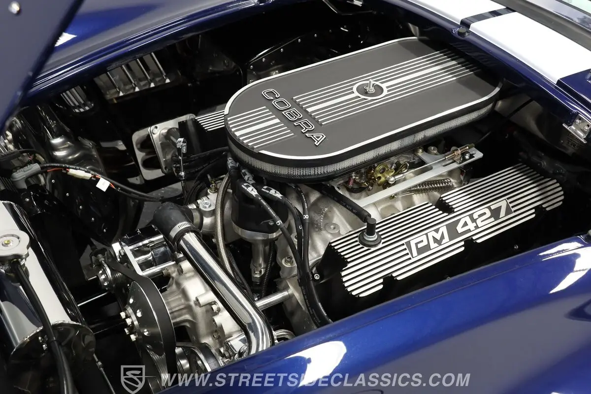 The front-hinged hood opens to reveal a 500 HP Iconic Prestige Motorsports 427ci V8 equipped with a Holley carburetor with an electric choke in addition to an Edelbrock Performer intake manifold, MSD ignition components, aluminum pulleys, ceramic-coated tubular exhaust headers, Cobra air cleaner cover, and PM 427-branded valve covers. Power is delivered to the rear wheels through a Tremec TKO five-speed manual transmission with a QuickTime bellhousing and an 8.8" rear axle. The car is equipped with rack-and-pinion power steering with a KRC reservoir as well as adjustable coilovers and BMW-style four-wheel independent suspension. Stopping power is provided by four-wheel disc brakes.