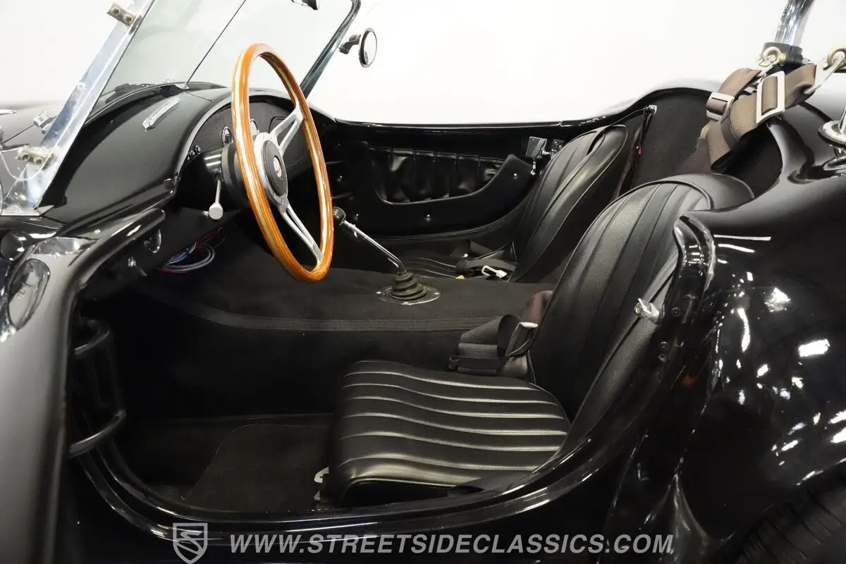 Inside, we find the traditional no-frills Cobra interior. Dual bucket seats are separated by a big transmission tunnel, topped by a signature reverse-angle shifter. A three-spoke, wood-rimmed steering wheel sits ahead of a five-pod VDO gauge cluster that takes up residence center-dash, featuring an 8,000 rpm tachometer and quirky-but-correct Shelby-style reversed 180 mph speedometer, and sharing space with a series of toggle switches and HVAC knobs. Door pockets, racing harnesses, and a driver's roll hoop round out the accoutrements of this speedy Spartan interior.