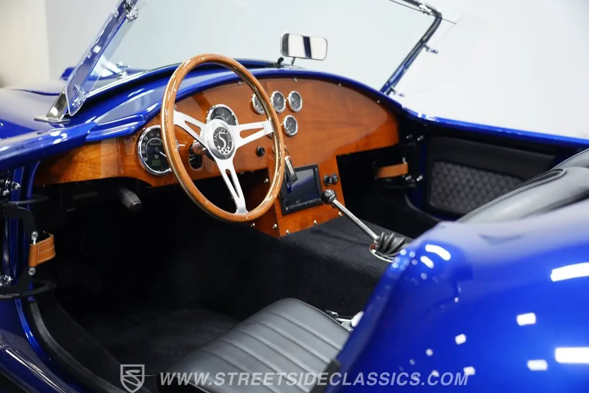 Under the hood, a late-model fuel-injected 4.6-liter V8 engine powers this Shelby Cobra, delivering robust performance backed by power steering and power brakes for confident handling. The engine is paired with a five-speed manual transmission, rebuilt and ready to shift smoothly through the gears, providing an engaging and connected driving experience. Upgraded suspension and large 17-inch black five-star wheels with drilled and slotted disc brakes on all four corners ensure this car handles as impressively as it looks. The factory five-style long tube side pipes add a signature exhaust note that's as thrilling as the car's performance.
