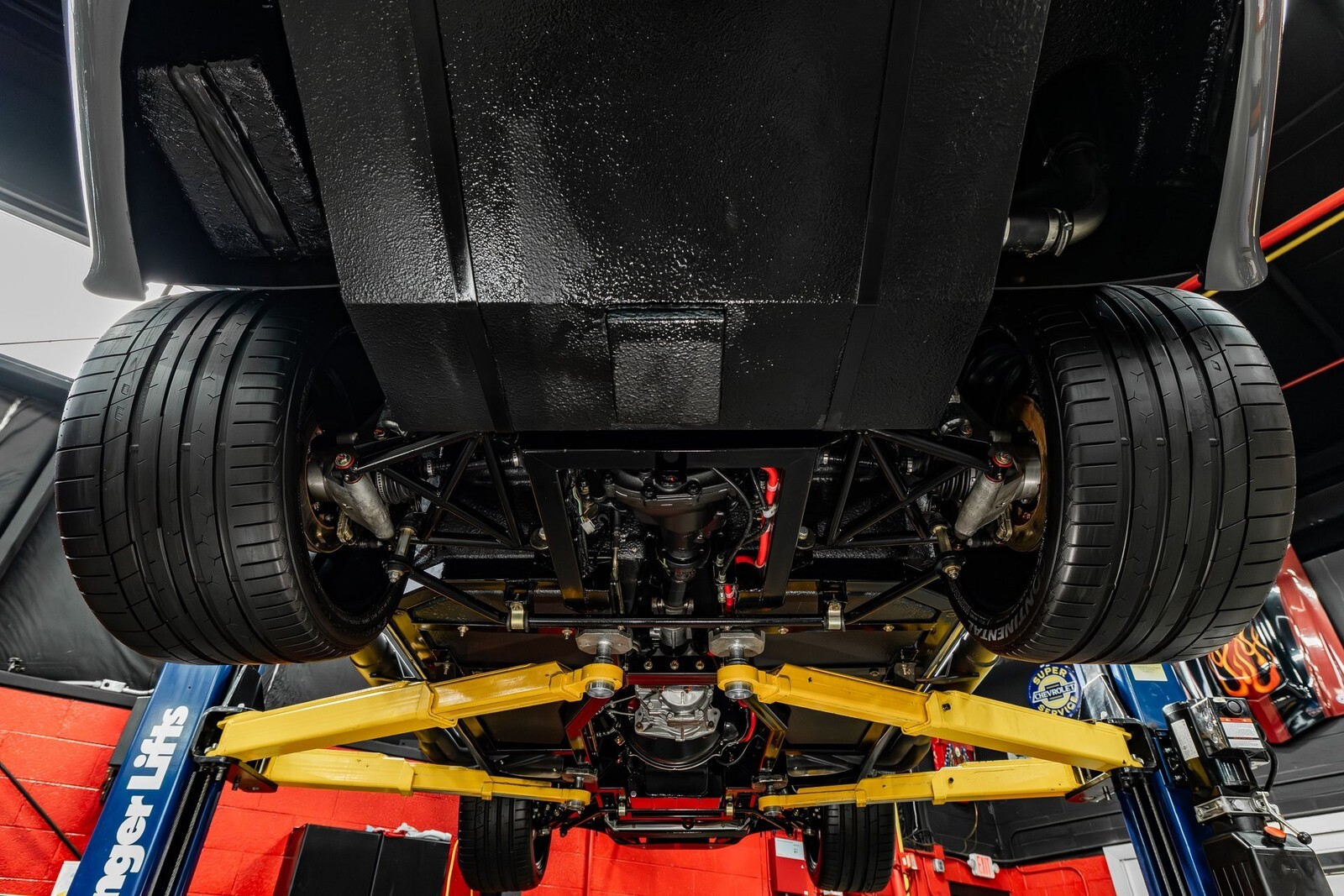 Under the forward-opening hood sits a 427ci Stroker V8 Engine with a Quick Fuel Four Barrel Carburetor Setup making 500Hp. Power is sent to the Road through a Tremec 5 Speed Manual Transmission and an independent 8.8 Rear End with 3.55:1 Gear Ratio! Additional features include, Manual Steering, Power Brakes, Electric Cooling Fans, and a Hydraulic Clutch! The underside of this '65 looks brand new like the rest of the car! Take a look underneath to see the Low Mileage Condition of the Painted Frame, Removable Transmission Crossmember, Black Painted Fuel Tank, and Explosion Proof Bell Housing.