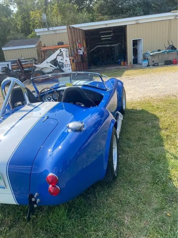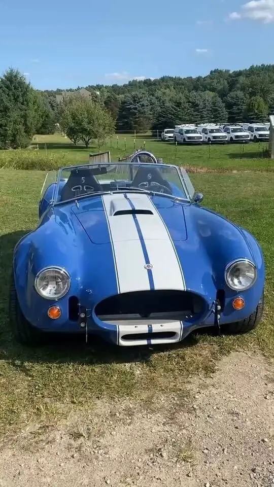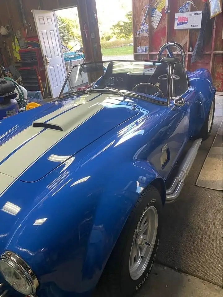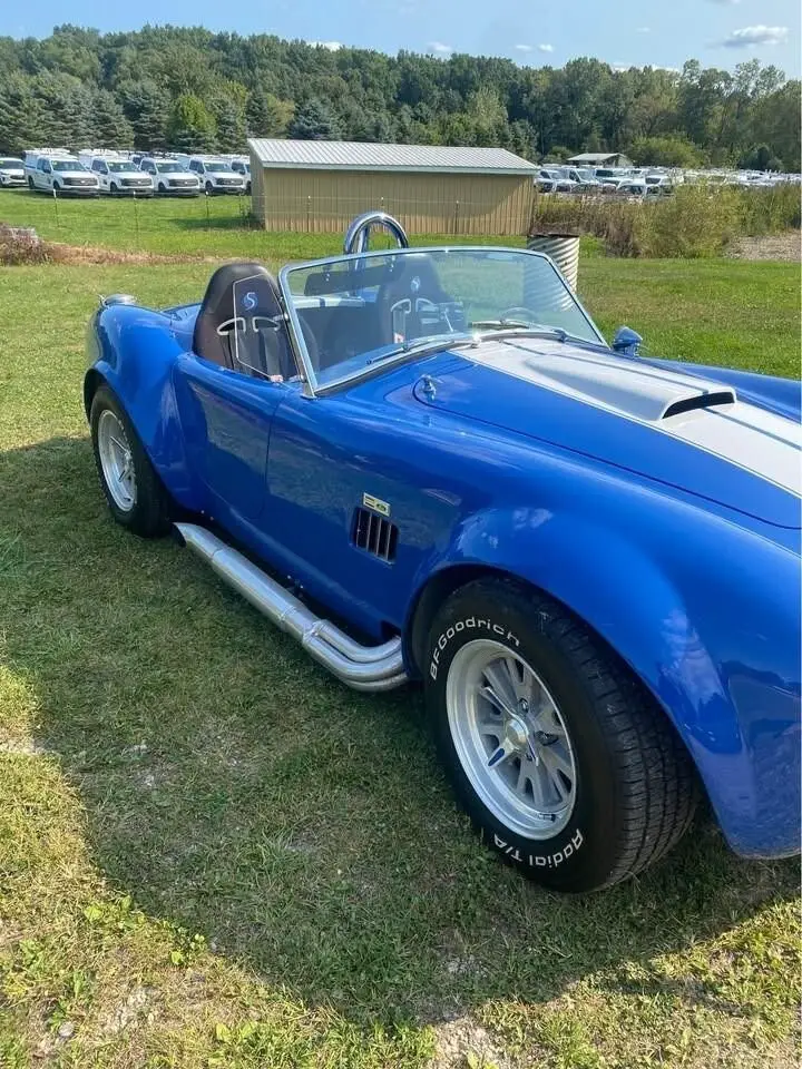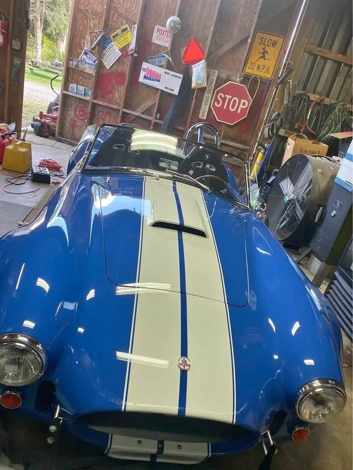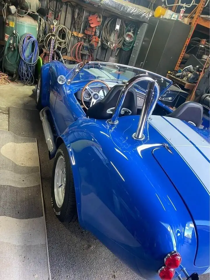 This 1965 AC Cobra Factory Five Kit is a Factory Five kit car powered by a built 5.0L Cobra motor paired with an automatic transmission. It is finished in blue with white stripes and features a black interior. As noted, this Cobra-style build has 3,300 miles showing, with the seller stating the motor has 3,489 miles on it. It has been garage kept and presents as a well-maintained custom build with strong visual appeal. Overall, this Factory Five Cobra is a striking and desirable replica with classic styling and V8 power.