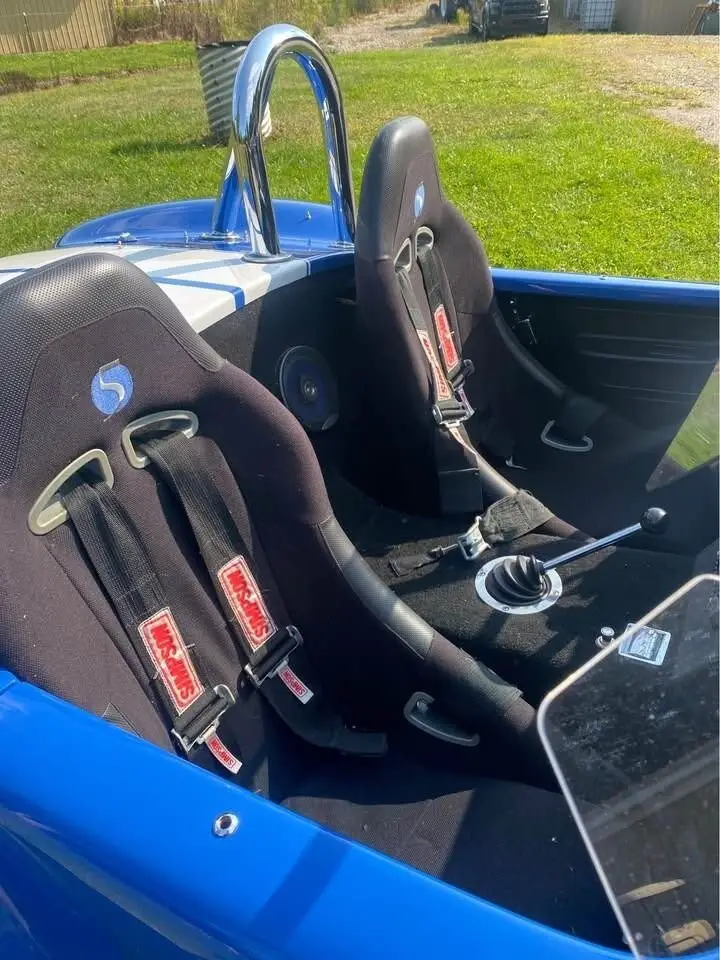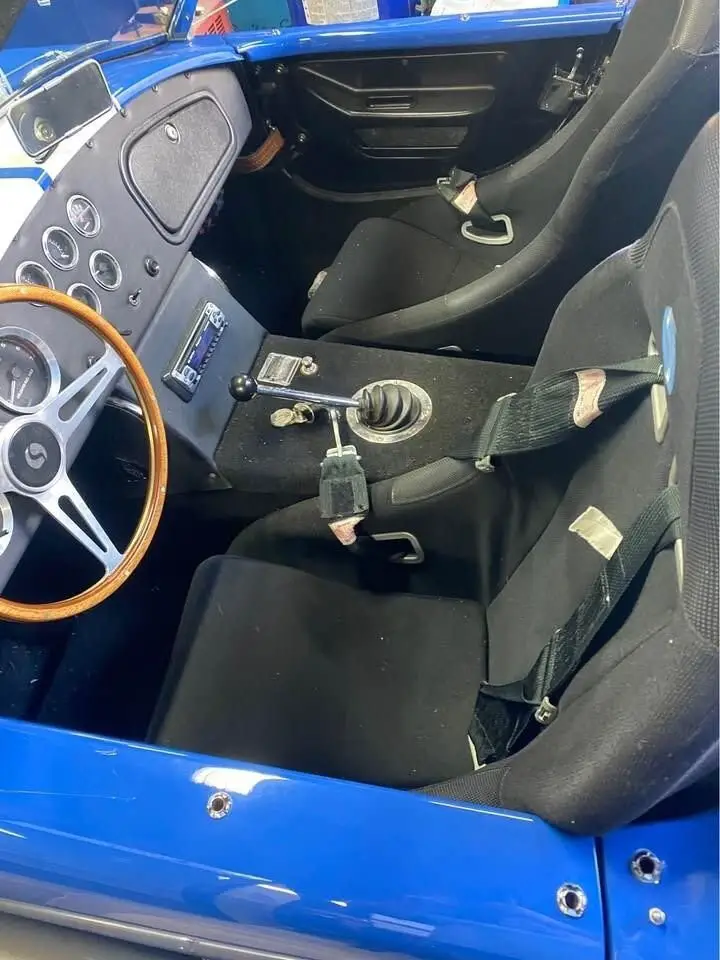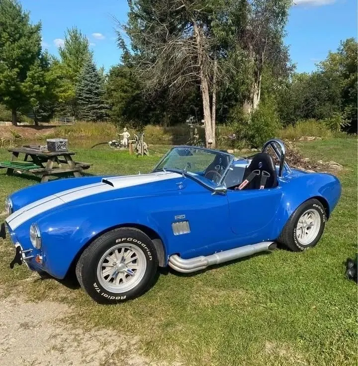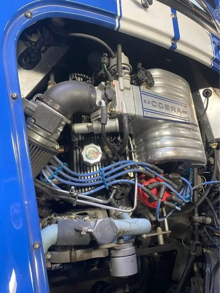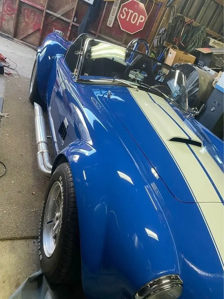 This 1965 AC Cobra Factory Five Kit is a Factory Five kit car powered by a built 5.0L Cobra motor paired with an automatic transmission. It is finished in blue with white stripes and features a black interior. As noted, this Cobra-style build has 3,300 miles showing, with the seller stating the motor has 3,489 miles on it. It has been garage kept and presents as a well-maintained custom build with strong visual appeal. Overall, this Factory Five Cobra is a striking and desirable replica with classic styling and V8 power.