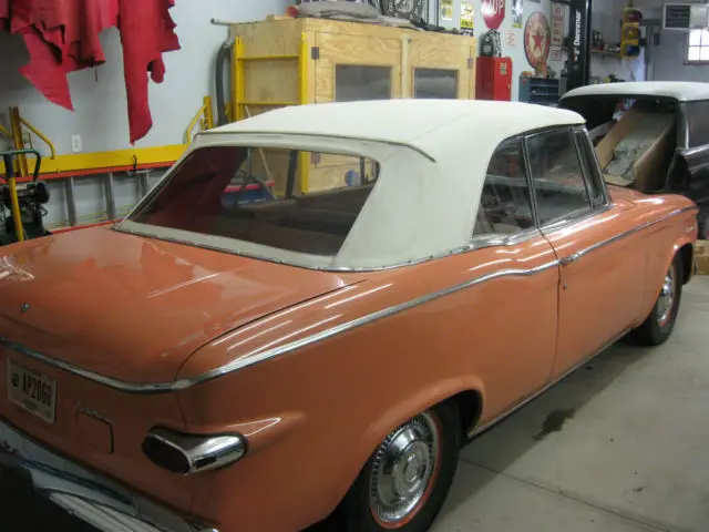Up for your consideration is a 1961 Lark Regal Convertible. 55,340 actual miles. 6 cylinder automatic. Radio am (works)The color is factory. I dont know the correct color name but looks like a sherbet ice cream (factory color).Has had one repaint. Interior is tan brown. Has a fairly new top nice clear rear window. Beautiful chrome.This is one of the most solid Studebaker Larks I have seen. The underside is beautiful with no rust. Couple of small bubbles on right fender bottom.It was an Arizona desert car originally. The Dash is great with no cracks. The seats are very nice. Dual reclining front seats No cracks, tears, etc.The engine runs great. Transmission shifts perfectly. Doesnt leak fluids. Has a dual master cylinder. All lights and gauges work.Newer gas tank. Newer tires. Door panels are fair. Power top works. Has boot for top. Trunk is solid with no signs of any rust.Shipping if needed is up to buyer. I will assist on this end.Any questions email or call 574-220-6828.Thanks for looking.