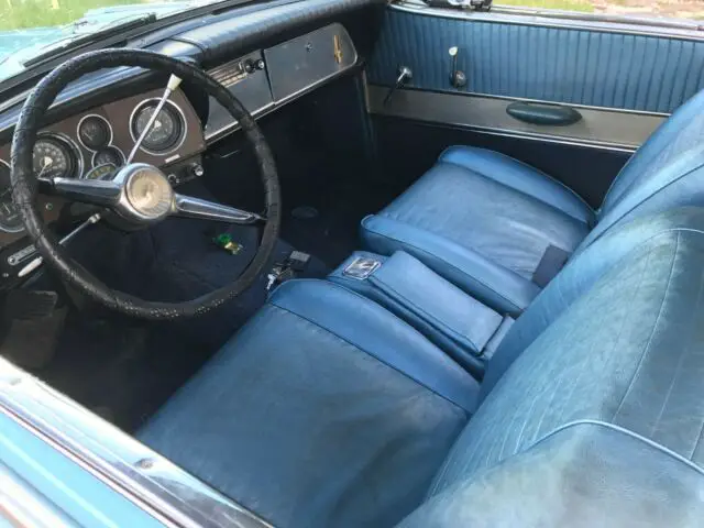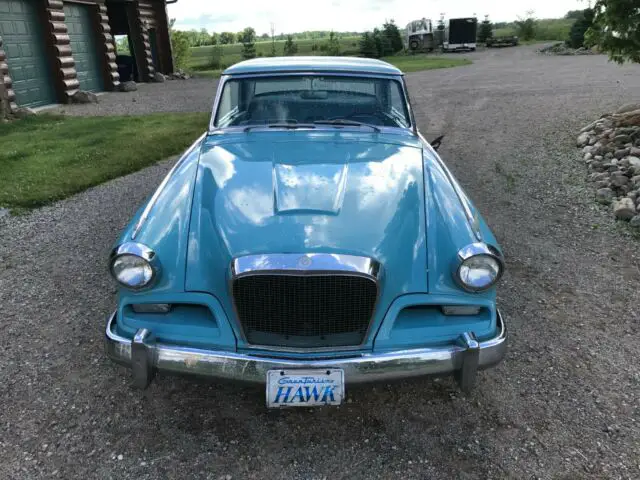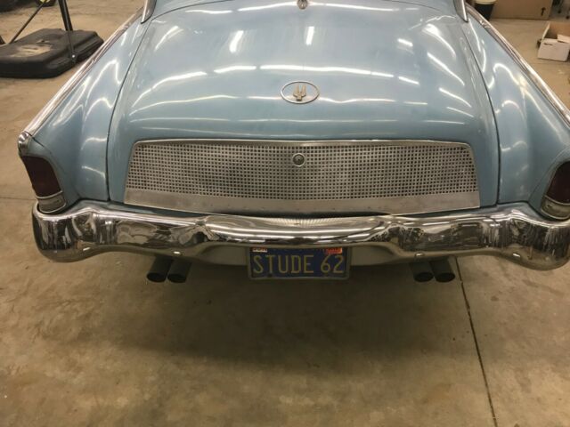 1962 Studebaker Hawk, Riviera Blue. Extensive owner-supplied history from Beverly Hills dealership forward. Engine rebuilt to R2 spec (no supercharger) sometime late 90s. Runs well. Sits on BF Goodrich P205/70R15 tires on new chromed steel rims (first photo), but original wheels will also ship with the car (shown in the other photos). PLEASE NOTE: Mileage in the listing is a complete guess - odometer shows 00534.2 - I cannot warrant the mileage or the speedometer's functionality.