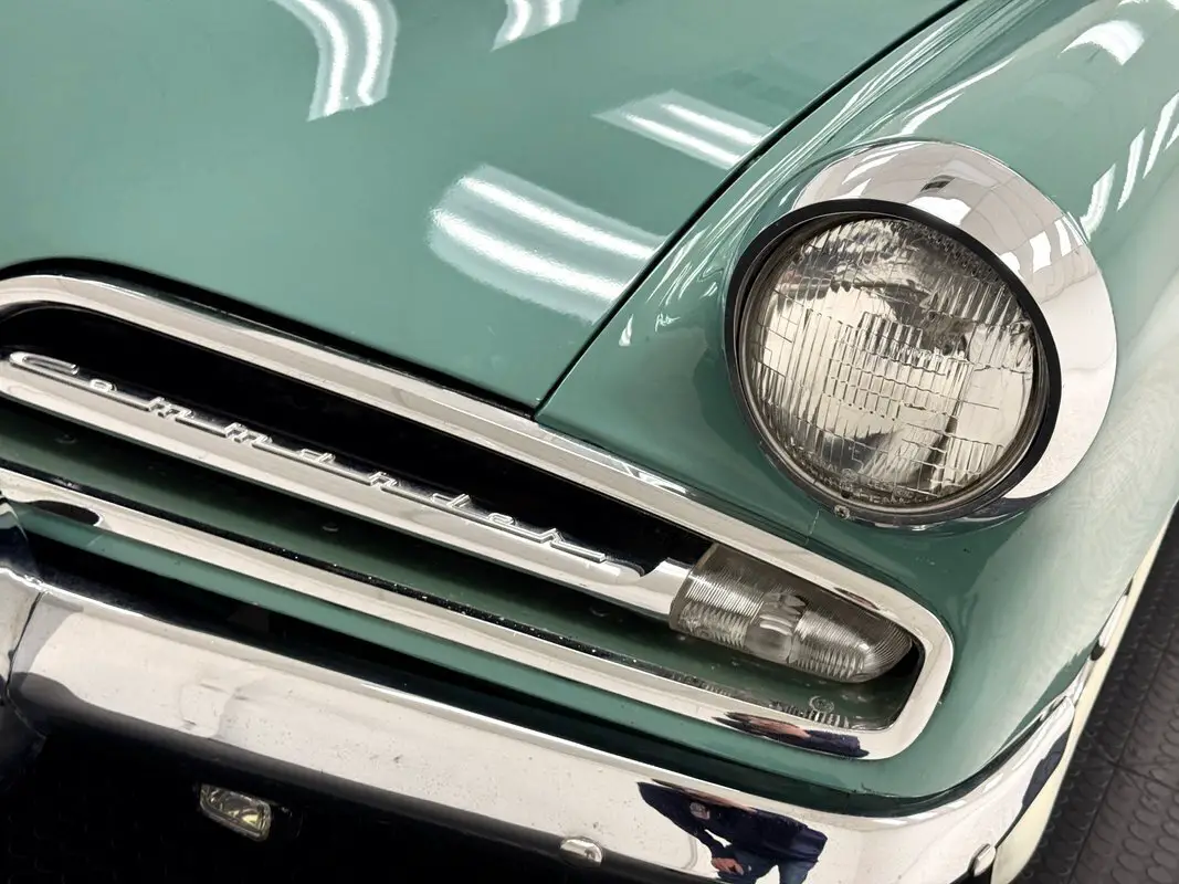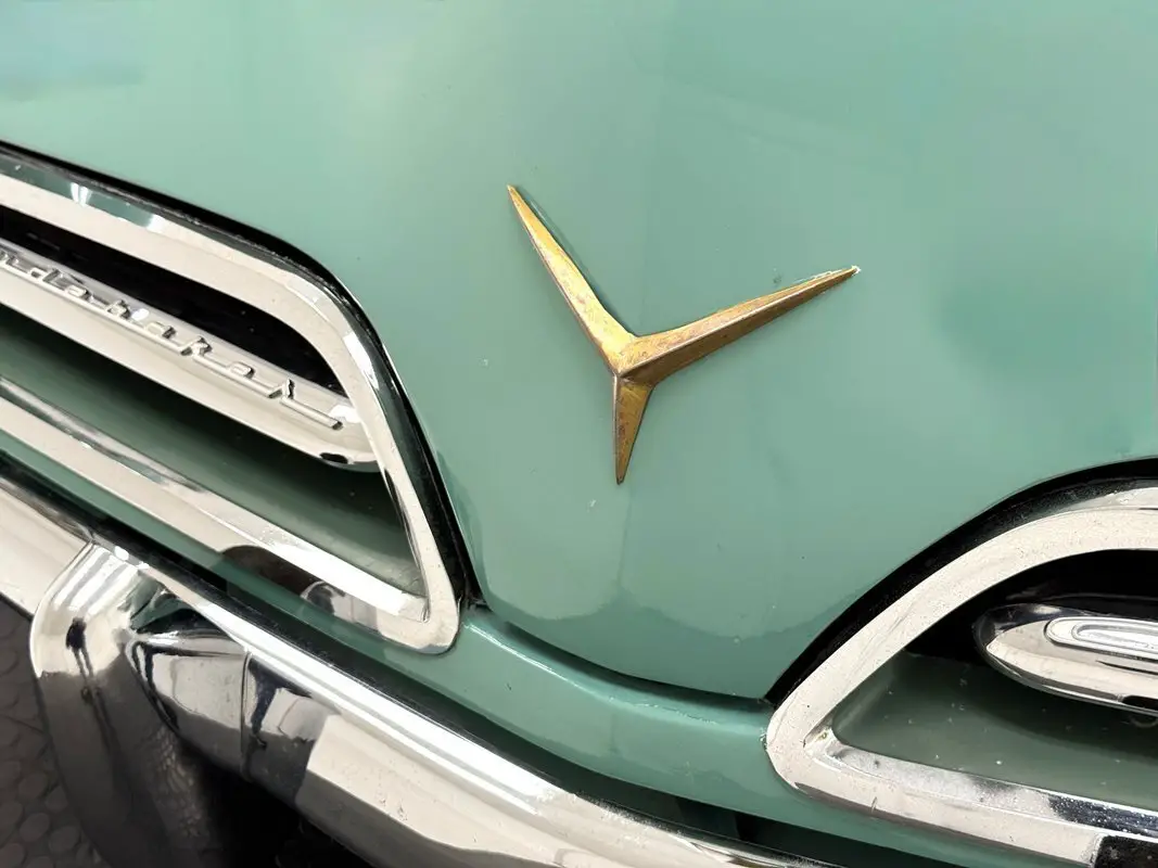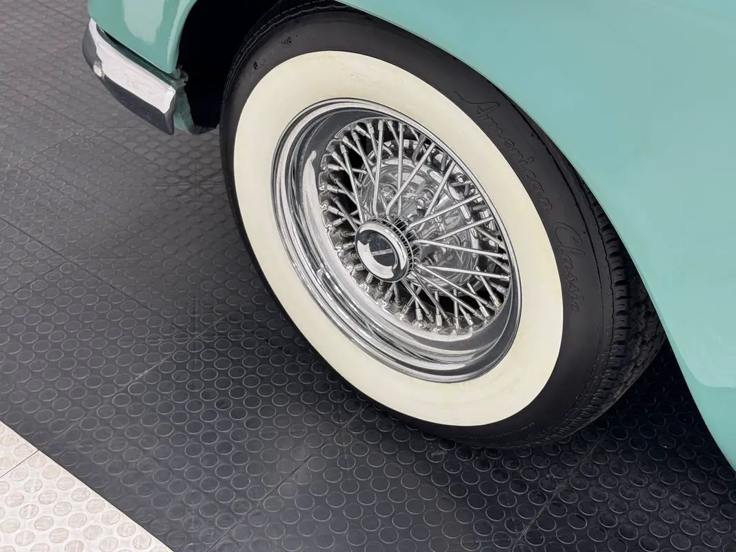 Pastels originated in Italy, so it's fitting that this car is bathed in Tahoe Green, a pastel shade on a car touted with headlines reading "the new American car with the European look" and in 1953, there weren't many cars like it, if any! It starts with that split grille and three point star on the nose underscored by a chrome bumper with bumperettes that jut out like a bulldog's underbite. The shoulder line trails down to back where panels narrow, topped by a polished trim piece and complemented by the cabin that cants rearward and also narrows as it goes. The brochure calls the contrasting roof, here in Ivory Mist white, a "hard top convertible for 5" and at distance, it does appear to have a separate roof. In back, smart tail lights in a fin flank a wide smooth decklid over a more ornate rear bumper in chrome. 15-inch Truespoke wire wheels are on board and our consignor includes the original wheels and covers in the sale. The only imperfection is some paint runs on and near the rocker panel.