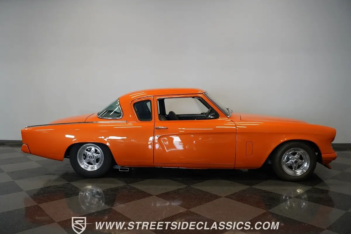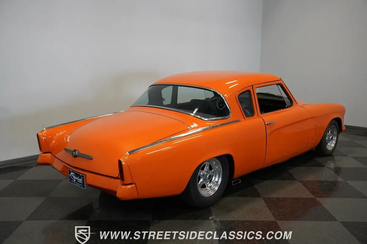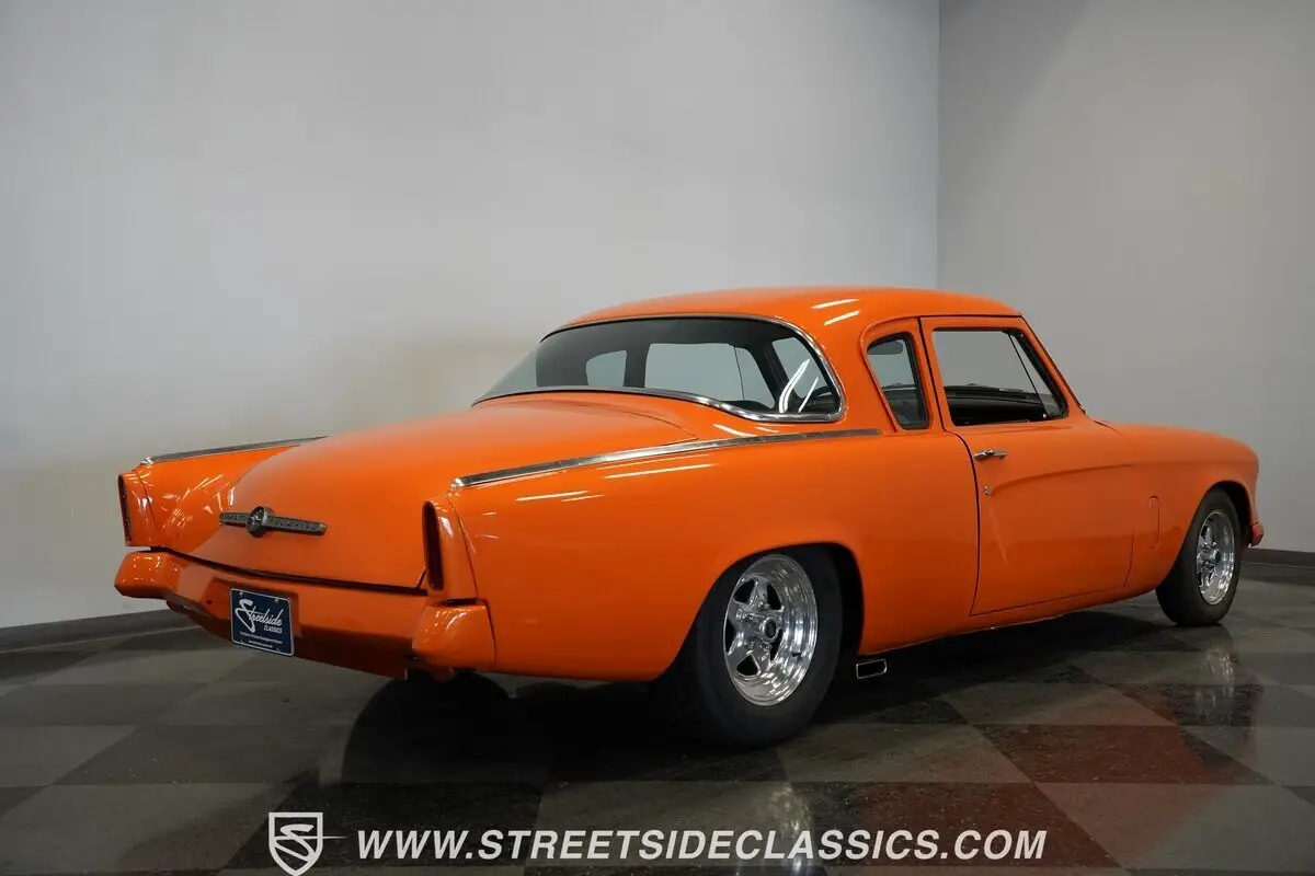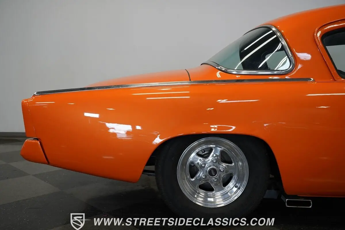 Orange paint covers this 1953 Studebaker Commander Restomod from bumper to bumper. The body features the original bullet nose front end and curved rear quarter panels. Weld aluminum 15" wheels are fitted with 185/80R15 tires in front and 255/60R15 tires in back. Front suspension includes control arms and coil springs with a sway bar, while the rear uses leaf springs and traction bars. Dual FlowMaster exhaust exits from underneath, and disc brakes are installed at all four corners.
