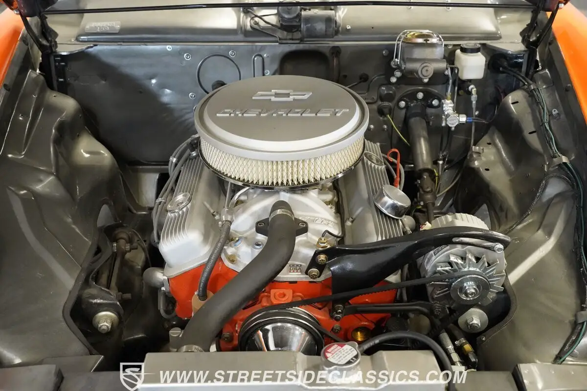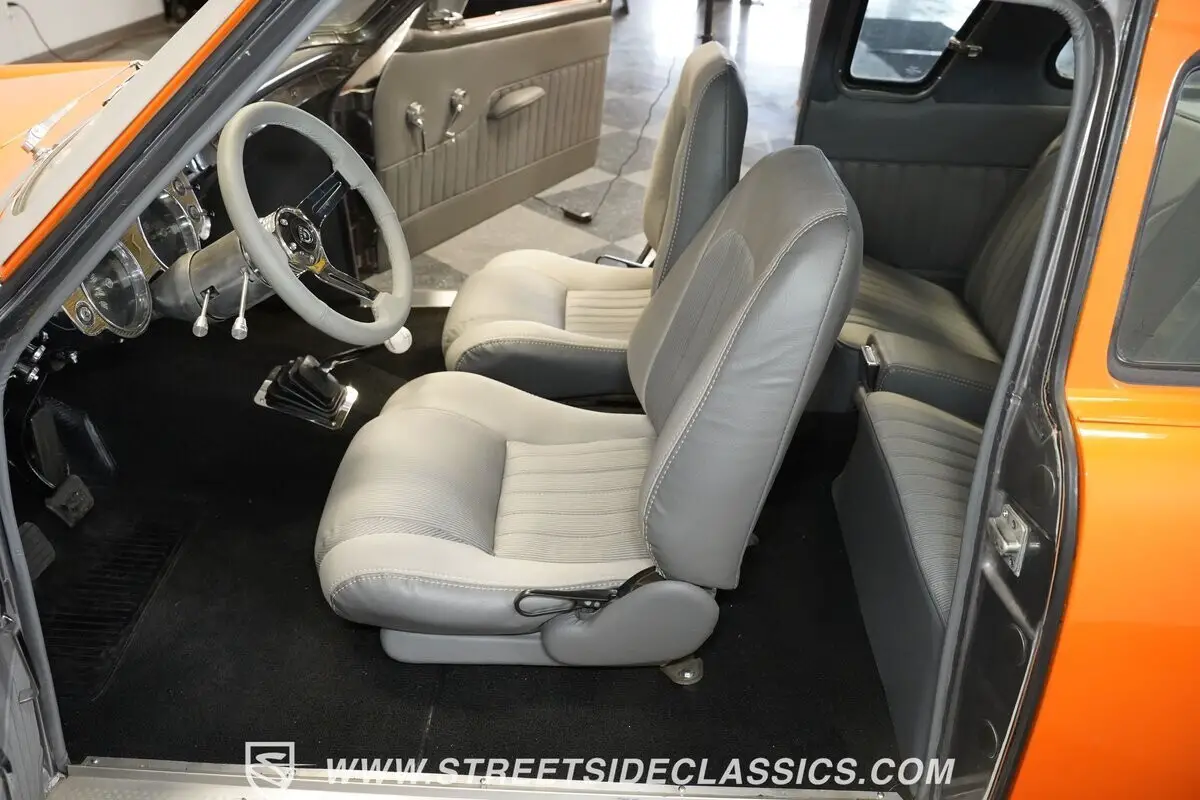 Beneath that distinctive hood sits a Chevrolet 327 cubic inch V8 engine, paired with a Muncie 4-speed manual transmission. The single 4-barrel Holley carburetor sits atop an Edelbrock Performer EPS intake manifold. A dual FlowMaster exhaust with shorty headers provides a properly aggressive sound. Stopping power comes from disc brakes at all four corners, while power steering makes navigating this custom cruiser effortless. The front independent suspension with sway bar and rear traction bars work in tandem with the 10-bolt rear axle.