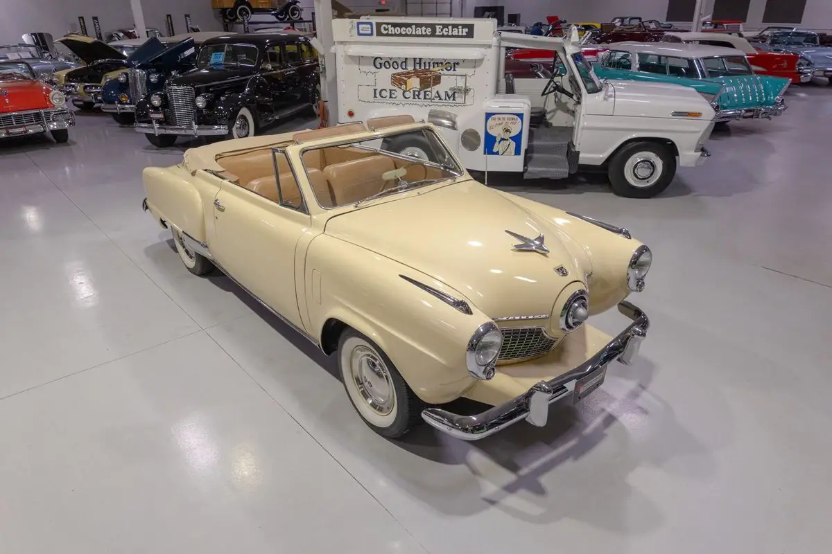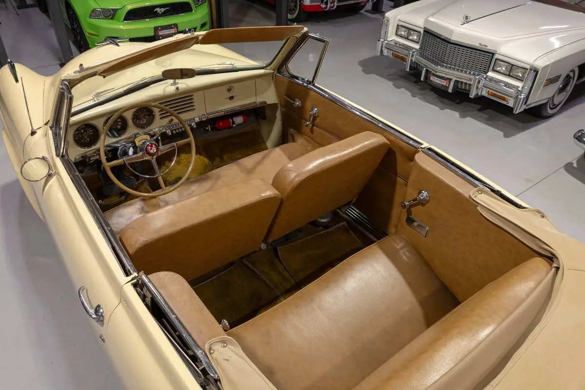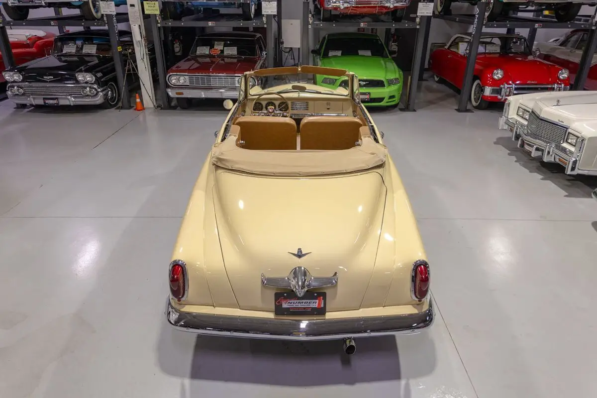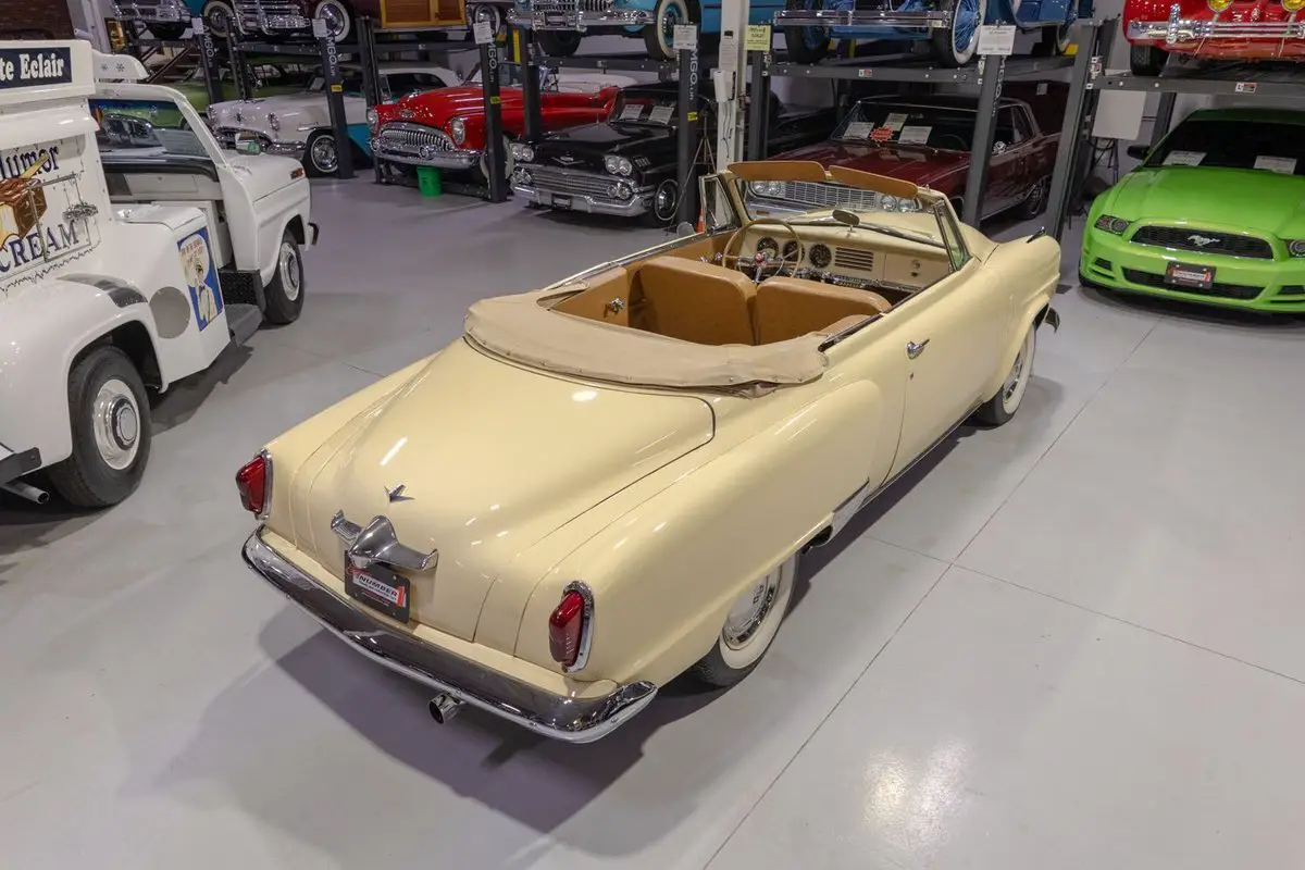 This 1951 Studebaker Commander Convertible is an absolutely gorgeous post-war convertible and features Studebaker's iconic "Bullet Nose" styling! Coming off the banner year in 1950, Studebaker hit a bit of a sales slump during the 1951 model year. In 1951, Studebaker produced two distinct series, the entry-level Champion and the top-of-the-line Commander. Sitting atop the Commander line was the Commander State Convertible, which was the most expensive Studebaker that year. Perhaps the most notable upgrade on the Commander models was its engine. That is, the 1951 Studebaker Commander models all came equipped with Studebaker's brand new 232.6 cubic inch overhead valve V8 engine that was rated to produce 120 horsepower. In fact, Studebaker's more economical 6 cylinder was not even offered on the premium Commander line. Many believe that the shift from the economy flathead 6 to the OHV V8 was due in large part to Studebaker's sensing that America's automakers were headed in the direction of overhead valve V8 engines and getting away from the flathead 6 cylinder setups from the 30s and 40s. The 1951 Commander models also looked extremely futuristic, both inside and out. Of course, the most iconic aspect of the 1951 Studebaker design was the "Bullet Nose" grille that served as an air intake for the engines that was clearly influenced by the growing aviation industry of the post-war era. On the insides, the '51 Commander sported "big, sweep-type aircraft dials" in the instrument cluster, with Studebaker even touting this fact in its marketing materials in 1951. While Studebaker largely targeted a thriftier customer base, by offering the more premium Commander series, the South Bend, Indiana based American independent automaker was able to cover a larger array of customers. In total, a mere 3,773 Commander State Convertibles were produced in 1951, which makes this particular example a pretty rare collector's piece that's ready to be driven or shown by its next owner. Under the hood on this '51 Commander Convertible is a 232.6 cubic inch overhead valve V8 fed by a single 2 barrel carburetor that together were said to have created 120 horsepower when new. The OHV 233 V8 is backed by an optional automatic transmission, ensuring that just about anybody can take this classy Studebaker for a spin around the block! Exhaust exits this Studebaker's power plant via a single exhaust port that generates a smooth sound out the tailpipe. This 1951 Studebaker Bullet Nose Convertible rides on a set of wide whitewall radial tires mounted on painted steel wheels and accented with full chrome wheel covers that give this Commander an upscale look and terrific ride. The tan Haartz Cloth Stayfast power convertible top is brand new and it is raised and lowered easily with the simple flick of a switch. An outside chrome mirror mounted on the driver's side makes squeezing into a tight parking spot much easier. The front chrome bumper is also outfitted with a pair of chrome bumper guards that add a little extra 50s flair to this gorgeous convertible. The body on this 1951 Studebaker has been refinished in beautiful Sahara Sand paint, completing the exterior look of this Commander. The interior of this 1951 Studebaker Commander Bullet Nose Convertible is gorgeous! The front and rear bench have been reupholstered in beautiful Amaretto simulated leather. The matching door panels and sun visors, medium saddle carpeting, and steering wheel all to be in wonderful condition as well and all retain a nice stock appearance. The triple pot instrument cluster is equipped with a 100 MPH speedometer, temperature gauge, oil pressure gauge, amp gauge, and fuel gauge, as well as a clock. The dash is finished off with a push-button "Starline" AM radio, chrome rear view mirror, ash tray, and locking glovebox. Whether you're buying your very first classic car or you're adding to your existing collection of post-war classics, this 1951 Studebaker Commander "Bullet Nose" Convertible would make an excellent choice. Give Ellingson's a call today at 763-428-7337!