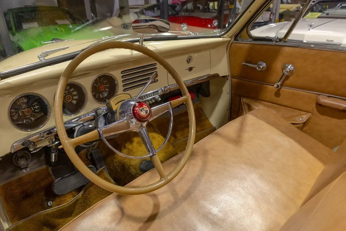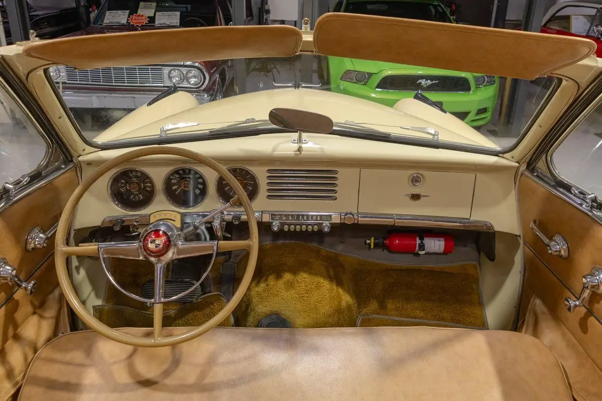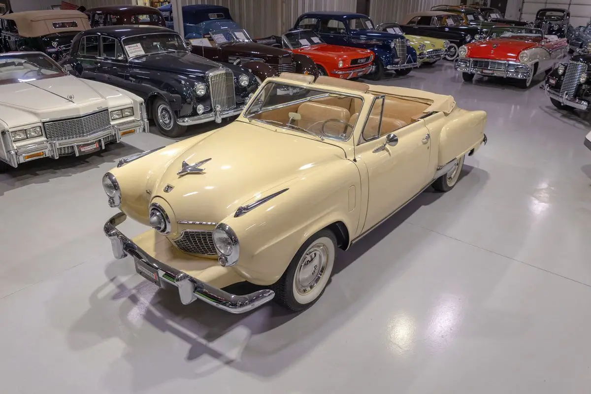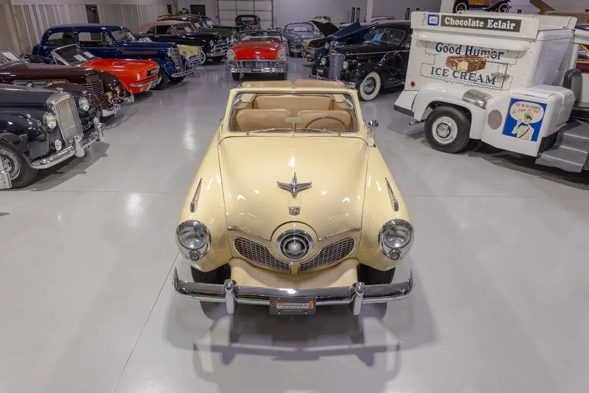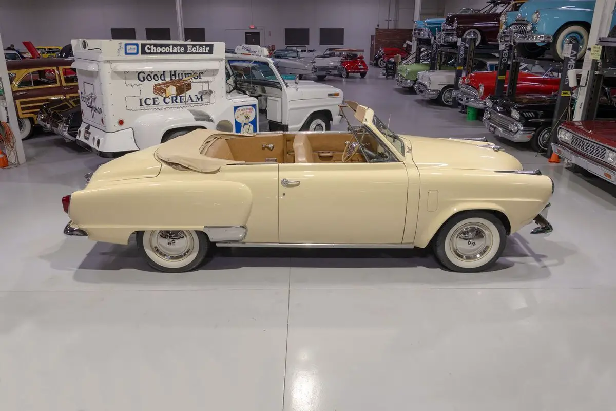 This 1951 Studebaker Commander Convertible is an absolutely gorgeous post-war convertible and features Studebaker's iconic "Bullet Nose" styling! Coming off the banner year in 1950, Studebaker hit a bit of a sales slump during the 1951 model year. In 1951, Studebaker produced two distinct series, the entry-level Champion and the top-of-the-line Commander. Sitting atop the Commander line was the Commander State Convertible, which was the most expensive Studebaker that year. Perhaps the most notable upgrade on the Commander models was its engine. That is, the 1951 Studebaker Commander models all came equipped with Studebaker's brand new 232.6 cubic inch overhead valve V8 engine that was rated to produce 120 horsepower. In fact, Studebaker's more economical 6 cylinder was not even offered on the premium Commander line. Many believe that the shift from the economy flathead 6 to the OHV V8 was due in large part to Studebaker's sensing that America's automakers were headed in the direction of overhead valve V8 engines and getting away from the flathead 6 cylinder setups from the 30s and 40s. The 1951 Commander models also looked extremely futuristic, both inside and out. Of course, the most iconic aspect of the 1951 Studebaker design was the "Bullet Nose" grille that served as an air intake for the engines that was clearly influenced by the growing aviation industry of the post-war era. On the insides, the '51 Commander sported "big, sweep-type aircraft dials" in the instrument cluster, with Studebaker even touting this fact in its marketing materials in 1951. While Studebaker largely targeted a thriftier customer base, by offering the more premium Commander series, the South Bend, Indiana based American independent automaker was able to cover a larger array of customers. In total, a mere 3,773 Commander State Convertibles were produced in 1951, which makes this particular example a pretty rare collector's piece that's ready to be driven or shown by its next owner. Under the hood on this '51 Commander Convertible is a 232.6 cubic inch overhead valve V8 fed by a single 2 barrel carburetor that together were said to have created 120 horsepower when new. The OHV 233 V8 is backed by an optional automatic transmission, ensuring that just about anybody can take this classy Studebaker for a spin around the block! Exhaust exits this Studebaker's power plant via a single exhaust port that generates a smooth sound out the tailpipe. This 1951 Studebaker Bullet Nose Convertible rides on a set of wide whitewall radial tires mounted on painted steel wheels and accented with full chrome wheel covers that give this Commander an upscale look and terrific ride. The tan Haartz Cloth Stayfast power convertible top is brand new and it is raised and lowered easily with the simple flick of a switch. An outside chrome mirror mounted on the driver's side makes squeezing into a tight parking spot much easier. The front chrome bumper is also outfitted with a pair of chrome bumper guards that add a little extra 50s flair to this gorgeous convertible. The body on this 1951 Studebaker has been refinished in beautiful Sahara Sand paint, completing the exterior look of this Commander. The interior of this 1951 Studebaker Commander Bullet Nose Convertible is gorgeous! The front and rear bench have been reupholstered in beautiful Amaretto simulated leather. The matching door panels and sun visors, medium saddle carpeting, and steering wheel all to be in wonderful condition as well and all retain a nice stock appearance. The triple pot instrument cluster is equipped with a 100 MPH speedometer, temperature gauge, oil pressure gauge, amp gauge, and fuel gauge, as well as a clock. The dash is finished off with a push-button "Starline" AM radio, chrome rear view mirror, ash tray, and locking glovebox. Whether you're buying your very first classic car or you're adding to your existing collection of post-war classics, this 1951 Studebaker Commander "Bullet Nose" Convertible would make an excellent choice. Give Ellingson's a call today at 763-428-7337!