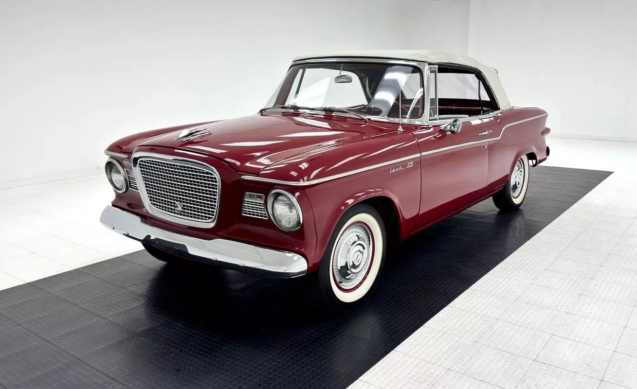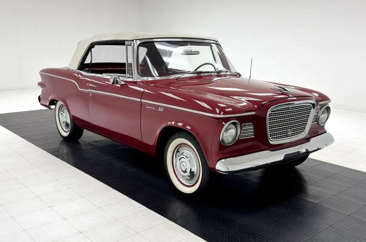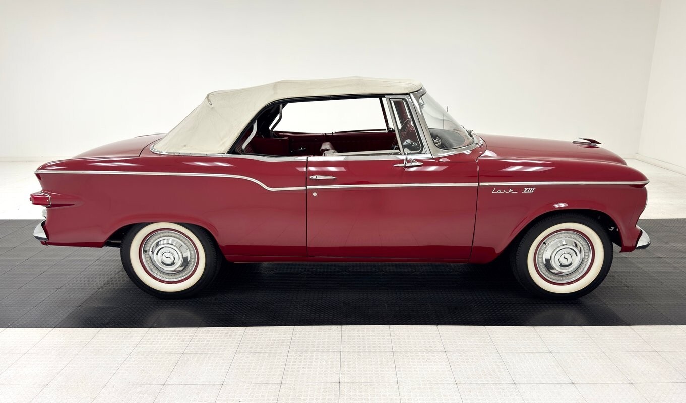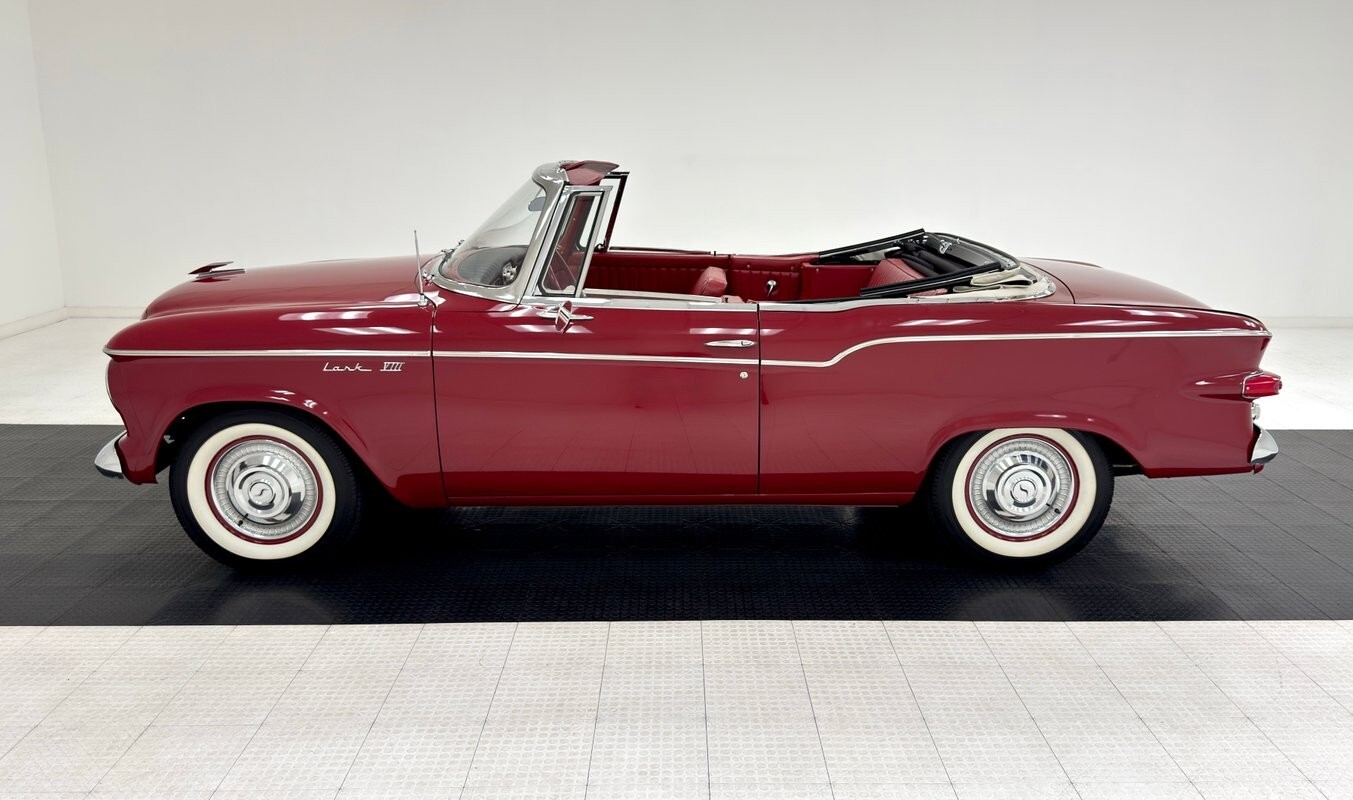For consignment, a 1960 Studebaker Lark VIII Regal convertible showing 13,444 miles, but the true miles are unknown. The car presents very well and its 30 year restoration has held up nicely. It was restored by Palmyra Motors in Pennsylvania, a Studebaker dealer where the car was also purchased new.