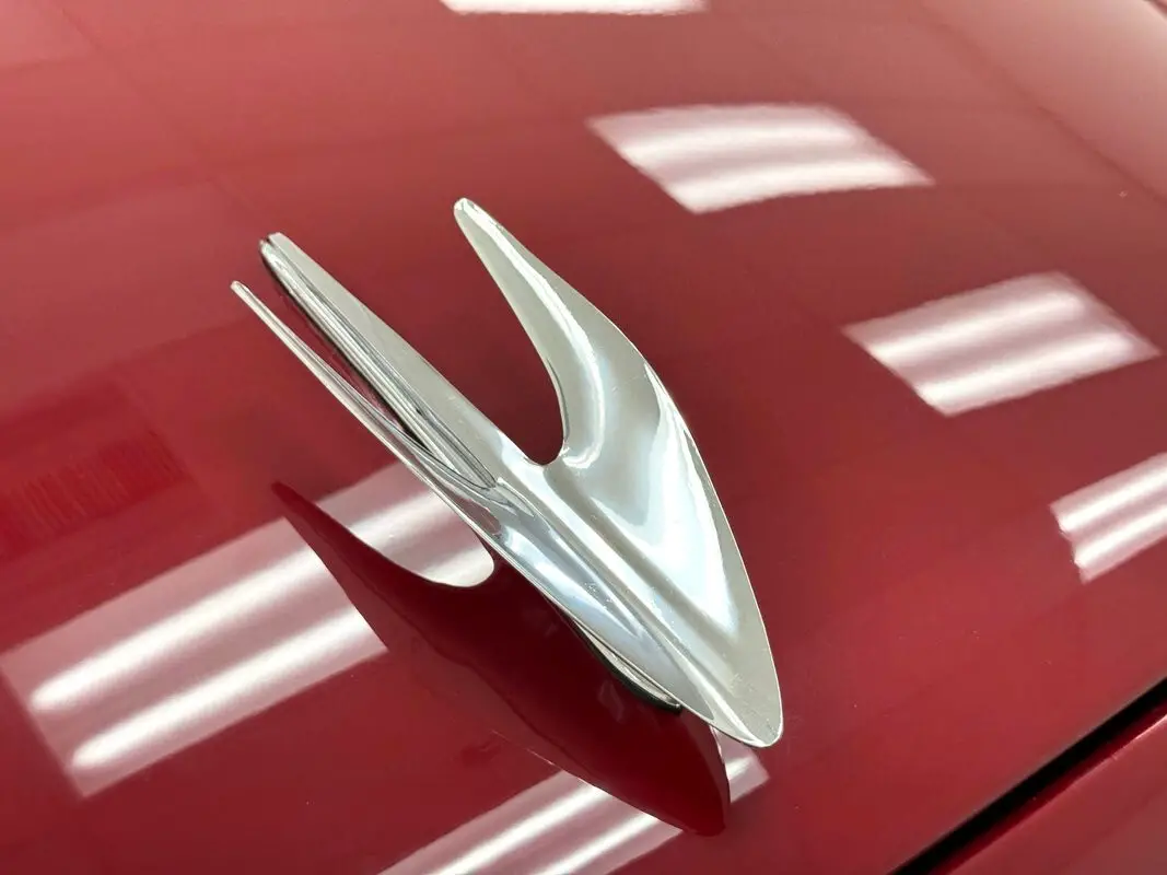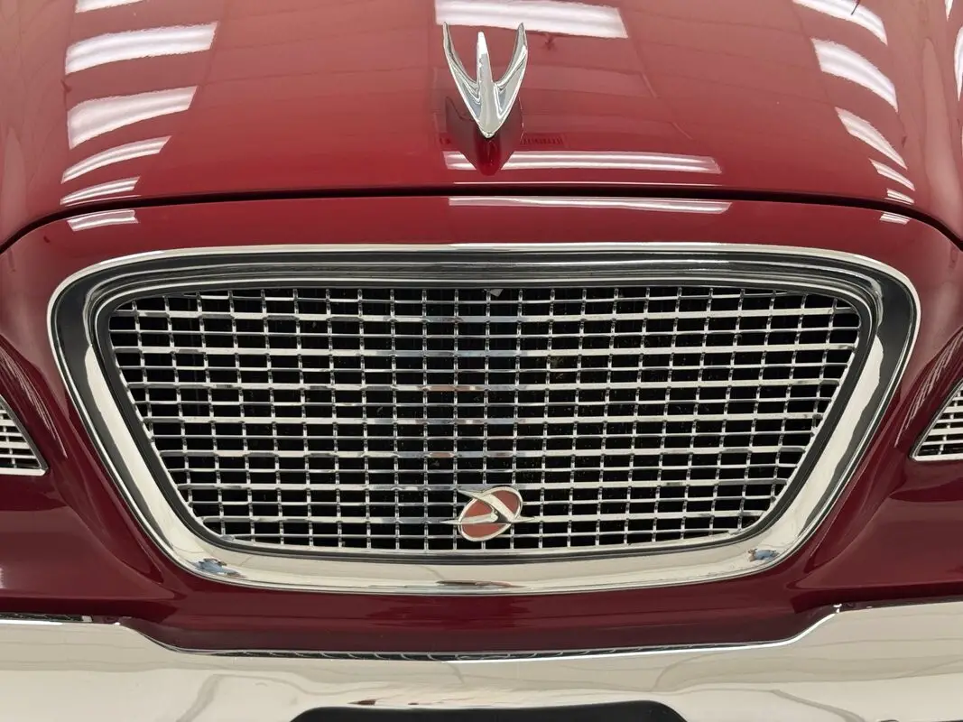 Its proportions, shape, and profile come across as somewhat whimsical, especially in the period of really large cars and a time when long, more narrow body panels were becoming vogue. Painted with two stage Colonial Red, the subtle lines of the car are accentuated by the side trim molding which bounces up as it flows to the back, followed by the decklid dip in the back between very narrow fenders. There, the concave rear fascia is bookended by modest tail lights that hug the corners allowing them to be seen from the side and a straight chrome bumper resides below. The distinctive face includes the center grille with matching mini grilles under the marker lights and round headlights under a brow created by the side trim turning the corner. Let's not forget the spade shaped Lark hood ornament in front and the 15-inch red wheels with covers and white walls, looking great. A white canvas top is above showing some typical discoloration but fully intact. Imperfections register only as some bubbling down low and a single scuff.