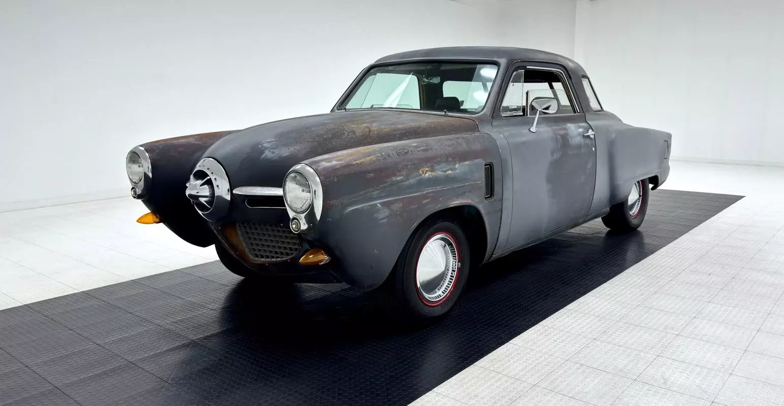 For consignment, a 1951 Studebaker Championship Starlite coupe showing 129,293 miles, but the true miles are unknown. This work in progress is sitting on the chassis of an '89 S10 and there's a 4.3 liter behind the bullet nose!