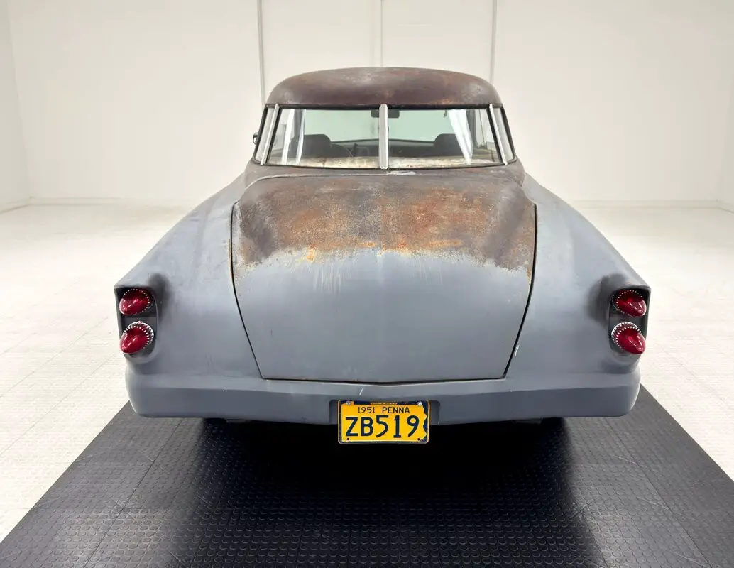 We've got a combination of unpainted panels, primer areas, a smoothed filler and if you put on some wipe on a clear coat, you could call it a day as is. But a body like this also deserves some color, fantastic, rearward sweeping lines that start with the front, sharply angling back and of course, capped by the legendary bullet nose detail that along with the side ornamentation, looks very much like an airplane over the smiling grille below and between teardrop shaped headlights. Cadillac style pointed amber marker lights now adorn the front while double red '59 Caddy units live out back. The wrap-around rear window really could pass for a windshield and creates an open greenhouse with unobtrusive B-pillar. 14-inch red steel wheels wear full covers, wrapped in staggered size tires with a late 2019 date code. There is surface rust, cracking filler, ill fitting add ons, and just general patina on the outside.