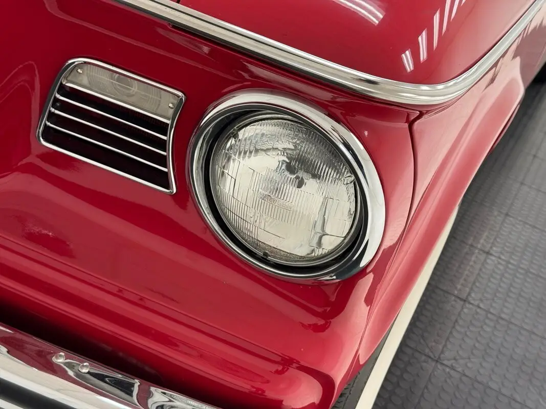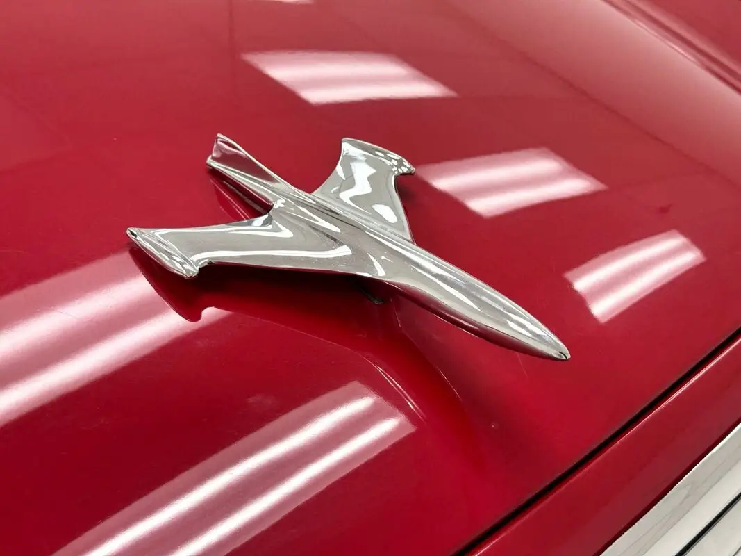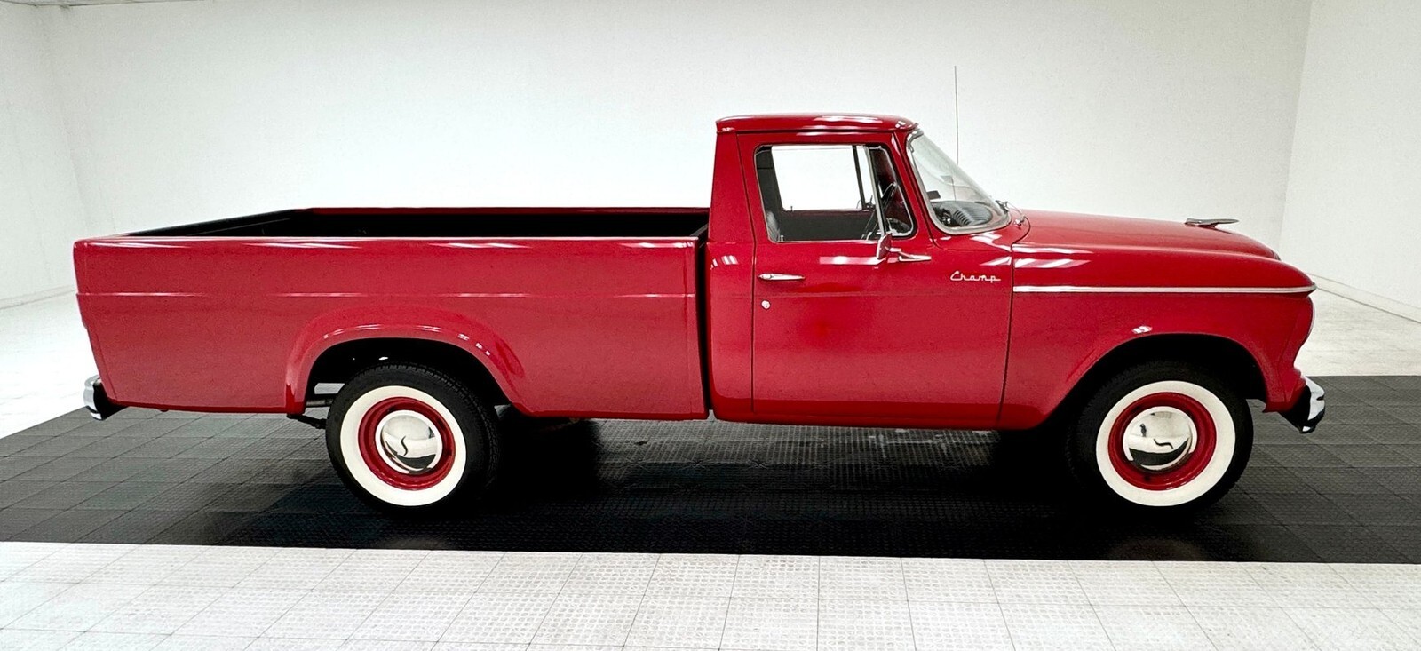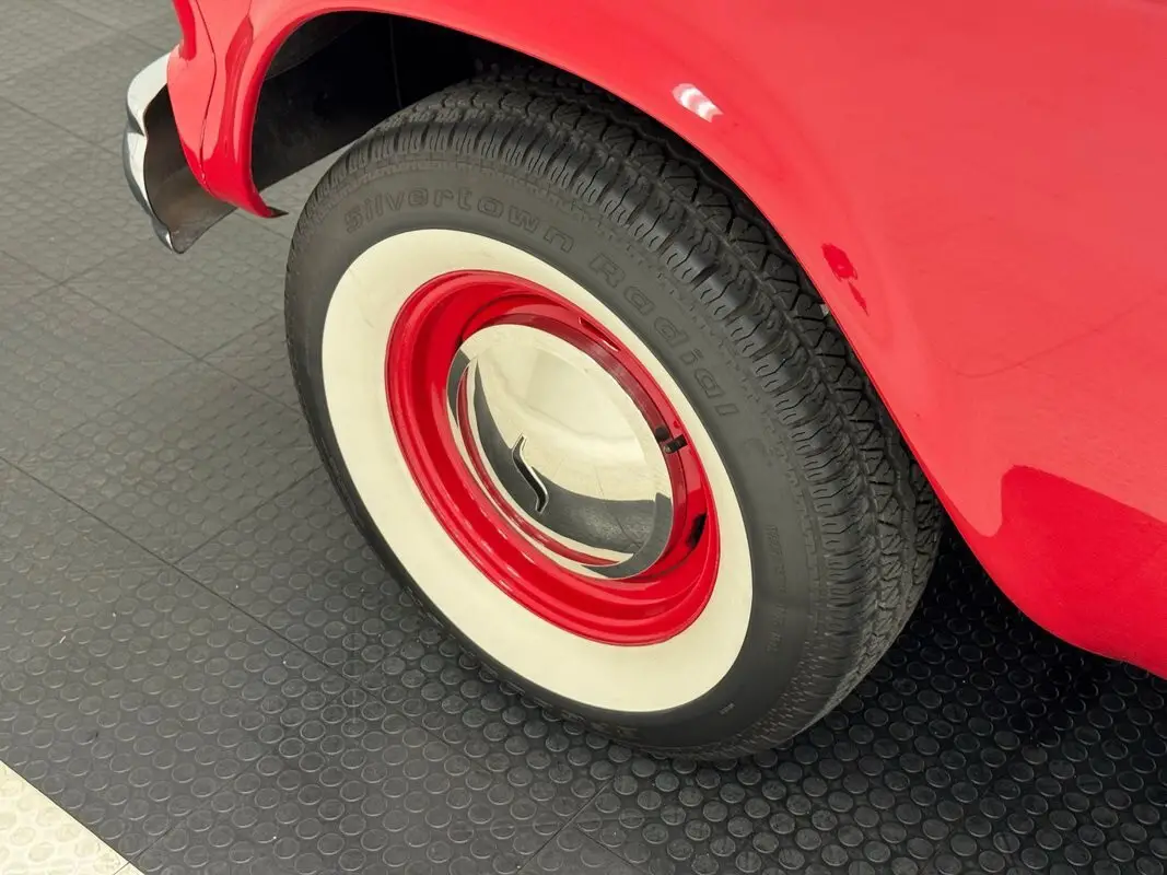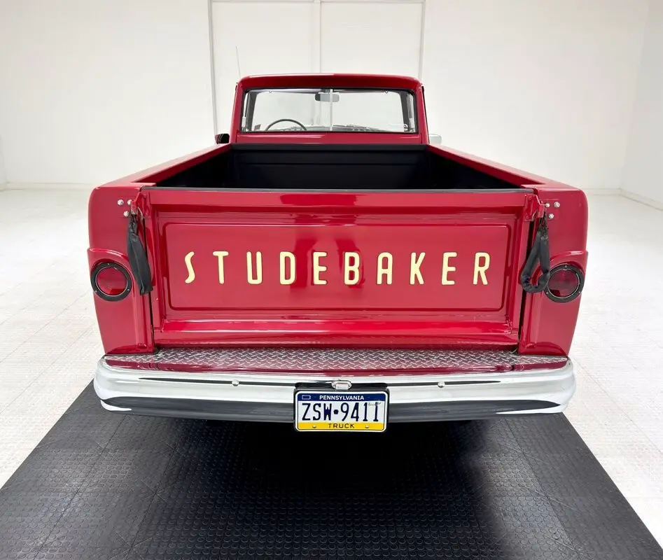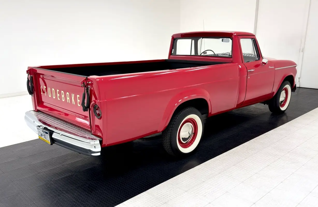 Two stage Apache Red coats this truck, a lovely color for this Lark fronted pickup truck that was intended to compete with the Ford Ranchero and Chevy El Camino at the time. As such, it has a relatively long bed which extends well past the rear axle. The trapezoidal grille is flanked by side markers that mirror the horizontal bars of the grille on a smaller scale and contour to the lines of the grille on one side and the round headlights on the other. The hood also contours, this time to the shape of the grille, with a slight rise in the middle capped off by a hood ornament that depicts a jet, and you don't want to be on the wrong side of it on the street. Proper Studebaker wheel covers are on the 15-inch red wheels wrapped in white wall tires. The paint and metal work are near excellent on the truck and imperfections are limited to a scratch a the tail light panel near the rear bumper.