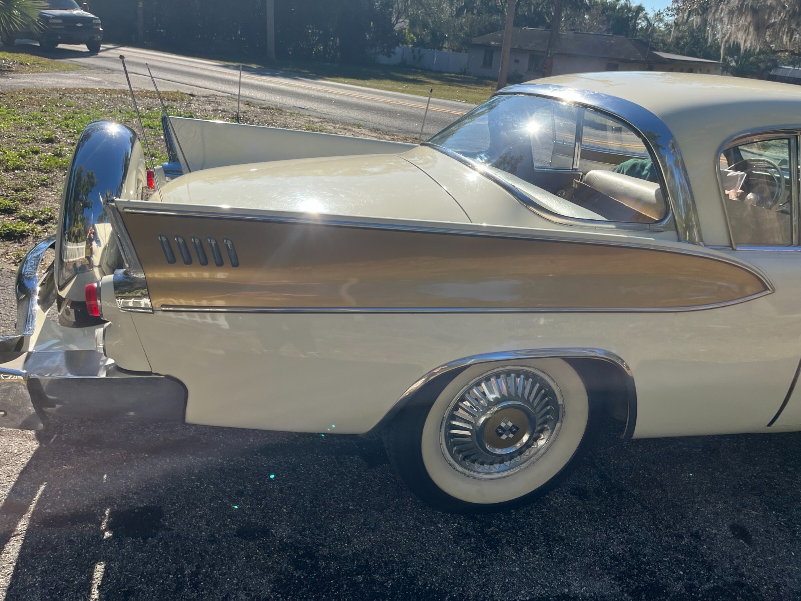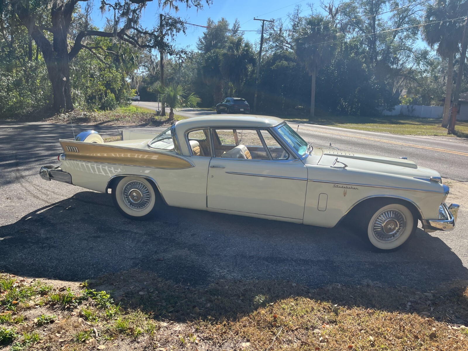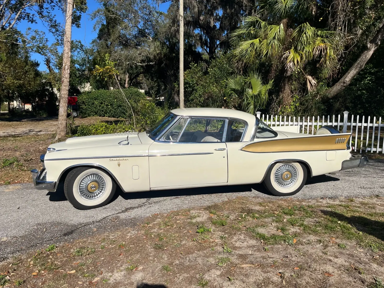 Not for the purist, but this eye candy will bring out your inner ego as you drive by and people gawk at your Golden Hawk. This rare classic is one of the 4000 manufactured in 1957. Just detailed, this beauty is arctic white with gold accents inside and out. The doors, windows, trunk and hood all operate well. Recently, the car had an oil change, spark plugs replaced and brakes adjusted. Late last year all four tires were replaced with Coker wide whites. It has an electric fuel pump for easier starting and a continental kit on the trunk (not original to car but aftermarket add-on). Maintained and protected in an enclosed garage in a mild climate. Clean title. Lightly driven about 2 miles to the YMCA a few times a month and engine runs well (See video)