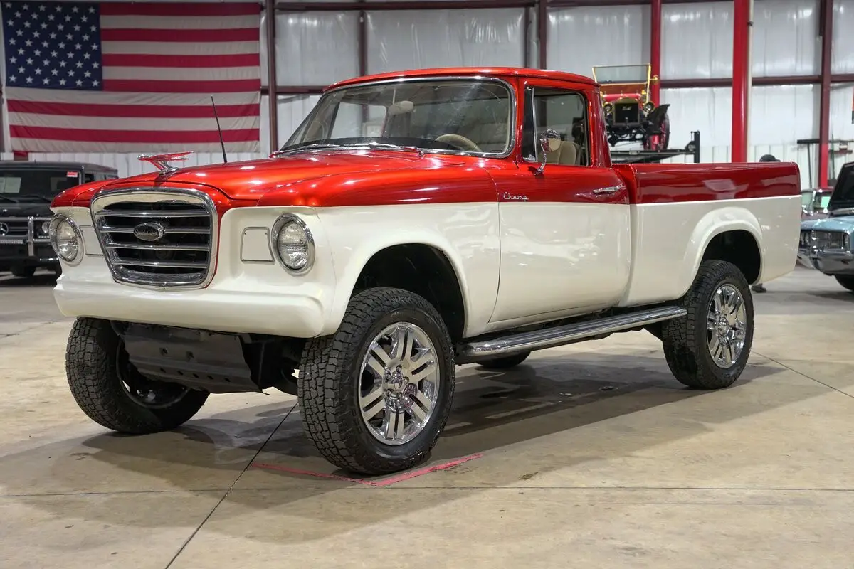 GR Auto Gallery is excited to present this 1964 Studebaker Champ finished in a stunning two-tone Orange Metallic and White combination. This unique pickup perfectly blends vintage Americana with modern engineering, creating a one-of-a-kind classic that drives as good as it looks. The exterior shows off the Champ's distinctive mid-century lines accented by gleaming chrome trim, a classic Studebaker hood ornament, and a set of polished 18-inch chrome Studebaker wheels wrapped in fresh tires. The look is finished with the right mix of nostalgia and custom flair, giving this Champ a proud stance that turns heads wherever it goes.