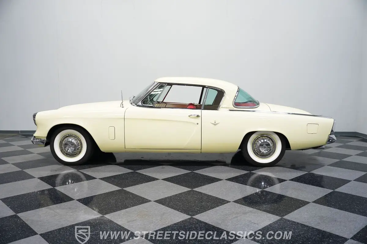 This classic Studebaker was recently treated to a comprehensive, ground-up restoration and has been carefully driven only 100 miles since its completion. Finished beautifully in Ivory Mist on an arrow-straight body, this rare Studebaker is Stunning. Glistening chrome, correct factory wire wheel covers and wide whitewall tires enhance to timeless design. The interior features red seats and is restored to original specifications, including upholstery patterns, colors and dash.