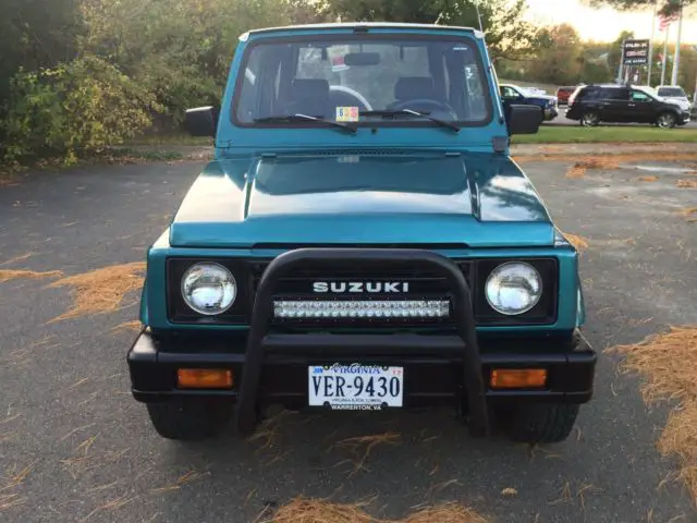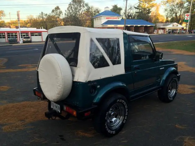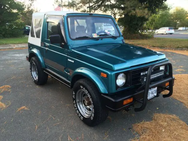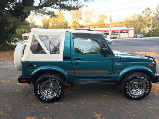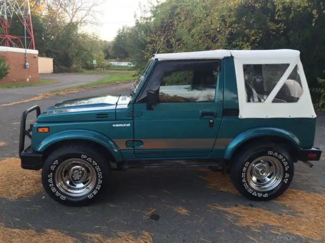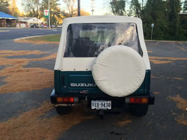 I am selling my 1987 Suzuki Samurai Convertible Soft top. Everything works including an updated 4 speaker audio system with Bluetooth. This vehicle is 99% Rust free and in excellent condition. The interior is complete and the paint still shines on the outside. It is has been garaged and is a great driver. I still drive it to work once or twice a week. It starts right up and will go 65 down the road. The engine is completely stock and is the original 1.3 4 cylinder with a 5 speed manual trans. The Hubs and 4x4 works great. The top is in good condition and is solid going down the road. It has not been lifted but it does have a size larger tire and aftermarket wheels.