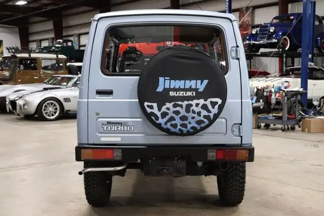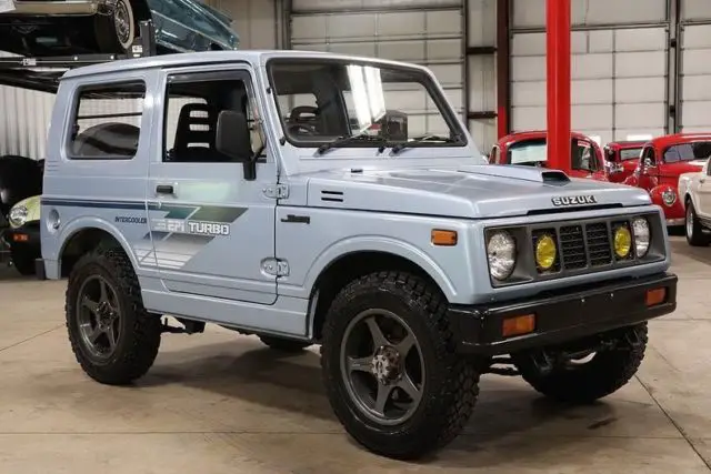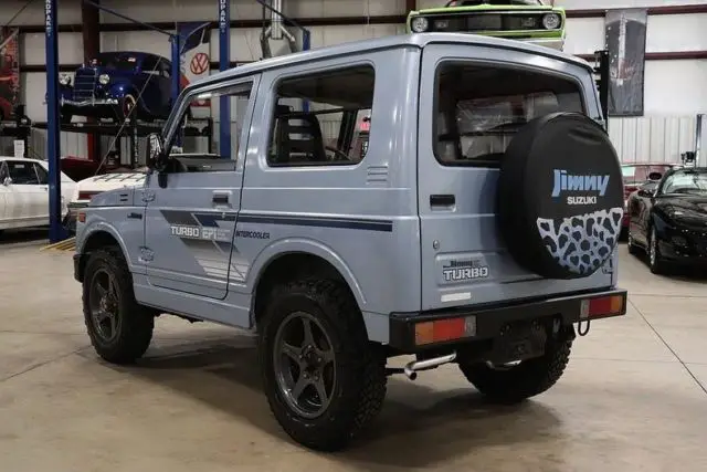 The second generation Suzuki mini SUV hit the market in 1981 and was sold all around the world under many brand and model names with well known names such as Samurai and Katana being some of the most popular. They came with a variety of engines and were extremely well regarded for their excellent off road performance and efficient running. Lightweight and sterling reliability gave the little Suzuki and edge over its much larger competitors. A Jimny also broke a... world record scaling the Ojos Del Salado mountain in Chile and beat the previous record held by a Jeep! GR Auto Gallery is pleased to present this unique Suzuki Jimny for your consideration. A unique model, this particular vehicle was imported awhile back and features right hand drive, and a compact F5A 543cc 3 cylinder engine with Electronic Petrol Injection injection as well as a turbocharger. The little 3cyl spins freely and makes surprisingly good power. Its mated to an easy to use 5-speed manual and runs very well and goes down the road and offroad very well. Off road credentials are provided by 4WD with low range as well as locking front hubs. The body is finished in Light Blue paint and looks quite nice overall. There are a few small dings and marks but the body is very clean. There are tons of exterior features including EPI graphics, hood scoop, rear mounted spare tire, yellow fog lights, and 16in alloy wheels with Geolander tires. The interior is very clean and features cloth front buckets and a tiny rear seat. Everything is quite clean and the interior features basic instrumentation as well as a ASTI stereo. A rare site in the States, a Jimny has tons of cool JDM cred that many cars can't muster. Cheeky looks and tossable nature, this little trucklet is one of a kind. It has just 66,101KM on the clock and has tons of life left! To see over 80 photos of this car, including undercarriage please visit our website