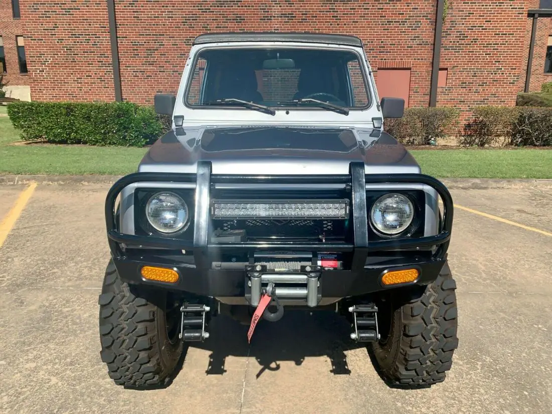Restored, custom build. This is possibly the nicest Samurai that you'll find. Original, Fuel-Injected 4 cylinder engine. 5 speed manual transmission. Four Wheel Drive. Power steering, power disc brakes. Locking hubs. Custom suspension and lift. Custom front and rear bumpers, rocker guards and roll cage. Zero Dark front light bar. SmittybuiltXRC winch. 34x10.50-15LT, TSL Super Swamper tires on 15x10 Ultra Motorsports wheels. Extremely solid and straight body with very nice silver paint. Aftermarket, fiberglass removable top. Nice black interior with Corbeau leather seats, front and rear. Rear seat folds forward for extra rear storage space. Seat belts for 4 occupants. AM/FM radio with Sony speakers. This is a well-built Samurai that runs excellent. Comes with the original owner's manual and a copy of original window sticker.