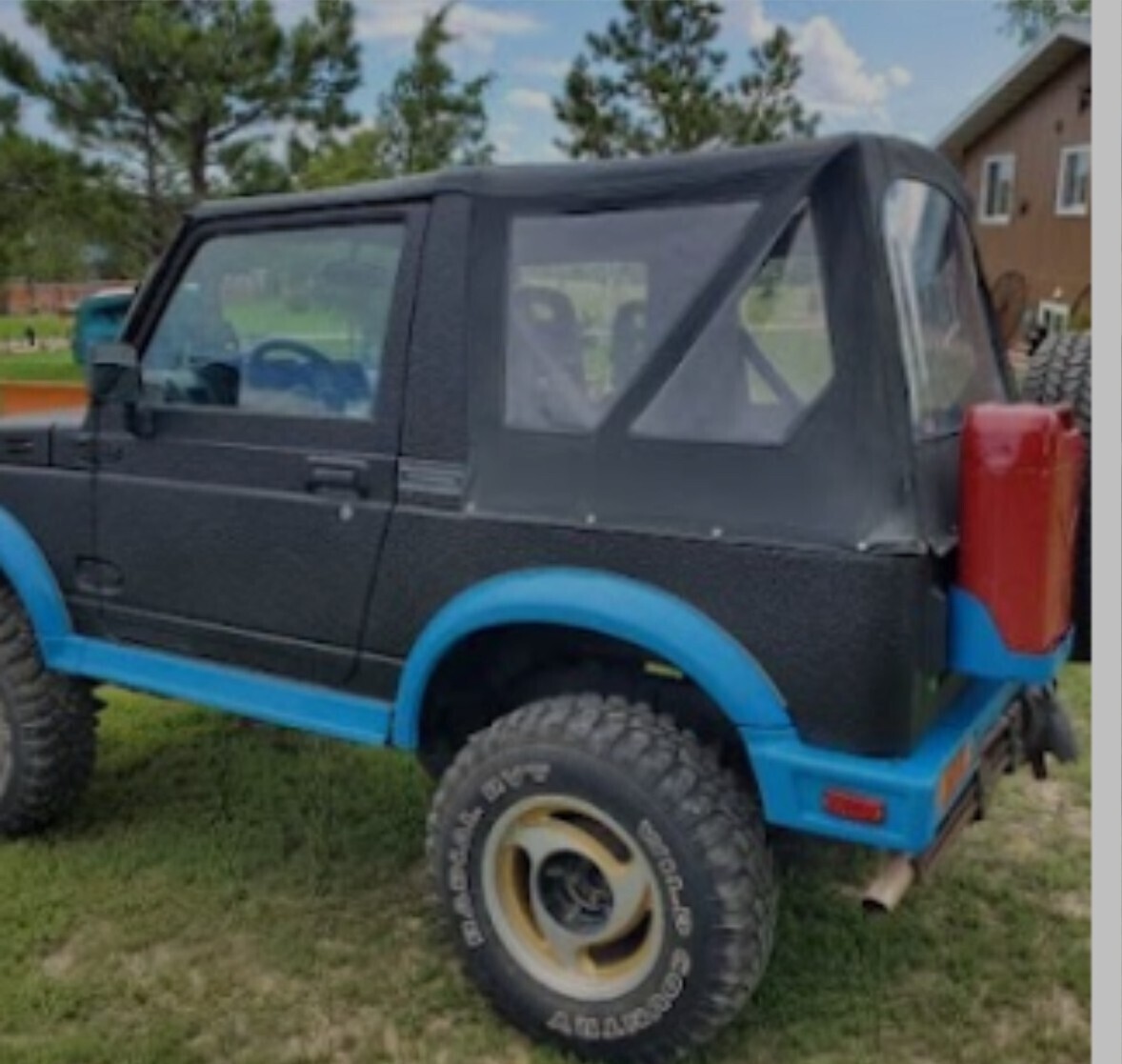 92 Suzuki samurai 85916 miles 5 speed 4x4 new armor all paint custom seat upholstery 6 inch lift kit 30x9.50 tires just replaced clutch stater battery and ignition switch snow plow blade also included