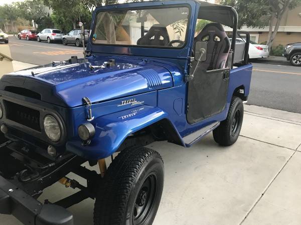 Great Toyota Landcruiser 1967 FJ40 with rust free body, SBC 350 V8 engine with RV camshaft, performance intake, high rise headers matched up to turbo 350 automatic transmission (with shift kit). Ratchet shifter, two lock boxes, and bikini top only. Grandfathered in so no smog tests.