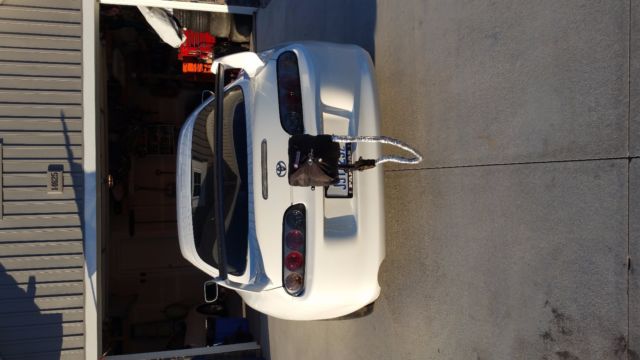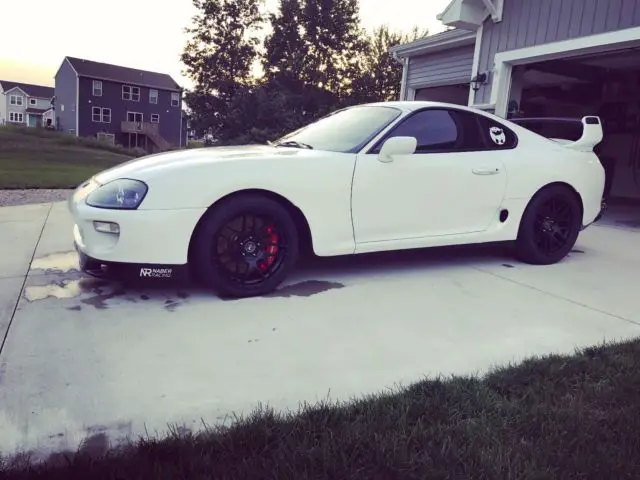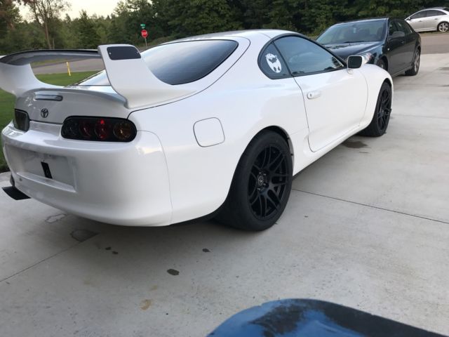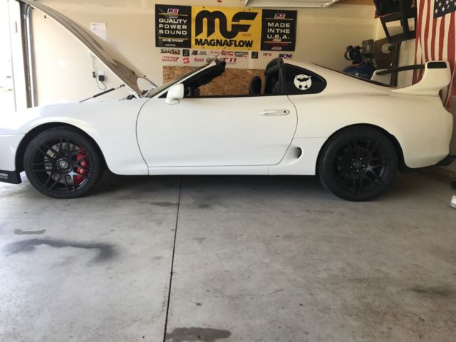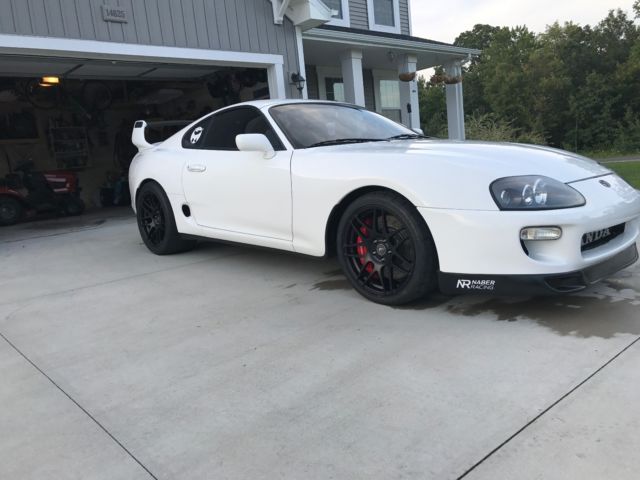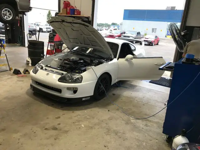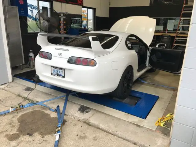94 Toyota Supra original TT/Auto Targa top clean title all vins matching (JT2JA82J0R0008420). Complete fresh respray. Shaved side markers/antenna/rear wiper/engine bay. Clean black interior, all dash panels were stripped, primed and repainted black. Has 178k on odometer. TRD wing, JDM V2 front lip, pioneer head unit with Rockford fosgate speakers, Haltech elite 2500 with harness, 5 bar map sensor, AEM Boost, Trans Temp, Oil Pressure, AEM Wideband and AFR gauges. 6 point Cage built by HP in Texas. Titan Motorsports parachute mount. Whole floor covered in Sound deadener/Heat shield. 97-98 Headlights, 97-98 taillights, 97-98 front turn signals, 98 steering wheel, AEM boost controller, Holly line lock kit, drilled front rotors with SRT8 calipers, rear has NA calipers to fit inside 15” wheels. Tein super street coilovers with tein pillow ball mounts.