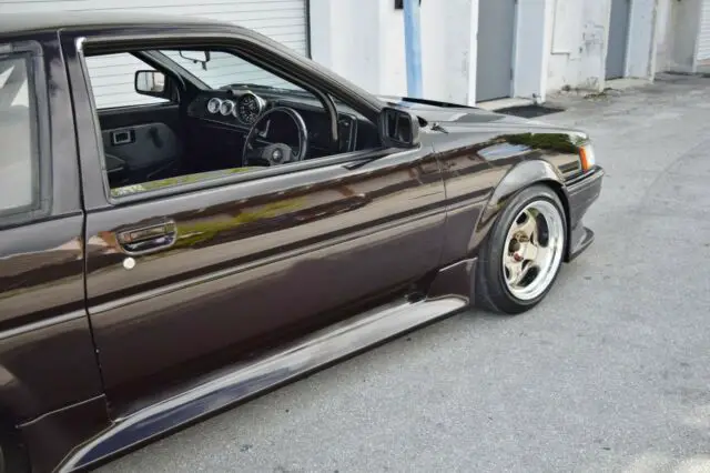 This original Japanese imported AE86 is finished in brown exterior with custom interior.Paint is driver quality with some bubbling and imperfections not uncommon to vehicles ofthis age. Car has been lowered with front coilovers and upgraded shocks and springs in the rearWheels are real work meister 3 piece wrapped in older Dunlop tires all around.