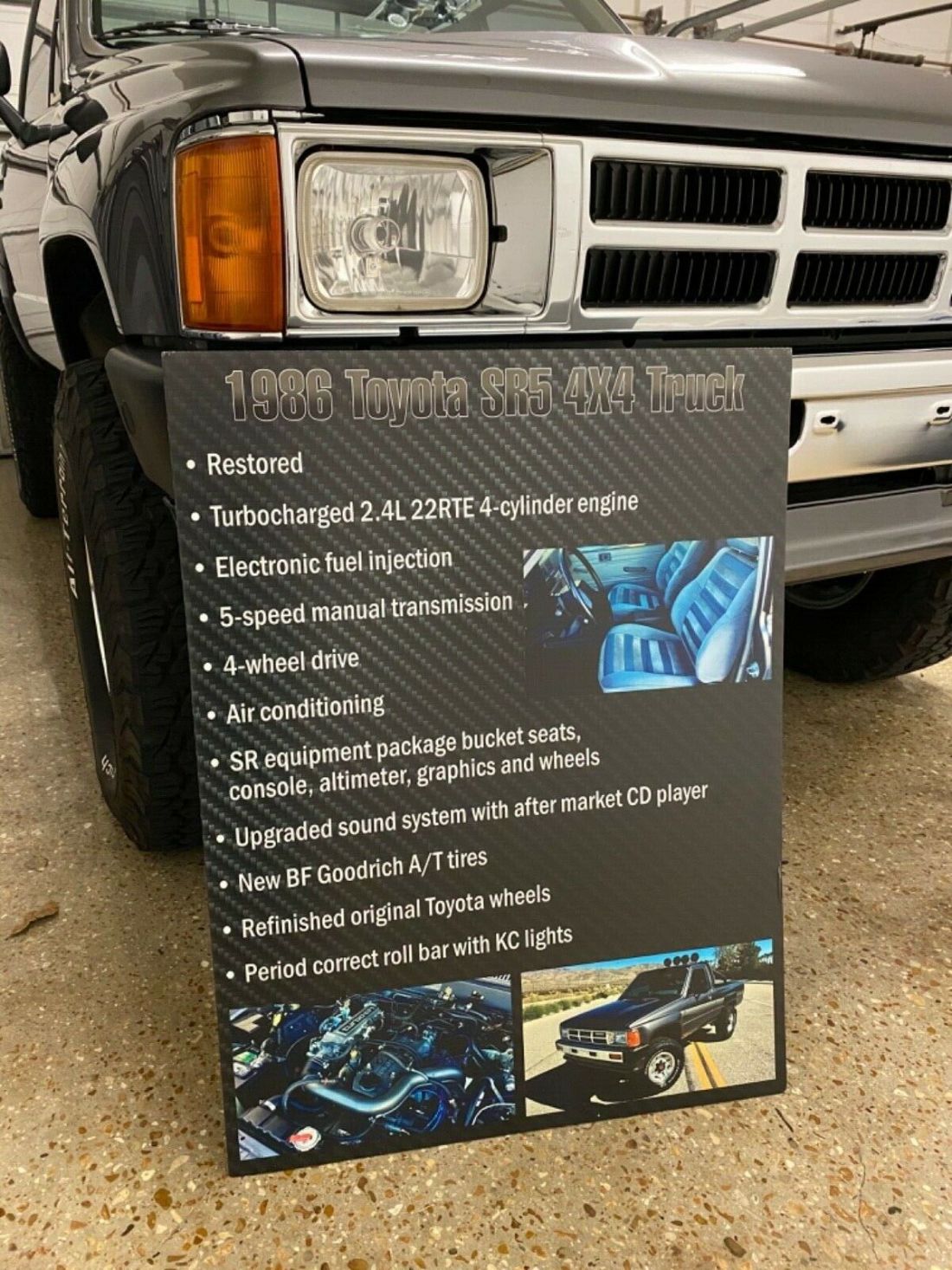 Restored 1986 Toyota Turbo 4x4 pickup, turbocharged 2.4 litre 22RTE 4 cylinder engine with electronic fuel injection, ice cold a/c works great, new BF Goodrich A/T tires, restored original wheels, new seat belts, shocks, timing chain assembly, water pump, new exhaus, fresh tune up, beautiful gray metallic paint with factory graphics, this truck runs and drives perfect, these trucks are bulletproof and steadily climbing in value....very few around in this condition. Please feel free to ask any questions and thanks for looking.