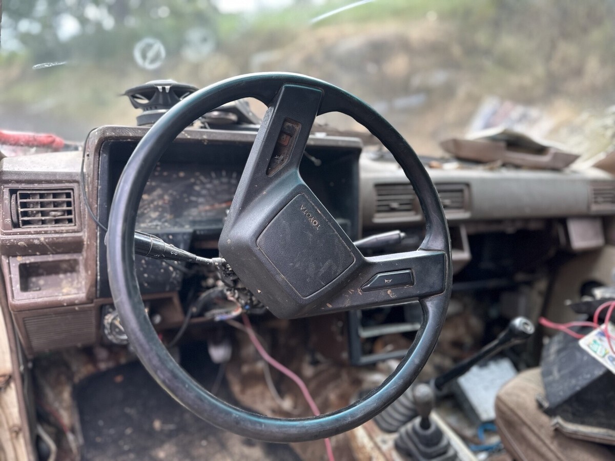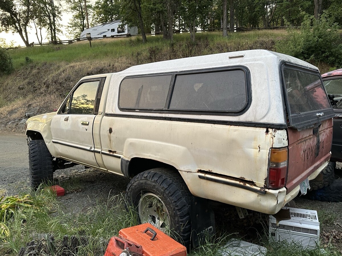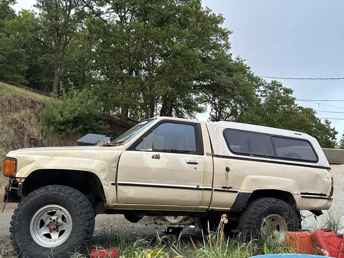 The 1986 Toyota Pickup SR5 is a classic truck with a beige/creme exterior and brown interior, featuring a manual transmission and 4WD drive type. This vehicle has a 2.4L engine with a mild performance cam, 86 - 110 kW (115.24 - 147.4 hp) of horsepower, and comes with features such as truck registration, AM/FM stereo, trailer hitch, cassette player, cloth seats, tilt steering wheel, power steering, and tow bar. With a 2-inch suspension lift and 1.5” ball joint spacers, this pickup is capable of achieving a fuel consumption rate of combined 16-22 mpg and has a partial service history available.