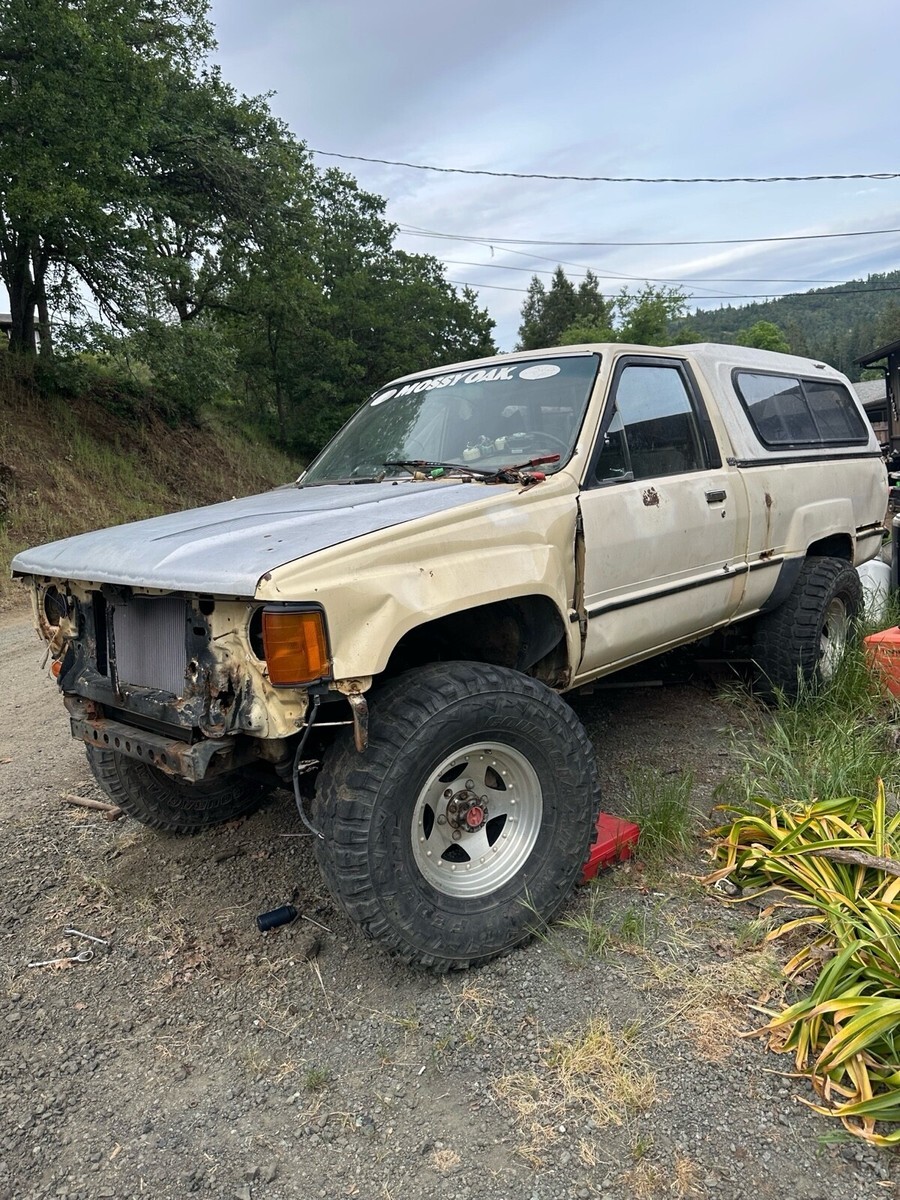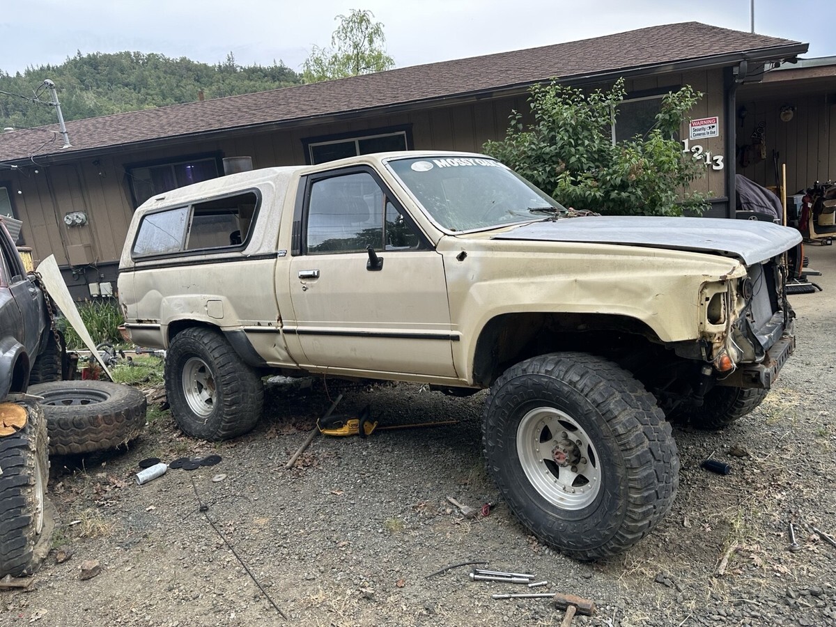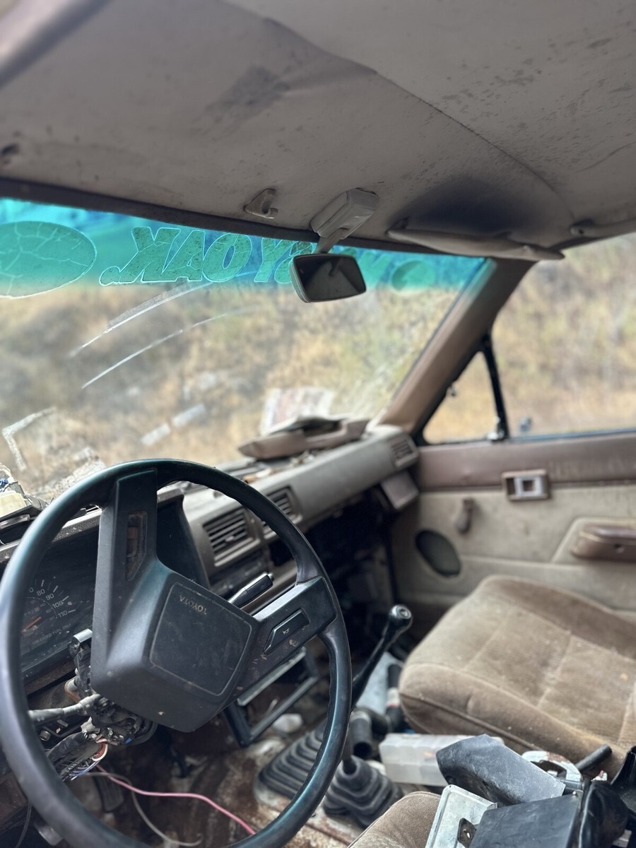 The 1986 Toyota Pickup SR5 is a classic truck with a beige/creme exterior and brown interior, featuring a manual transmission and 4WD drive type. This vehicle has a 2.4L engine with a mild performance cam, 86 - 110 kW (115.24 - 147.4 hp) of horsepower, and comes with features such as truck registration, AM/FM stereo, trailer hitch, cassette player, cloth seats, tilt steering wheel, power steering, and tow bar. With a 2-inch suspension lift and 1.5” ball joint spacers, this pickup is capable of achieving a fuel consumption rate of combined 16-22 mpg and has a partial service history available.
