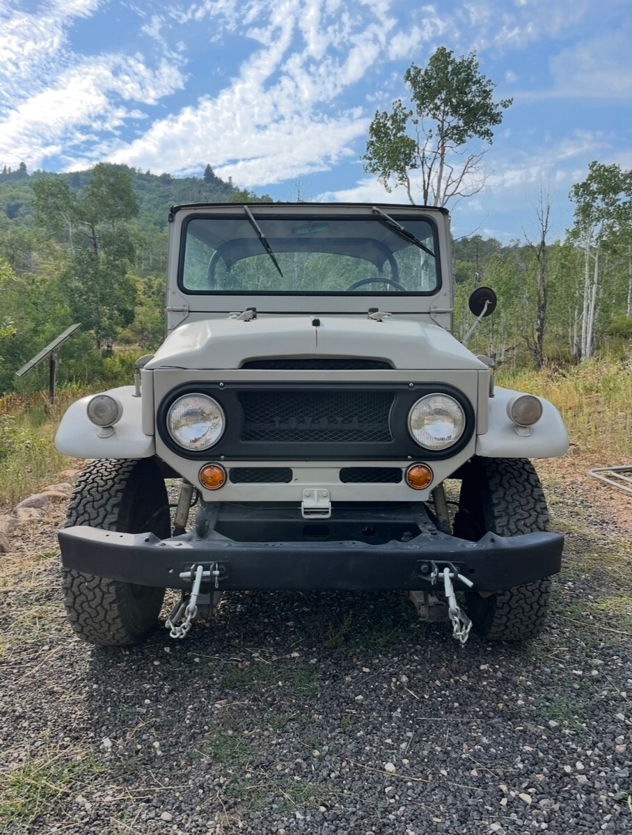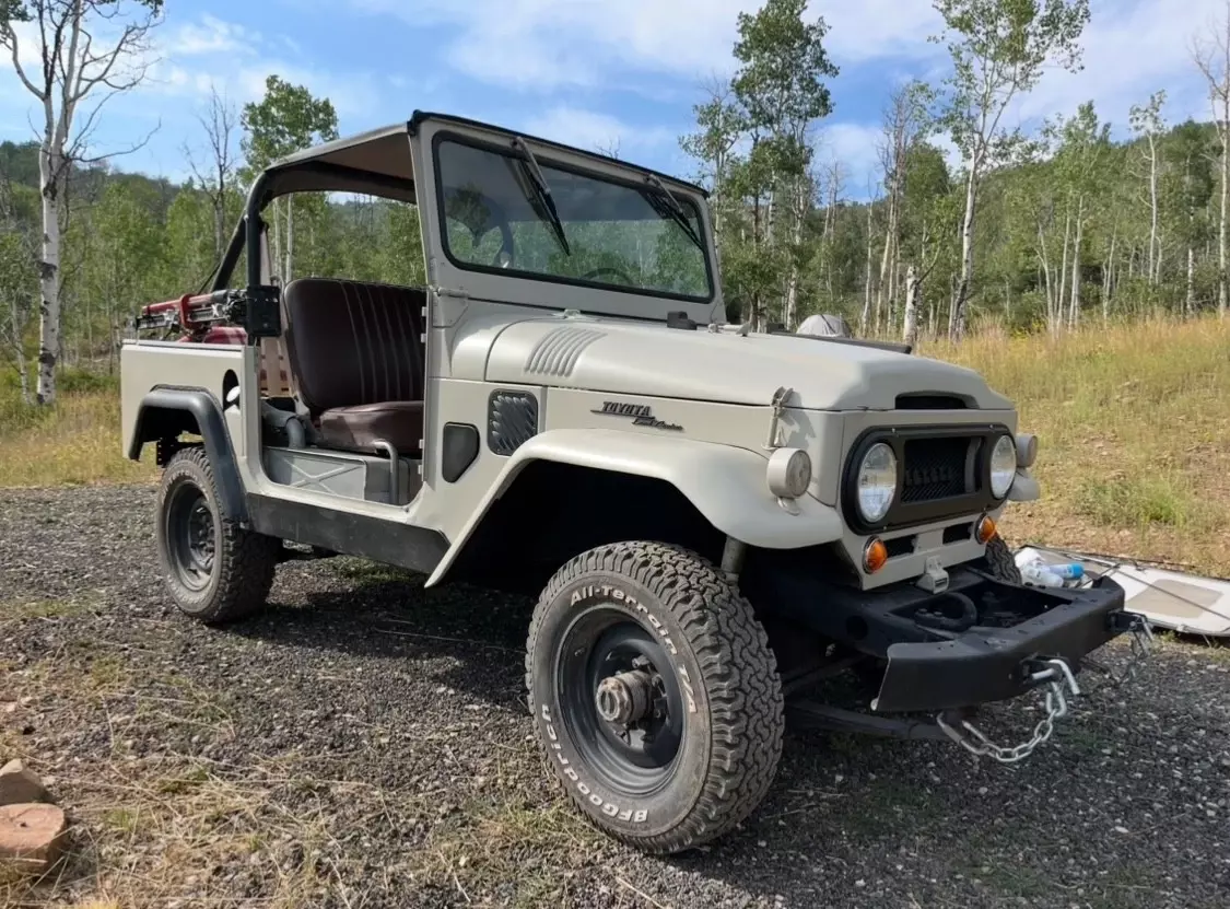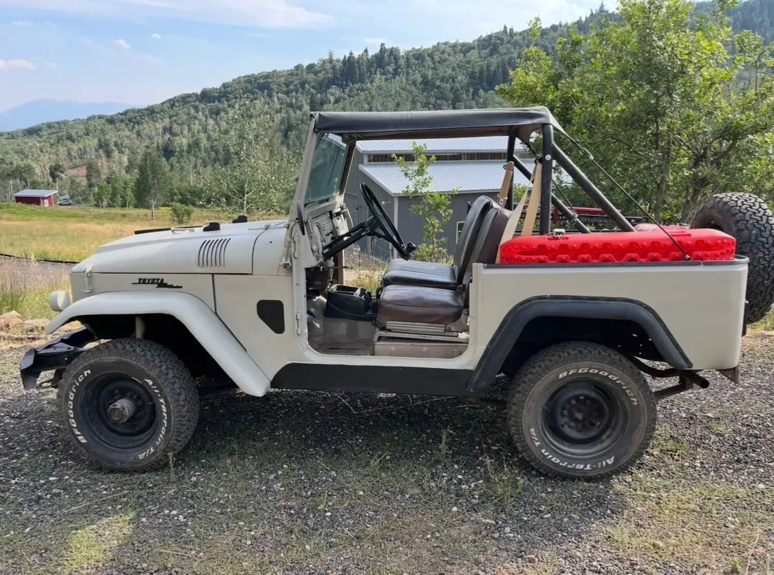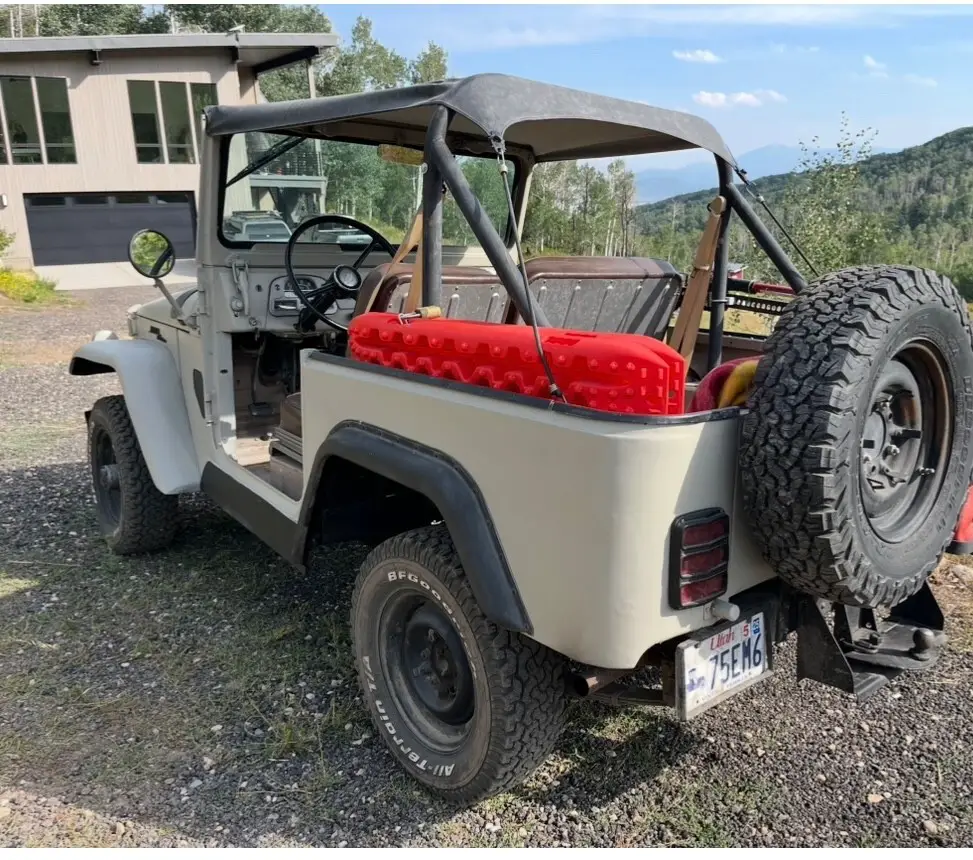1966 Toyota Land Cruiser with 2F engine and 3spd column shift transmission. Odometer reads 58,000 but actual mileage unknown. Comes with new 2 piece soft doors, full soft top and bikini top. Has tow bar for easy towing.