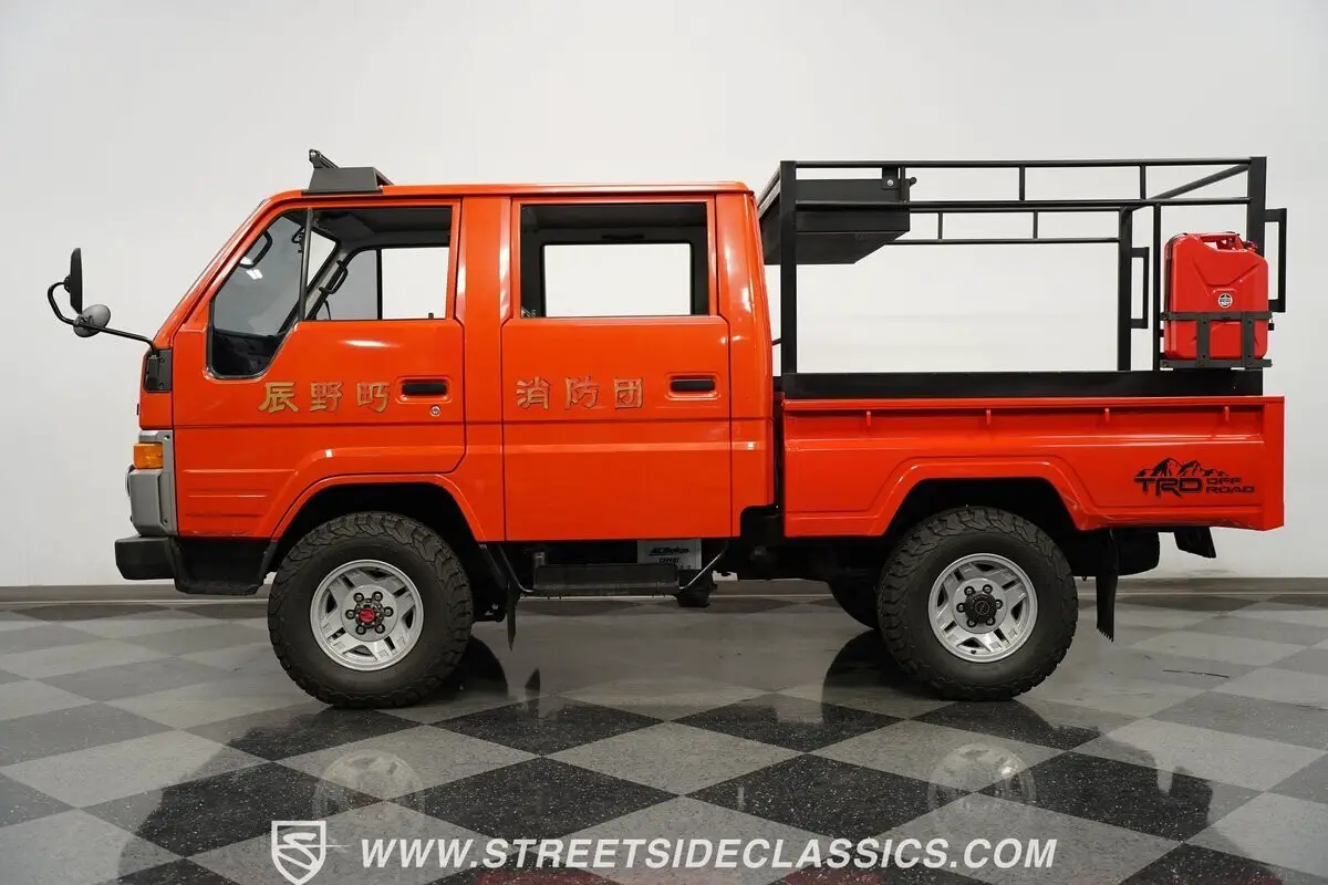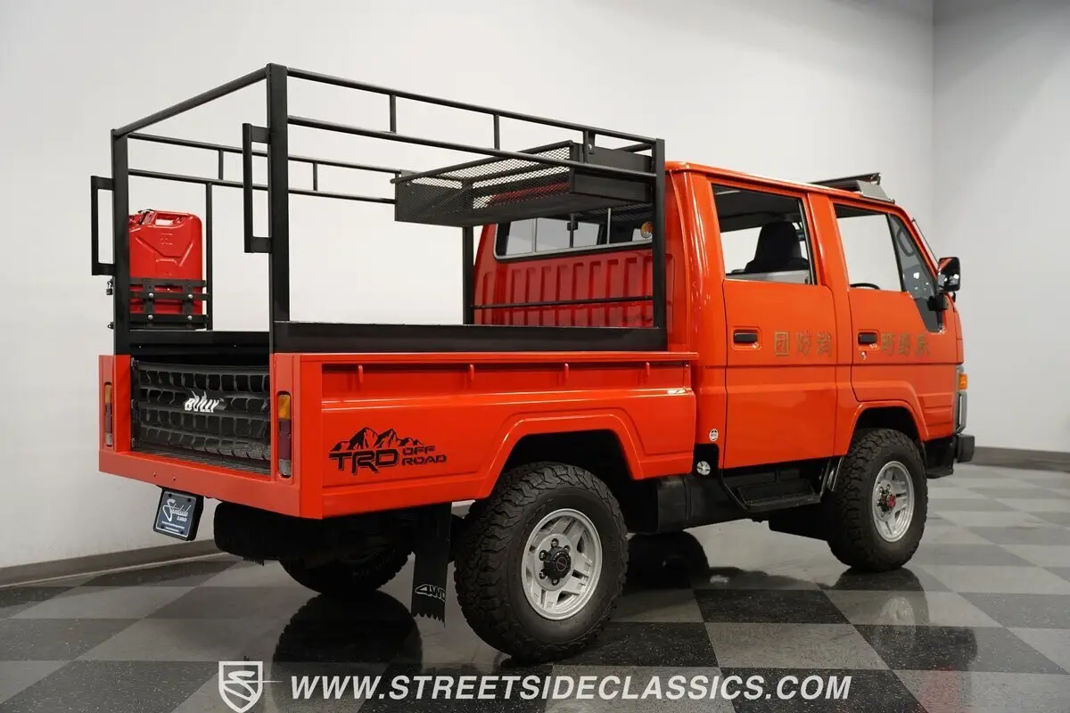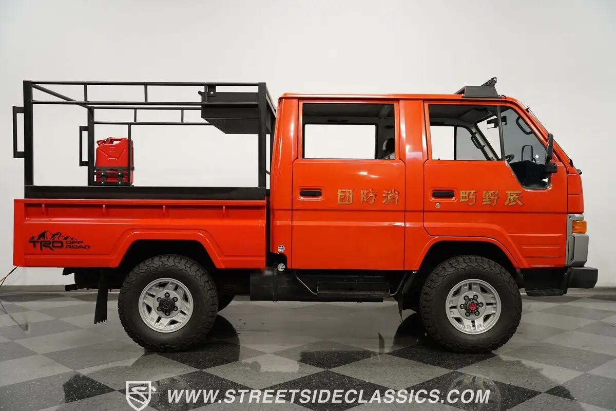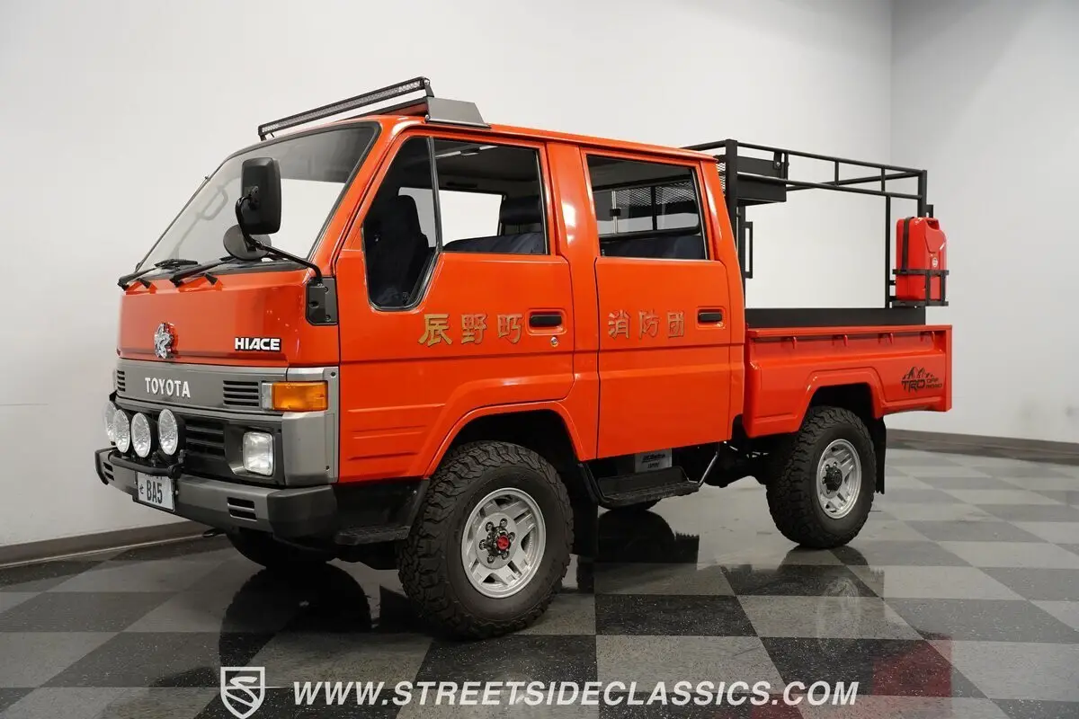 Originally part of Japan's fire service fleet, this 1988 Toyota HiAce Pickup 4x4 was repainted red for duty and still wears that identity proudly. The exterior includes a tubular bed rack with a mesh basket and jerrycan cage, a mesh tailgate, and a tool box mounted in the bed. Up front, four off-road lights are mounted to the gray-toned bumper, while a roof-mounted light bar keeps the trail lit. It sits on powder-coated silver 15" Toyota pickup wheels wrapped in fresh 30x9.5R15 BFGoodrich KO2 tires, giving it a confident stance.