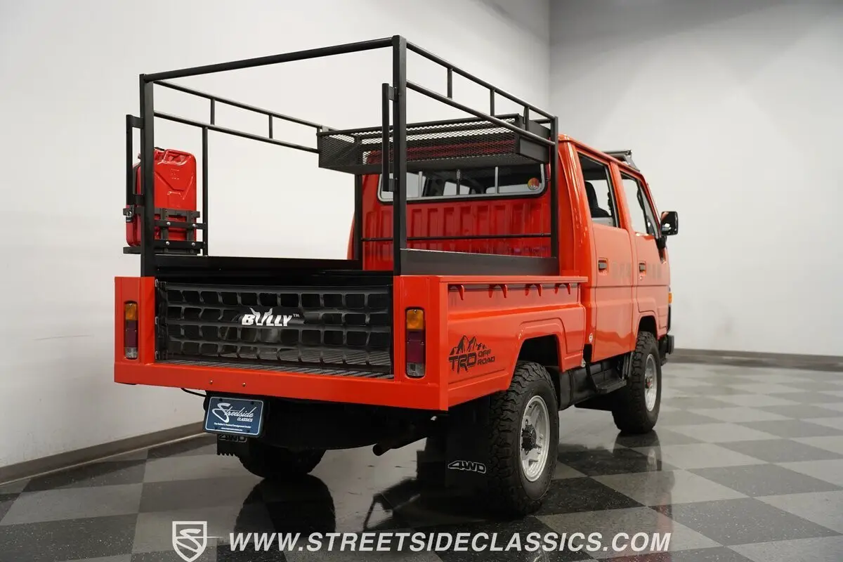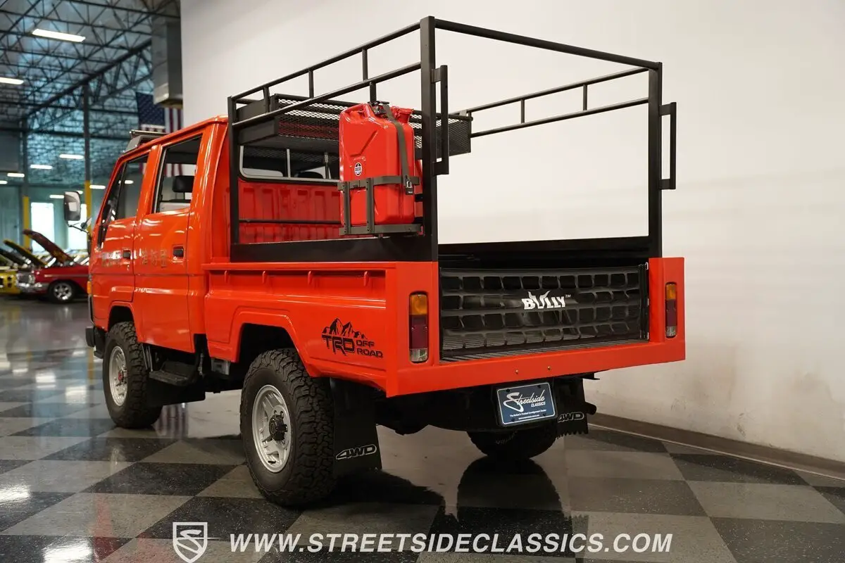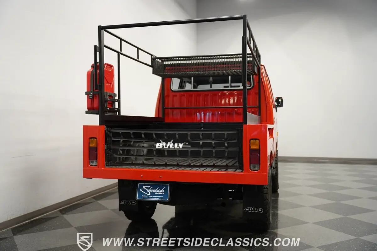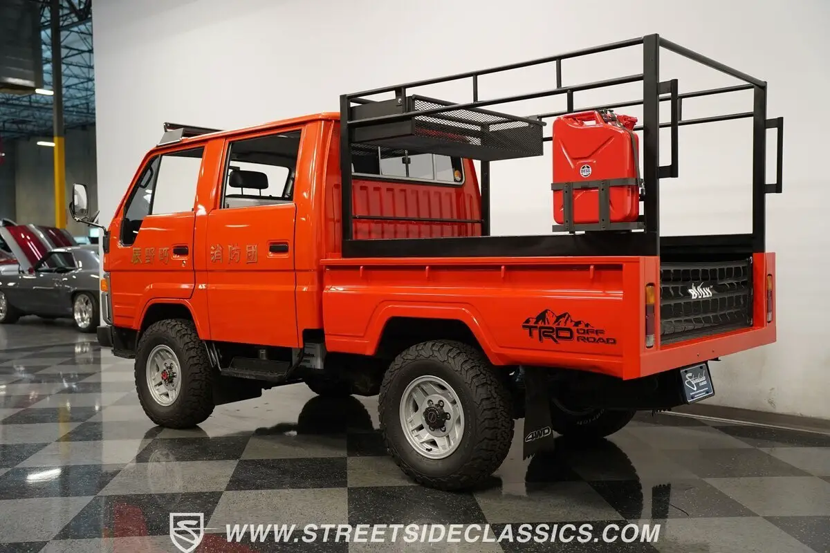 Originally part of Japan's fire service fleet, this 1988 Toyota HiAce Pickup 4x4 was repainted red for duty and still wears that identity proudly. The exterior includes a tubular bed rack with a mesh basket and jerrycan cage, a mesh tailgate, and a tool box mounted in the bed. Up front, four off-road lights are mounted to the gray-toned bumper, while a roof-mounted light bar keeps the trail lit. It sits on powder-coated silver 15" Toyota pickup wheels wrapped in fresh 30x9.5R15 BFGoodrich KO2 tires, giving it a confident stance.