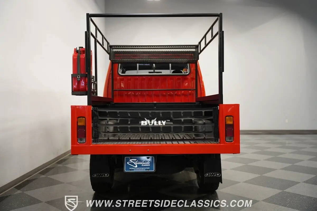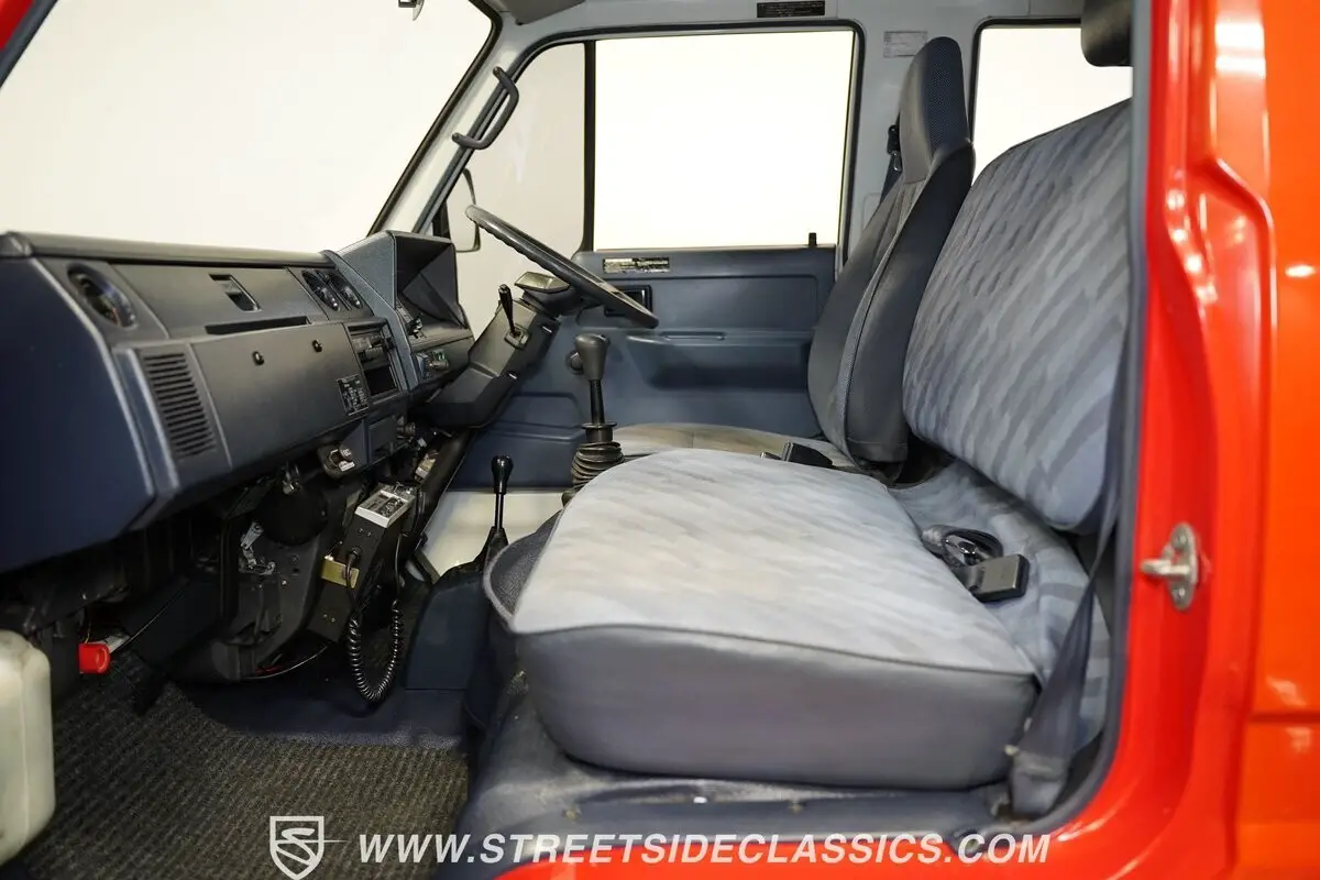 Inside, it's exactly what you'd want from a rig built to work. Blue cloth bench seating across the front row, a folding bench in the rear, and rubber flooring throughout keep it rugged and low maintenance. Auxiliary toggle switches control the lighting systems, while a CB radio with integrated PA brings a little personality. The original AM radio is still in place, and the right-hand drive layout gives it instant distinction. A floor shifter and power steering keep the control simple and direct.