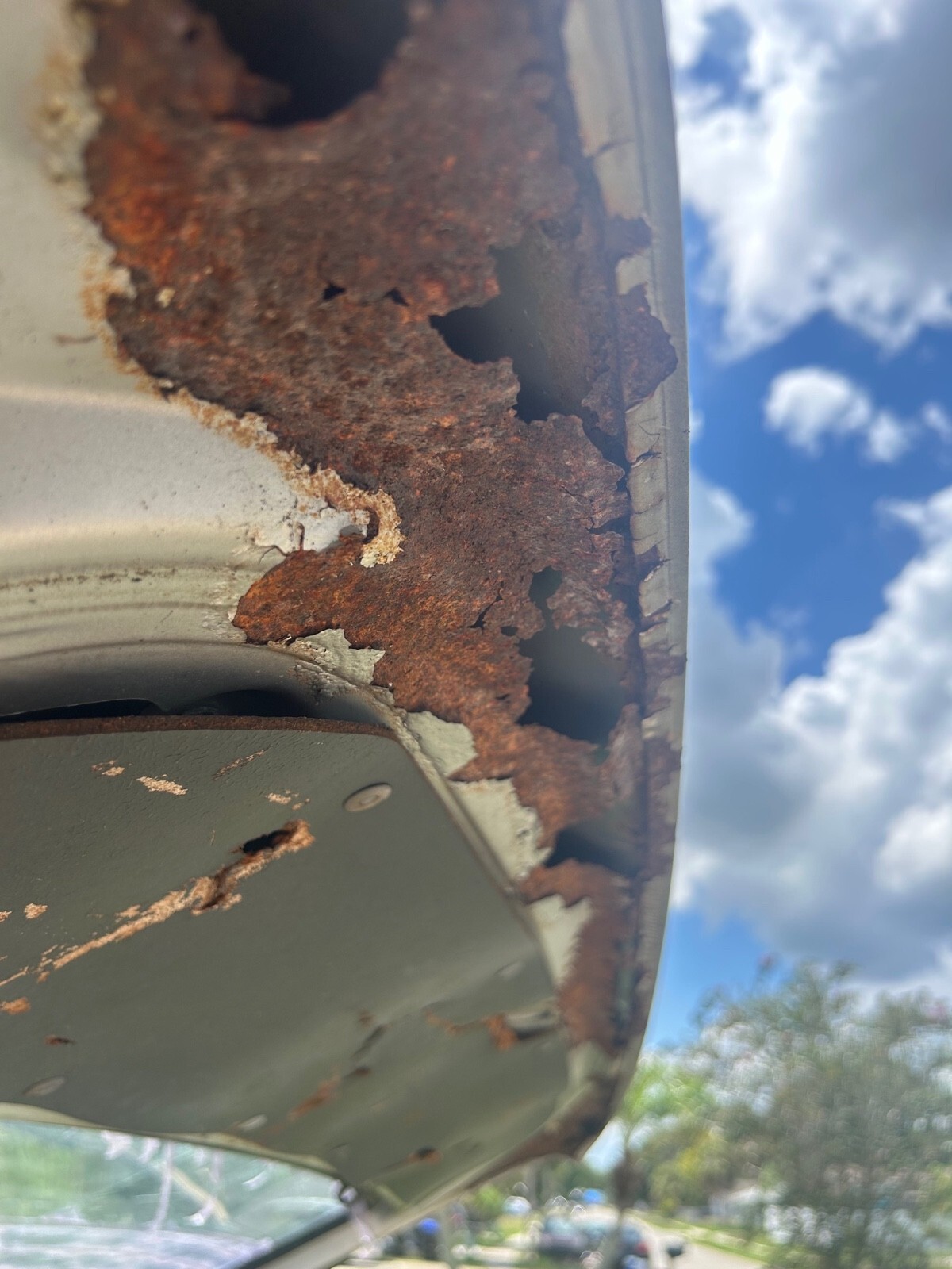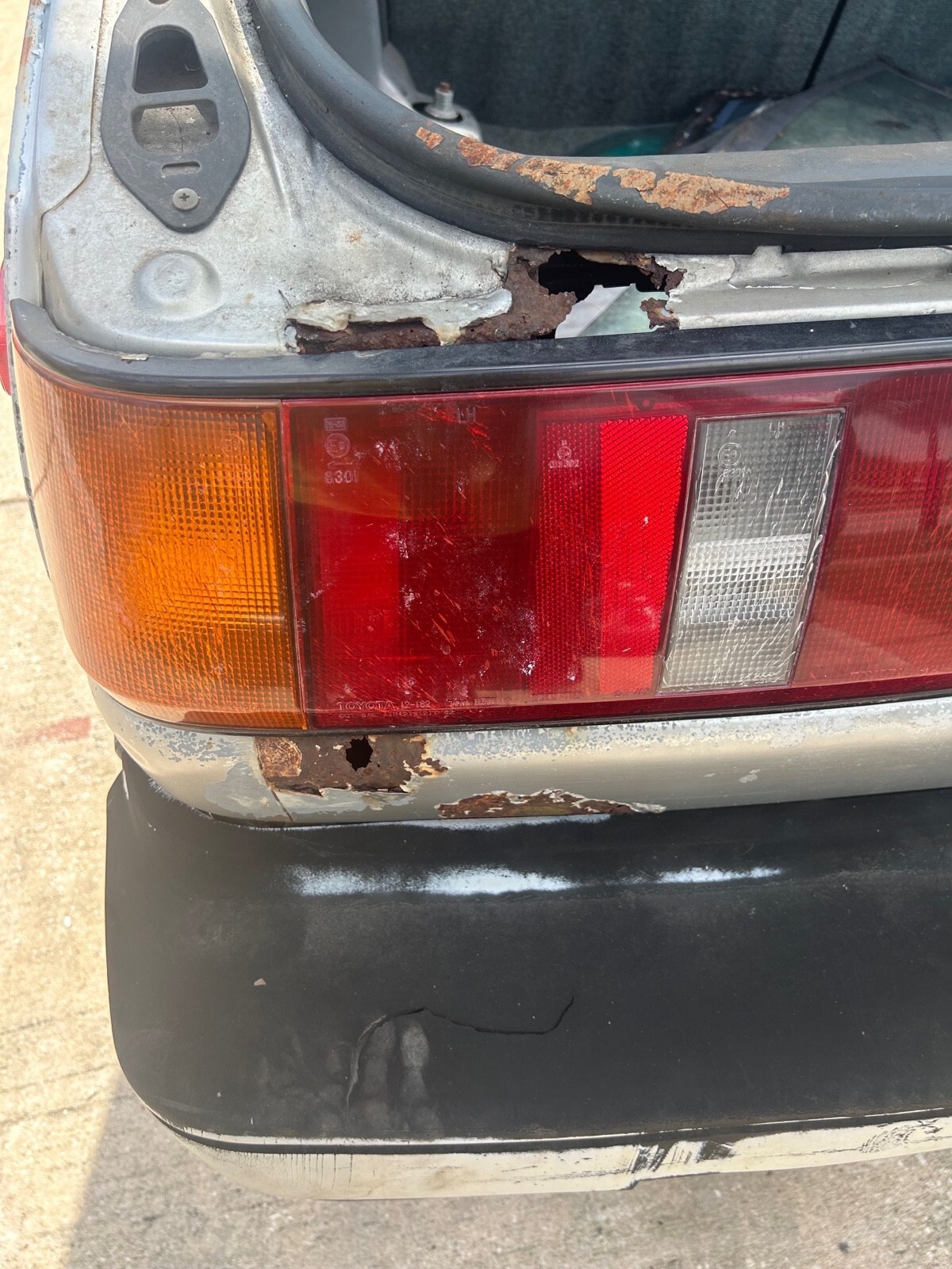 Back hatchback door has rust, tail light panel has patches of rust the rest of the car is great underneath is also great.
